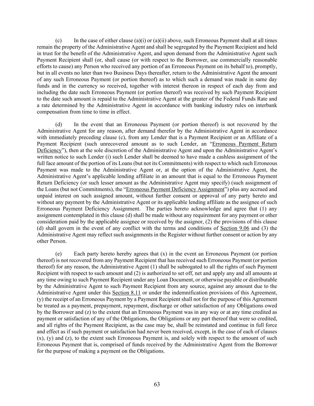 63 (c) In the case of either clause (a)(i) or (a)(ii) above, such Erroneous Payment shall at all times remain the property of the Administrative Agent and shall be segregated by the Payment Recipient and held in trust for the benefit of the Administrative Agent, and upon demand from the Administrative Agent such Payment Recipient shall (or, shall cause (or with respect to the Borrower, use commercially reasonable efforts to cause) any Person who received any portion of an Erroneous Payment on its behalf to), promptly, but in all events no later than two Business Days thereafter, return to the Administrative Agent the amount of any such Erroneous Payment (or portion thereof) as to which such a demand was made in same day funds and in the currency so received, together with interest thereon in respect of each day from and including the date such Erroneous Payment (or portion thereof) was received by such Payment Recipient to the date such amount is repaid to the Administrative Agent at the greater of the Federal Funds Rate and a rate determined by the Administrative Agent in accordance with banking industry rules on interbank compensation from time to time in effect. (d) In the event that an Erroneous Payment (or portion thereof) is not recovered by the Administrative Agent for any reason, after demand therefor by the Administrative Agent in accordance with immediately preceding clause (c), from any Lender that is a Payment Recipient or an Affiliate of a Payment Recipient (such unrecovered amount as to such Lender, an “Erroneous Payment Return Deficiency”), then at the sole discretion of the Administrative Agent and upon the Administrative Agent’s written notice to such Lender (i) such Lender shall be deemed to have made a cashless assignment of the full face amount of the portion of its Loans (but not its Commitments) with respect to which such Erroneous Payment was made to the Administrative Agent or, at the option of the Administrative Agent, the Administrative Agent’s applicable lending affiliate in an amount that is equal to the Erroneous Payment Return Deficiency (or such lesser amount as the Administrative Agent may specify) (such assignment of the Loans (but not Commitments), the “Erroneous Payment Deficiency Assignment”) plus any accrued and unpaid interest on such assigned amount, without further consent or approval of any party hereto and without any payment by the Administrative Agent or its applicable lending affiliate as the assignee of such Erroneous Payment Deficiency Assignment. The parties hereto acknowledge and agree that (1) any assignment contemplated in this clause (d) shall be made without any requirement for any payment or other consideration paid by the applicable assignee or received by the assignor, (2) the provisions of this clause (d) shall govern in the event of any conflict with the terms and conditions of Section 9.06 and (3) the Administrative Agent may reflect such assignments in the Register without further consent or action by any other Person. (e) Each party hereto hereby agrees that (x) in the event an Erroneous Payment (or portion thereof) is not recovered from any Payment Recipient that has received such Erroneous Payment (or portion thereof) for any reason, the Administrative Agent (1) shall be subrogated to all the rights of such Payment Recipient with respect to such amount and (2) is authorized to set off, net and apply any and all amounts at any time owing to such Payment Recipient under any Loan Document, or otherwise payable or distributable by the Administrative Agent to such Payment Recipient from any source, against any amount due to the Administrative Agent under this Section 8.11 or under the indemnification provisions of this Agreement, (y) the receipt of an Erroneous Payment by a Payment Recipient shall not for the purpose of this Agreement be treated as a payment, prepayment, repayment, discharge or other satisfaction of any Obligations owed by the Borrower and (z) to the extent that an Erroneous Payment was in any way or at any time credited as payment or satisfaction of any of the Obligations, the Obligations or any part thereof that were so credited, and all rights of the Payment Recipient, as the case may be, shall be reinstated and continue in full force and effect as if such payment or satisfaction had never been received, except, in the case of each of clauses (x), (y) and (z), to the extent such Erroneous Payment is, and solely with respect to the amount of such Erroneous Payment that is, comprised of funds received by the Administrative Agent from the Borrower for the purpose of making a payment on the Obligations.