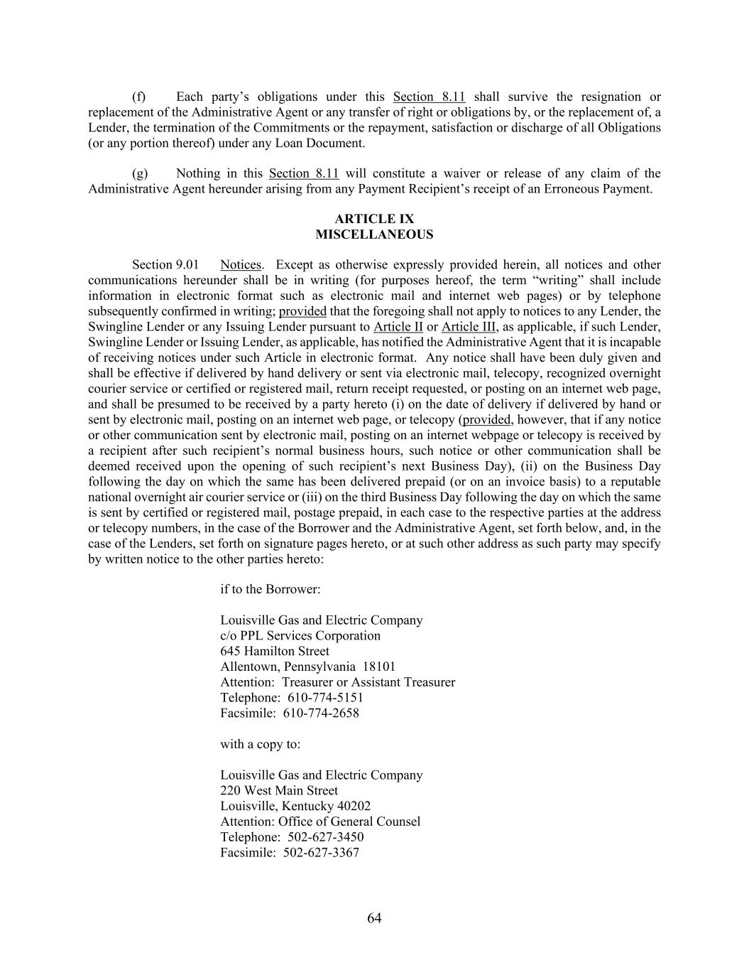 64 (f) Each party’s obligations under this Section 8.11 shall survive the resignation or replacement of the Administrative Agent or any transfer of right or obligations by, or the replacement of, a Lender, the termination of the Commitments or the repayment, satisfaction or discharge of all Obligations (or any portion thereof) under any Loan Document. (g) Nothing in this Section 8.11 will constitute a waiver or release of any claim of the Administrative Agent hereunder arising from any Payment Recipient’s receipt of an Erroneous Payment. ARTICLE IX MISCELLANEOUS Section 9.01 Notices. Except as otherwise expressly provided herein, all notices and other communications hereunder shall be in writing (for purposes hereof, the term “writing” shall include information in electronic format such as electronic mail and internet web pages) or by telephone subsequently confirmed in writing; provided that the foregoing shall not apply to notices to any Lender, the Swingline Lender or any Issuing Lender pursuant to Article II or Article III, as applicable, if such Lender, Swingline Lender or Issuing Lender, as applicable, has notified the Administrative Agent that it is incapable of receiving notices under such Article in electronic format. Any notice shall have been duly given and shall be effective if delivered by hand delivery or sent via electronic mail, telecopy, recognized overnight courier service or certified or registered mail, return receipt requested, or posting on an internet web page, and shall be presumed to be received by a party hereto (i) on the date of delivery if delivered by hand or sent by electronic mail, posting on an internet web page, or telecopy (provided, however, that if any notice or other communication sent by electronic mail, posting on an internet webpage or telecopy is received by a recipient after such recipient’s normal business hours, such notice or other communication shall be deemed received upon the opening of such recipient’s next Business Day), (ii) on the Business Day following the day on which the same has been delivered prepaid (or on an invoice basis) to a reputable national overnight air courier service or (iii) on the third Business Day following the day on which the same is sent by certified or registered mail, postage prepaid, in each case to the respective parties at the address or telecopy numbers, in the case of the Borrower and the Administrative Agent, set forth below, and, in the case of the Lenders, set forth on signature pages hereto, or at such other address as such party may specify by written notice to the other parties hereto: if to the Borrower: Louisville Gas and Electric Company c/o PPL Services Corporation 645 Hamilton Street Allentown, Pennsylvania 18101 Attention: Treasurer or Assistant Treasurer Telephone: 610-774-5151 Facsimile: 610-774-2658 with a copy to: Louisville Gas and Electric Company 220 West Main Street Louisville, Kentucky 40202 Attention: Office of General Counsel Telephone: 502-627-3450 Facsimile: 502-627-3367