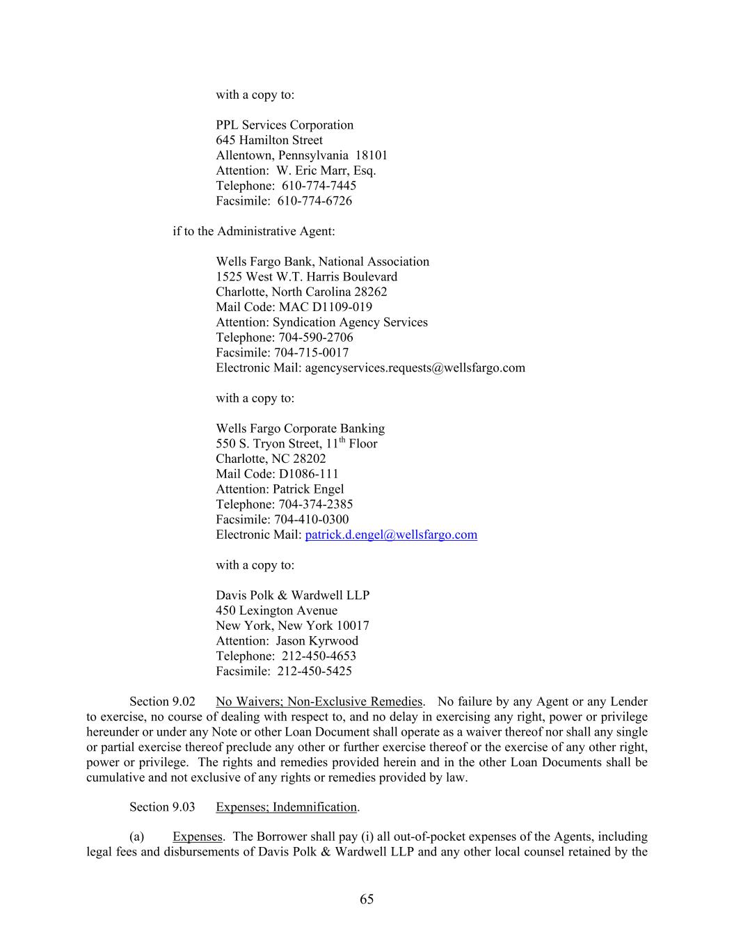 65 with a copy to: PPL Services Corporation 645 Hamilton Street Allentown, Pennsylvania 18101 Attention: W. Eric Marr, Esq. Telephone: 610-774-7445 Facsimile: 610-774-6726 if to the Administrative Agent: Wells Fargo Bank, National Association 1525 West W.T. Harris Boulevard Charlotte, North Carolina 28262 Mail Code: MAC D1109-019 Attention: Syndication Agency Services Telephone: 704-590-2706 Facsimile: 704-715-0017 Electronic Mail: agencyservices.requests@wellsfargo.com with a copy to: Wells Fargo Corporate Banking 550 S. Tryon Street, 11th Floor Charlotte, NC 28202 Mail Code: D1086-111 Attention: Patrick Engel Telephone: 704-374-2385 Facsimile: 704-410-0300 Electronic Mail: patrick.d.engel@wellsfargo.com with a copy to: Davis Polk & Wardwell LLP 450 Lexington Avenue New York, New York 10017 Attention: Jason Kyrwood Telephone: 212-450-4653 Facsimile: 212-450-5425 Section 9.02 No Waivers; Non-Exclusive Remedies. No failure by any Agent or any Lender to exercise, no course of dealing with respect to, and no delay in exercising any right, power or privilege hereunder or under any Note or other Loan Document shall operate as a waiver thereof nor shall any single or partial exercise thereof preclude any other or further exercise thereof or the exercise of any other right, power or privilege. The rights and remedies provided herein and in the other Loan Documents shall be cumulative and not exclusive of any rights or remedies provided by law. Section 9.03 Expenses; Indemnification. (a) Expenses. The Borrower shall pay (i) all out-of-pocket expenses of the Agents, including legal fees and disbursements of Davis Polk & Wardwell LLP and any other local counsel retained by the