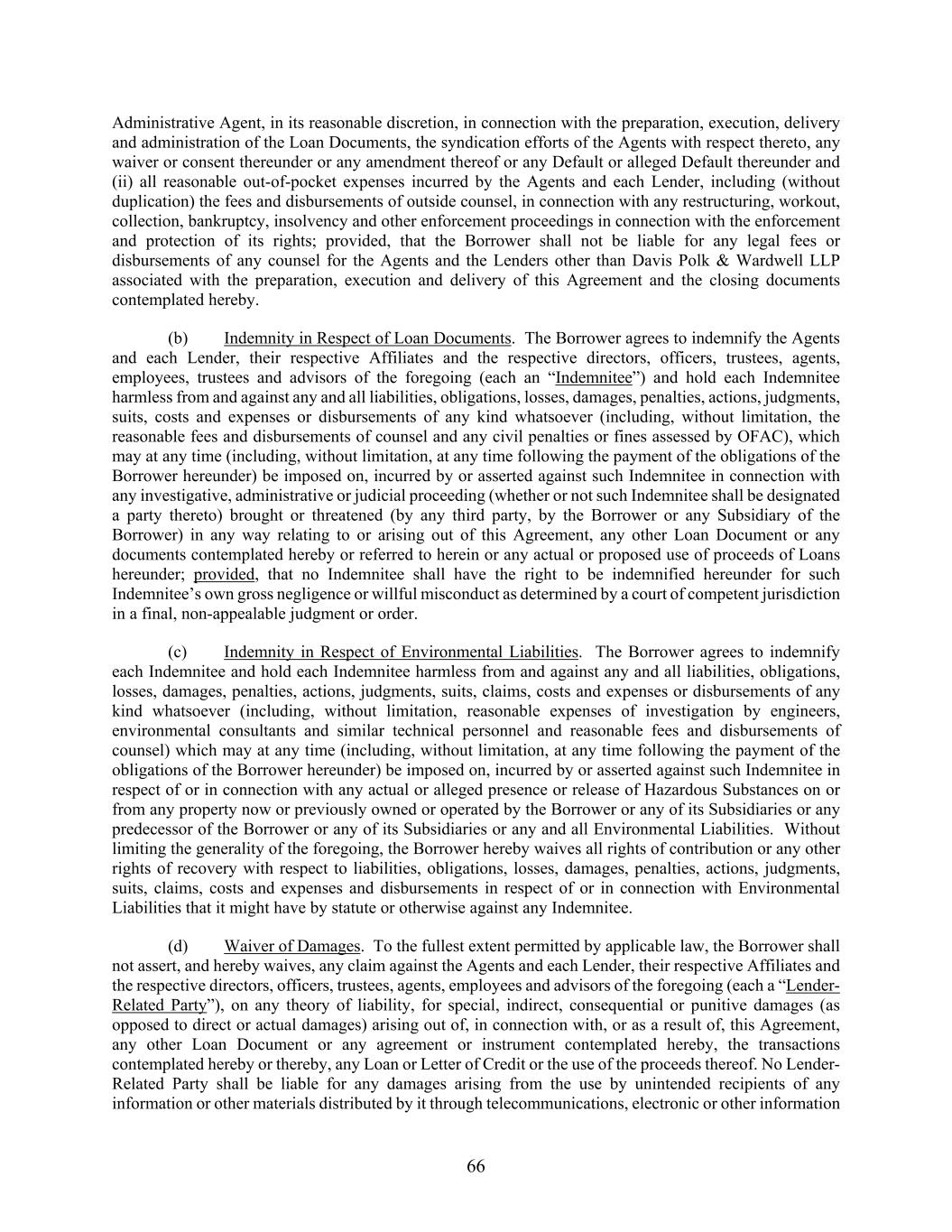 66 Administrative Agent, in its reasonable discretion, in connection with the preparation, execution, delivery and administration of the Loan Documents, the syndication efforts of the Agents with respect thereto, any waiver or consent thereunder or any amendment thereof or any Default or alleged Default thereunder and (ii) all reasonable out-of-pocket expenses incurred by the Agents and each Lender, including (without duplication) the fees and disbursements of outside counsel, in connection with any restructuring, workout, collection, bankruptcy, insolvency and other enforcement proceedings in connection with the enforcement and protection of its rights; provided, that the Borrower shall not be liable for any legal fees or disbursements of any counsel for the Agents and the Lenders other than Davis Polk & Wardwell LLP associated with the preparation, execution and delivery of this Agreement and the closing documents contemplated hereby. (b) Indemnity in Respect of Loan Documents. The Borrower agrees to indemnify the Agents and each Lender, their respective Affiliates and the respective directors, officers, trustees, agents, employees, trustees and advisors of the foregoing (each an “Indemnitee”) and hold each Indemnitee harmless from and against any and all liabilities, obligations, losses, damages, penalties, actions, judgments, suits, costs and expenses or disbursements of any kind whatsoever (including, without limitation, the reasonable fees and disbursements of counsel and any civil penalties or fines assessed by OFAC), which may at any time (including, without limitation, at any time following the payment of the obligations of the Borrower hereunder) be imposed on, incurred by or asserted against such Indemnitee in connection with any investigative, administrative or judicial proceeding (whether or not such Indemnitee shall be designated a party thereto) brought or threatened (by any third party, by the Borrower or any Subsidiary of the Borrower) in any way relating to or arising out of this Agreement, any other Loan Document or any documents contemplated hereby or referred to herein or any actual or proposed use of proceeds of Loans hereunder; provided, that no Indemnitee shall have the right to be indemnified hereunder for such Indemnitee’s own gross negligence or willful misconduct as determined by a court of competent jurisdiction in a final, non-appealable judgment or order. (c) Indemnity in Respect of Environmental Liabilities. The Borrower agrees to indemnify each Indemnitee and hold each Indemnitee harmless from and against any and all liabilities, obligations, losses, damages, penalties, actions, judgments, suits, claims, costs and expenses or disbursements of any kind whatsoever (including, without limitation, reasonable expenses of investigation by engineers, environmental consultants and similar technical personnel and reasonable fees and disbursements of counsel) which may at any time (including, without limitation, at any time following the payment of the obligations of the Borrower hereunder) be imposed on, incurred by or asserted against such Indemnitee in respect of or in connection with any actual or alleged presence or release of Hazardous Substances on or from any property now or previously owned or operated by the Borrower or any of its Subsidiaries or any predecessor of the Borrower or any of its Subsidiaries or any and all Environmental Liabilities. Without limiting the generality of the foregoing, the Borrower hereby waives all rights of contribution or any other rights of recovery with respect to liabilities, obligations, losses, damages, penalties, actions, judgments, suits, claims, costs and expenses and disbursements in respect of or in connection with Environmental Liabilities that it might have by statute or otherwise against any Indemnitee. (d) Waiver of Damages. To the fullest extent permitted by applicable law, the Borrower shall not assert, and hereby waives, any claim against the Agents and each Lender, their respective Affiliates and the respective directors, officers, trustees, agents, employees and advisors of the foregoing (each a “Lender- Related Party”), on any theory of liability, for special, indirect, consequential or punitive damages (as opposed to direct or actual damages) arising out of, in connection with, or as a result of, this Agreement, any other Loan Document or any agreement or instrument contemplated hereby, the transactions contemplated hereby or thereby, any Loan or Letter of Credit or the use of the proceeds thereof. No Lender- Related Party shall be liable for any damages arising from the use by unintended recipients of any information or other materials distributed by it through telecommunications, electronic or other information