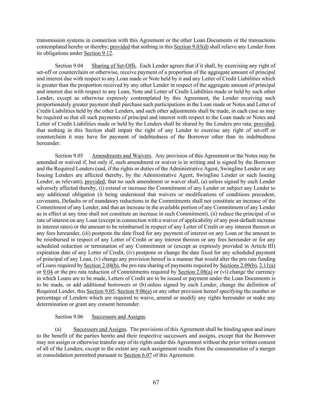67 transmission systems in connection with this Agreement or the other Loan Documents or the transactions contemplated hereby or thereby; provided that nothing in this Section 9.03(d) shall relieve any Lender from its obligations under Section 9.12. Section 9.04 Sharing of Set-Offs. Each Lender agrees that if it shall, by exercising any right of set-off or counterclaim or otherwise, receive payment of a proportion of the aggregate amount of principal and interest due with respect to any Loan made or Note held by it and any Letter of Credit Liabilities which is greater than the proportion received by any other Lender in respect of the aggregate amount of principal and interest due with respect to any Loan, Note and Letter of Credit Liabilities made or held by such other Lender, except as otherwise expressly contemplated by this Agreement, the Lender receiving such proportionately greater payment shall purchase such participations in the Loan made or Notes and Letter of Credit Liabilities held by the other Lenders, and such other adjustments shall be made, in each case as may be required so that all such payments of principal and interest with respect to the Loan made or Notes and Letter of Credit Liabilities made or held by the Lenders shall be shared by the Lenders pro rata; provided, that nothing in this Section shall impair the right of any Lender to exercise any right of set-off or counterclaim it may have for payment of indebtedness of the Borrower other than its indebtedness hereunder. Section 9.05 Amendments and Waivers. Any provision of this Agreement or the Notes may be amended or waived if, but only if, such amendment or waiver is in writing and is signed by the Borrower and the Required Lenders (and, if the rights or duties of the Administrative Agent, Swingline Lender or any Issuing Lenders are affected thereby, by the Administrative Agent, Swingline Lender or such Issuing Lender, as relevant); provided, that no such amendment or waiver shall, (a) unless signed by each Lender adversely affected thereby, (i) extend or increase the Commitment of any Lender or subject any Lender to any additional obligation (it being understood that waivers or modifications of conditions precedent, covenants, Defaults or of mandatory reductions in the Commitments shall not constitute an increase of the Commitment of any Lender, and that an increase in the available portion of any Commitment of any Lender as in effect at any time shall not constitute an increase in such Commitment), (ii) reduce the principal of or rate of interest on any Loan (except in connection with a waiver of applicability of any post-default increase in interest rates) or the amount to be reimbursed in respect of any Letter of Credit or any interest thereon or any fees hereunder, (iii) postpone the date fixed for any payment of interest on any Loan or the amount to be reimbursed in respect of any Letter of Credit or any interest thereon or any fees hereunder or for any scheduled reduction or termination of any Commitment or (except as expressly provided in Article III) expiration date of any Letter of Credit, (iv) postpone or change the date fixed for any scheduled payment of principal of any Loan, (v) change any provision hereof in a manner that would alter the pro rata funding of Loans required by Section 2.04(b), the pro rata sharing of payments required by Sections 2.09(b), 2.11(a) or 9.04 or the pro rata reduction of Commitments required by Section 2.08(a) or (vi) change the currency in which Loans are to be made, Letters of Credit are to be issued or payment under the Loan Documents is to be made, or add additional borrowers or (b) unless signed by each Lender, change the definition of Required Lender, this Section 9.05, Section 9.06(a) or any other provision hereof specifying the number or percentage of Lenders which are required to waive, amend or modify any rights hereunder or make any determination or grant any consent hereunder. Section 9.06 Successors and Assigns. (a) Successors and Assigns. The provisions of this Agreement shall be binding upon and inure to the benefit of the parties hereto and their respective successors and assigns, except that the Borrower may not assign or otherwise transfer any of its rights under this Agreement without the prior written consent of all of the Lenders, except to the extent any such assignment results from the consummation of a merger or consolidation permitted pursuant to Section 6.07 of this Agreement.