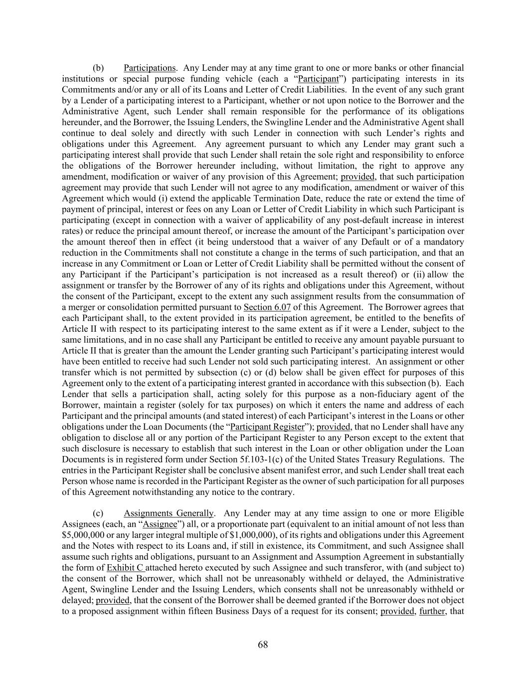 68 (b) Participations. Any Lender may at any time grant to one or more banks or other financial institutions or special purpose funding vehicle (each a “Participant”) participating interests in its Commitments and/or any or all of its Loans and Letter of Credit Liabilities. In the event of any such grant by a Lender of a participating interest to a Participant, whether or not upon notice to the Borrower and the Administrative Agent, such Lender shall remain responsible for the performance of its obligations hereunder, and the Borrower, the Issuing Lenders, the Swingline Lender and the Administrative Agent shall continue to deal solely and directly with such Lender in connection with such Lender’s rights and obligations under this Agreement. Any agreement pursuant to which any Lender may grant such a participating interest shall provide that such Lender shall retain the sole right and responsibility to enforce the obligations of the Borrower hereunder including, without limitation, the right to approve any amendment, modification or waiver of any provision of this Agreement; provided, that such participation agreement may provide that such Lender will not agree to any modification, amendment or waiver of this Agreement which would (i) extend the applicable Termination Date, reduce the rate or extend the time of payment of principal, interest or fees on any Loan or Letter of Credit Liability in which such Participant is participating (except in connection with a waiver of applicability of any post-default increase in interest rates) or reduce the principal amount thereof, or increase the amount of the Participant’s participation over the amount thereof then in effect (it being understood that a waiver of any Default or of a mandatory reduction in the Commitments shall not constitute a change in the terms of such participation, and that an increase in any Commitment or Loan or Letter of Credit Liability shall be permitted without the consent of any Participant if the Participant’s participation is not increased as a result thereof) or (ii) allow the assignment or transfer by the Borrower of any of its rights and obligations under this Agreement, without the consent of the Participant, except to the extent any such assignment results from the consummation of a merger or consolidation permitted pursuant to Section 6.07 of this Agreement. The Borrower agrees that each Participant shall, to the extent provided in its participation agreement, be entitled to the benefits of Article II with respect to its participating interest to the same extent as if it were a Lender, subject to the same limitations, and in no case shall any Participant be entitled to receive any amount payable pursuant to Article II that is greater than the amount the Lender granting such Participant’s participating interest would have been entitled to receive had such Lender not sold such participating interest. An assignment or other transfer which is not permitted by subsection (c) or (d) below shall be given effect for purposes of this Agreement only to the extent of a participating interest granted in accordance with this subsection (b). Each Lender that sells a participation shall, acting solely for this purpose as a non-fiduciary agent of the Borrower, maintain a register (solely for tax purposes) on which it enters the name and address of each Participant and the principal amounts (and stated interest) of each Participant’s interest in the Loans or other obligations under the Loan Documents (the “Participant Register”); provided, that no Lender shall have any obligation to disclose all or any portion of the Participant Register to any Person except to the extent that such disclosure is necessary to establish that such interest in the Loan or other obligation under the Loan Documents is in registered form under Section 5f.103-1(c) of the United States Treasury Regulations. The entries in the Participant Register shall be conclusive absent manifest error, and such Lender shall treat each Person whose name is recorded in the Participant Register as the owner of such participation for all purposes of this Agreement notwithstanding any notice to the contrary. (c) Assignments Generally. Any Lender may at any time assign to one or more Eligible Assignees (each, an “Assignee”) all, or a proportionate part (equivalent to an initial amount of not less than $5,000,000 or any larger integral multiple of $1,000,000), of its rights and obligations under this Agreement and the Notes with respect to its Loans and, if still in existence, its Commitment, and such Assignee shall assume such rights and obligations, pursuant to an Assignment and Assumption Agreement in substantially the form of Exhibit C attached hereto executed by such Assignee and such transferor, with (and subject to) the consent of the Borrower, which shall not be unreasonably withheld or delayed, the Administrative Agent, Swingline Lender and the Issuing Lenders, which consents shall not be unreasonably withheld or delayed; provided, that the consent of the Borrower shall be deemed granted if the Borrower does not object to a proposed assignment within fifteen Business Days of a request for its consent; provided, further, that