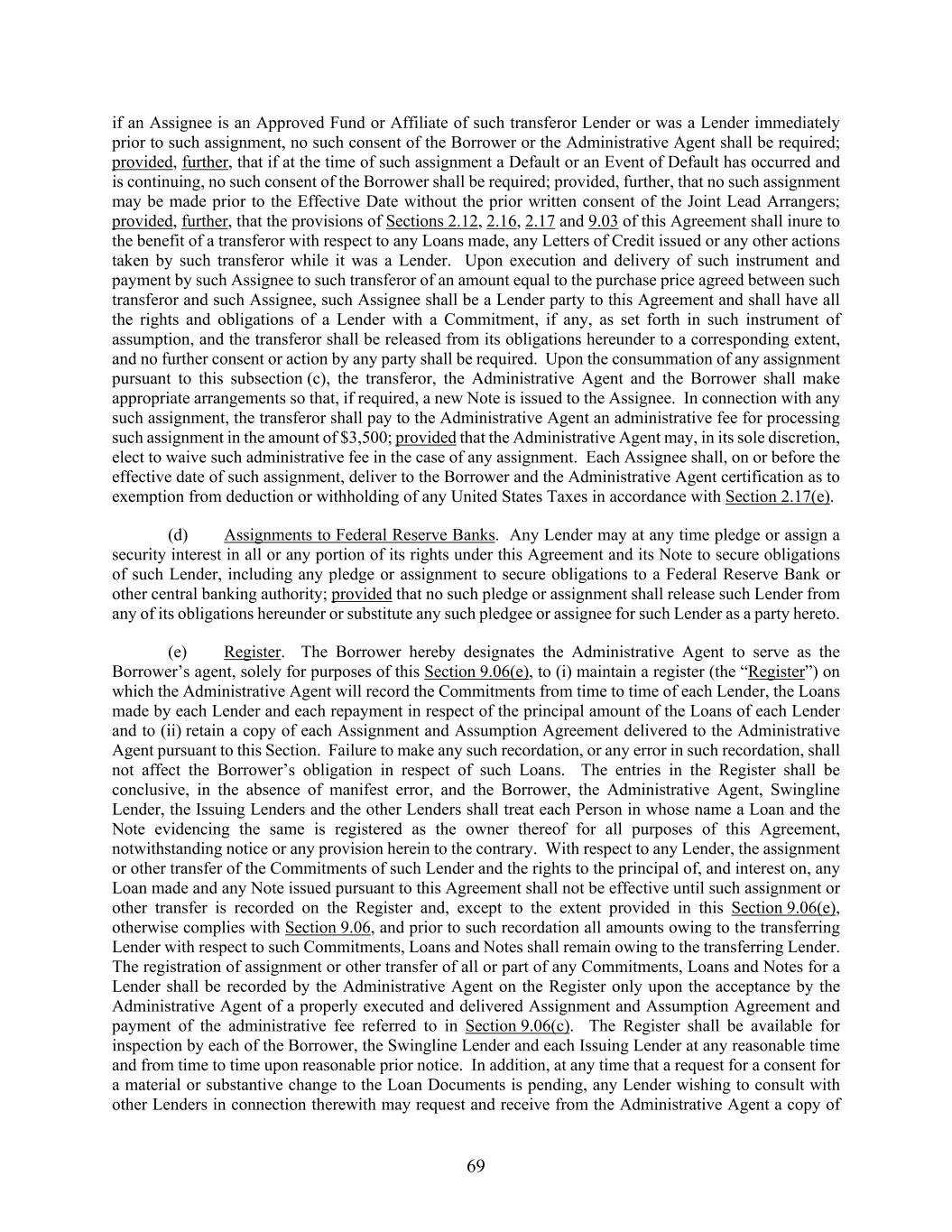 69 if an Assignee is an Approved Fund or Affiliate of such transferor Lender or was a Lender immediately prior to such assignment, no such consent of the Borrower or the Administrative Agent shall be required; provided, further, that if at the time of such assignment a Default or an Event of Default has occurred and is continuing, no such consent of the Borrower shall be required; provided, further, that no such assignment may be made prior to the Effective Date without the prior written consent of the Joint Lead Arrangers; provided, further, that the provisions of Sections 2.12, 2.16, 2.17 and 9.03 of this Agreement shall inure to the benefit of a transferor with respect to any Loans made, any Letters of Credit issued or any other actions taken by such transferor while it was a Lender. Upon execution and delivery of such instrument and payment by such Assignee to such transferor of an amount equal to the purchase price agreed between such transferor and such Assignee, such Assignee shall be a Lender party to this Agreement and shall have all the rights and obligations of a Lender with a Commitment, if any, as set forth in such instrument of assumption, and the transferor shall be released from its obligations hereunder to a corresponding extent, and no further consent or action by any party shall be required. Upon the consummation of any assignment pursuant to this subsection (c), the transferor, the Administrative Agent and the Borrower shall make appropriate arrangements so that, if required, a new Note is issued to the Assignee. In connection with any such assignment, the transferor shall pay to the Administrative Agent an administrative fee for processing such assignment in the amount of $3,500; provided that the Administrative Agent may, in its sole discretion, elect to waive such administrative fee in the case of any assignment. Each Assignee shall, on or before the effective date of such assignment, deliver to the Borrower and the Administrative Agent certification as to exemption from deduction or withholding of any United States Taxes in accordance with Section 2.17(e). (d) Assignments to Federal Reserve Banks. Any Lender may at any time pledge or assign a security interest in all or any portion of its rights under this Agreement and its Note to secure obligations of such Lender, including any pledge or assignment to secure obligations to a Federal Reserve Bank or other central banking authority; provided that no such pledge or assignment shall release such Lender from any of its obligations hereunder or substitute any such pledgee or assignee for such Lender as a party hereto. (e) Register. The Borrower hereby designates the Administrative Agent to serve as the Borrower’s agent, solely for purposes of this Section 9.06(e), to (i) maintain a register (the “Register”) on which the Administrative Agent will record the Commitments from time to time of each Lender, the Loans made by each Lender and each repayment in respect of the principal amount of the Loans of each Lender and to (ii) retain a copy of each Assignment and Assumption Agreement delivered to the Administrative Agent pursuant to this Section. Failure to make any such recordation, or any error in such recordation, shall not affect the Borrower’s obligation in respect of such Loans. The entries in the Register shall be conclusive, in the absence of manifest error, and the Borrower, the Administrative Agent, Swingline Lender, the Issuing Lenders and the other Lenders shall treat each Person in whose name a Loan and the Note evidencing the same is registered as the owner thereof for all purposes of this Agreement, notwithstanding notice or any provision herein to the contrary. With respect to any Lender, the assignment or other transfer of the Commitments of such Lender and the rights to the principal of, and interest on, any Loan made and any Note issued pursuant to this Agreement shall not be effective until such assignment or other transfer is recorded on the Register and, except to the extent provided in this Section 9.06(e), otherwise complies with Section 9.06, and prior to such recordation all amounts owing to the transferring Lender with respect to such Commitments, Loans and Notes shall remain owing to the transferring Lender. The registration of assignment or other transfer of all or part of any Commitments, Loans and Notes for a Lender shall be recorded by the Administrative Agent on the Register only upon the acceptance by the Administrative Agent of a properly executed and delivered Assignment and Assumption Agreement and payment of the administrative fee referred to in Section 9.06(c). The Register shall be available for inspection by each of the Borrower, the Swingline Lender and each Issuing Lender at any reasonable time and from time to time upon reasonable prior notice. In addition, at any time that a request for a consent for a material or substantive change to the Loan Documents is pending, any Lender wishing to consult with other Lenders in connection therewith may request and receive from the Administrative Agent a copy of