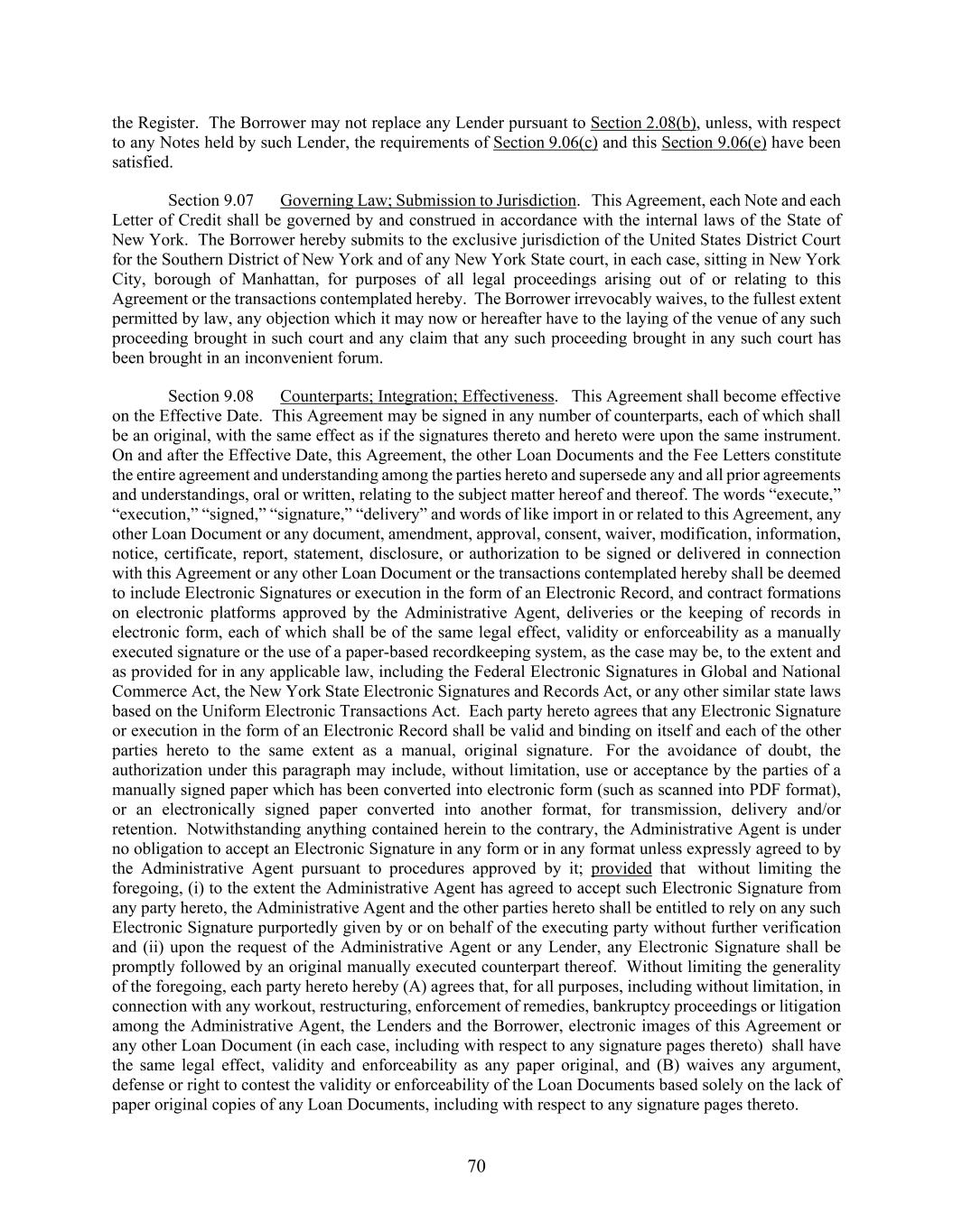 70 the Register. The Borrower may not replace any Lender pursuant to Section 2.08(b), unless, with respect to any Notes held by such Lender, the requirements of Section 9.06(c) and this Section 9.06(e) have been satisfied. Section 9.07 Governing Law; Submission to Jurisdiction. This Agreement, each Note and each Letter of Credit shall be governed by and construed in accordance with the internal laws of the State of New York. The Borrower hereby submits to the exclusive jurisdiction of the United States District Court for the Southern District of New York and of any New York State court, in each case, sitting in New York City, borough of Manhattan, for purposes of all legal proceedings arising out of or relating to this Agreement or the transactions contemplated hereby. The Borrower irrevocably waives, to the fullest extent permitted by law, any objection which it may now or hereafter have to the laying of the venue of any such proceeding brought in such court and any claim that any such proceeding brought in any such court has been brought in an inconvenient forum. Section 9.08 Counterparts; Integration; Effectiveness. This Agreement shall become effective on the Effective Date. This Agreement may be signed in any number of counterparts, each of which shall be an original, with the same effect as if the signatures thereto and hereto were upon the same instrument. On and after the Effective Date, this Agreement, the other Loan Documents and the Fee Letters constitute the entire agreement and understanding among the parties hereto and supersede any and all prior agreements and understandings, oral or written, relating to the subject matter hereof and thereof. The words “execute,” “execution,” “signed,” “signature,” “delivery” and words of like import in or related to this Agreement, any other Loan Document or any document, amendment, approval, consent, waiver, modification, information, notice, certificate, report, statement, disclosure, or authorization to be signed or delivered in connection with this Agreement or any other Loan Document or the transactions contemplated hereby shall be deemed to include Electronic Signatures or execution in the form of an Electronic Record, and contract formations on electronic platforms approved by the Administrative Agent, deliveries or the keeping of records in electronic form, each of which shall be of the same legal effect, validity or enforceability as a manually executed signature or the use of a paper-based recordkeeping system, as the case may be, to the extent and as provided for in any applicable law, including the Federal Electronic Signatures in Global and National Commerce Act, the New York State Electronic Signatures and Records Act, or any other similar state laws based on the Uniform Electronic Transactions Act. Each party hereto agrees that any Electronic Signature or execution in the form of an Electronic Record shall be valid and binding on itself and each of the other parties hereto to the same extent as a manual, original signature. For the avoidance of doubt, the authorization under this paragraph may include, without limitation, use or acceptance by the parties of a manually signed paper which has been converted into electronic form (such as scanned into PDF format), or an electronically signed paper converted into another format, for transmission, delivery and/or retention. Notwithstanding anything contained herein to the contrary, the Administrative Agent is under no obligation to accept an Electronic Signature in any form or in any format unless expressly agreed to by the Administrative Agent pursuant to procedures approved by it; provided that without limiting the foregoing, (i) to the extent the Administrative Agent has agreed to accept such Electronic Signature from any party hereto, the Administrative Agent and the other parties hereto shall be entitled to rely on any such Electronic Signature purportedly given by or on behalf of the executing party without further verification and (ii) upon the request of the Administrative Agent or any Lender, any Electronic Signature shall be promptly followed by an original manually executed counterpart thereof. Without limiting the generality of the foregoing, each party hereto hereby (A) agrees that, for all purposes, including without limitation, in connection with any workout, restructuring, enforcement of remedies, bankruptcy proceedings or litigation among the Administrative Agent, the Lenders and the Borrower, electronic images of this Agreement or any other Loan Document (in each case, including with respect to any signature pages thereto) shall have the same legal effect, validity and enforceability as any paper original, and (B) waives any argument, defense or right to contest the validity or enforceability of the Loan Documents based solely on the lack of paper original copies of any Loan Documents, including with respect to any signature pages thereto.