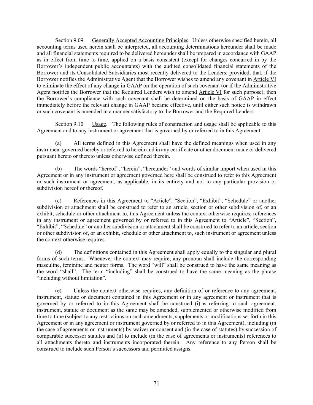 71 Section 9.09 Generally Accepted Accounting Principles. Unless otherwise specified herein, all accounting terms used herein shall be interpreted, all accounting determinations hereunder shall be made and all financial statements required to be delivered hereunder shall be prepared in accordance with GAAP as in effect from time to time, applied on a basis consistent (except for changes concurred in by the Borrower’s independent public accountants) with the audited consolidated financial statements of the Borrower and its Consolidated Subsidiaries most recently delivered to the Lenders; provided, that, if the Borrower notifies the Administrative Agent that the Borrower wishes to amend any covenant in Article VI to eliminate the effect of any change in GAAP on the operation of such covenant (or if the Administrative Agent notifies the Borrower that the Required Lenders wish to amend Article VI for such purpose), then the Borrower’s compliance with such covenant shall be determined on the basis of GAAP in effect immediately before the relevant change in GAAP became effective, until either such notice is withdrawn or such covenant is amended in a manner satisfactory to the Borrower and the Required Lenders. Section 9.10 Usage. The following rules of construction and usage shall be applicable to this Agreement and to any instrument or agreement that is governed by or referred to in this Agreement. (a) All terms defined in this Agreement shall have the defined meanings when used in any instrument governed hereby or referred to herein and in any certificate or other document made or delivered pursuant hereto or thereto unless otherwise defined therein. (b) The words “hereof”, “herein”, “hereunder” and words of similar import when used in this Agreement or in any instrument or agreement governed here shall be construed to refer to this Agreement or such instrument or agreement, as applicable, in its entirety and not to any particular provision or subdivision hereof or thereof. (c) References in this Agreement to “Article”, “Section”, “Exhibit”, “Schedule” or another subdivision or attachment shall be construed to refer to an article, section or other subdivision of, or an exhibit, schedule or other attachment to, this Agreement unless the context otherwise requires; references in any instrument or agreement governed by or referred to in this Agreement to “Article”, “Section”, “Exhibit”, “Schedule” or another subdivision or attachment shall be construed to refer to an article, section or other subdivision of, or an exhibit, schedule or other attachment to, such instrument or agreement unless the context otherwise requires. (d) The definitions contained in this Agreement shall apply equally to the singular and plural forms of such terms. Whenever the context may require, any pronoun shall include the corresponding masculine, feminine and neuter forms. The word “will” shall be construed to have the same meaning as the word “shall”. The term “including” shall be construed to have the same meaning as the phrase “including without limitation”. (e) Unless the context otherwise requires, any definition of or reference to any agreement, instrument, statute or document contained in this Agreement or in any agreement or instrument that is governed by or referred to in this Agreement shall be construed (i) as referring to such agreement, instrument, statute or document as the same may be amended, supplemented or otherwise modified from time to time (subject to any restrictions on such amendments, supplements or modifications set forth in this Agreement or in any agreement or instrument governed by or referred to in this Agreement), including (in the case of agreements or instruments) by waiver or consent and (in the case of statutes) by succession of comparable successor statutes and (ii) to include (in the case of agreements or instruments) references to all attachments thereto and instruments incorporated therein. Any reference to any Person shall be construed to include such Person’s successors and permitted assigns.