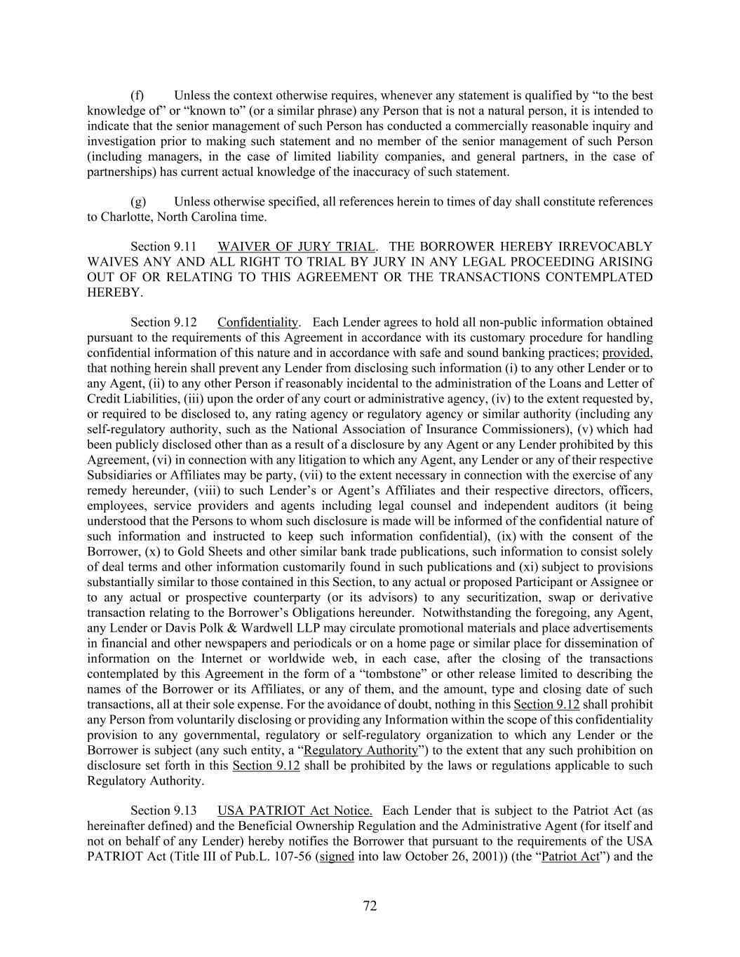 72 (f) Unless the context otherwise requires, whenever any statement is qualified by “to the best knowledge of” or “known to” (or a similar phrase) any Person that is not a natural person, it is intended to indicate that the senior management of such Person has conducted a commercially reasonable inquiry and investigation prior to making such statement and no member of the senior management of such Person (including managers, in the case of limited liability companies, and general partners, in the case of partnerships) has current actual knowledge of the inaccuracy of such statement. (g) Unless otherwise specified, all references herein to times of day shall constitute references to Charlotte, North Carolina time. Section 9.11 WAIVER OF JURY TRIAL. THE BORROWER HEREBY IRREVOCABLY WAIVES ANY AND ALL RIGHT TO TRIAL BY JURY IN ANY LEGAL PROCEEDING ARISING OUT OF OR RELATING TO THIS AGREEMENT OR THE TRANSACTIONS CONTEMPLATED HEREBY. Section 9.12 Confidentiality. Each Lender agrees to hold all non-public information obtained pursuant to the requirements of this Agreement in accordance with its customary procedure for handling confidential information of this nature and in accordance with safe and sound banking practices; provided, that nothing herein shall prevent any Lender from disclosing such information (i) to any other Lender or to any Agent, (ii) to any other Person if reasonably incidental to the administration of the Loans and Letter of Credit Liabilities, (iii) upon the order of any court or administrative agency, (iv) to the extent requested by, or required to be disclosed to, any rating agency or regulatory agency or similar authority (including any self-regulatory authority, such as the National Association of Insurance Commissioners), (v) which had been publicly disclosed other than as a result of a disclosure by any Agent or any Lender prohibited by this Agreement, (vi) in connection with any litigation to which any Agent, any Lender or any of their respective Subsidiaries or Affiliates may be party, (vii) to the extent necessary in connection with the exercise of any remedy hereunder, (viii) to such Lender’s or Agent’s Affiliates and their respective directors, officers, employees, service providers and agents including legal counsel and independent auditors (it being understood that the Persons to whom such disclosure is made will be informed of the confidential nature of such information and instructed to keep such information confidential), (ix) with the consent of the Borrower, (x) to Gold Sheets and other similar bank trade publications, such information to consist solely of deal terms and other information customarily found in such publications and (xi) subject to provisions substantially similar to those contained in this Section, to any actual or proposed Participant or Assignee or to any actual or prospective counterparty (or its advisors) to any securitization, swap or derivative transaction relating to the Borrower’s Obligations hereunder. Notwithstanding the foregoing, any Agent, any Lender or Davis Polk & Wardwell LLP may circulate promotional materials and place advertisements in financial and other newspapers and periodicals or on a home page or similar place for dissemination of information on the Internet or worldwide web, in each case, after the closing of the transactions contemplated by this Agreement in the form of a “tombstone” or other release limited to describing the names of the Borrower or its Affiliates, or any of them, and the amount, type and closing date of such transactions, all at their sole expense. For the avoidance of doubt, nothing in this Section 9.12 shall prohibit any Person from voluntarily disclosing or providing any Information within the scope of this confidentiality provision to any governmental, regulatory or self-regulatory organization to which any Lender or the Borrower is subject (any such entity, a “Regulatory Authority”) to the extent that any such prohibition on disclosure set forth in this Section 9.12 shall be prohibited by the laws or regulations applicable to such Regulatory Authority. Section 9.13 USA PATRIOT Act Notice. Each Lender that is subject to the Patriot Act (as hereinafter defined) and the Beneficial Ownership Regulation and the Administrative Agent (for itself and not on behalf of any Lender) hereby notifies the Borrower that pursuant to the requirements of the USA PATRIOT Act (Title III of Pub.L. 107-56 (signed into law October 26, 2001)) (the “Patriot Act”) and the