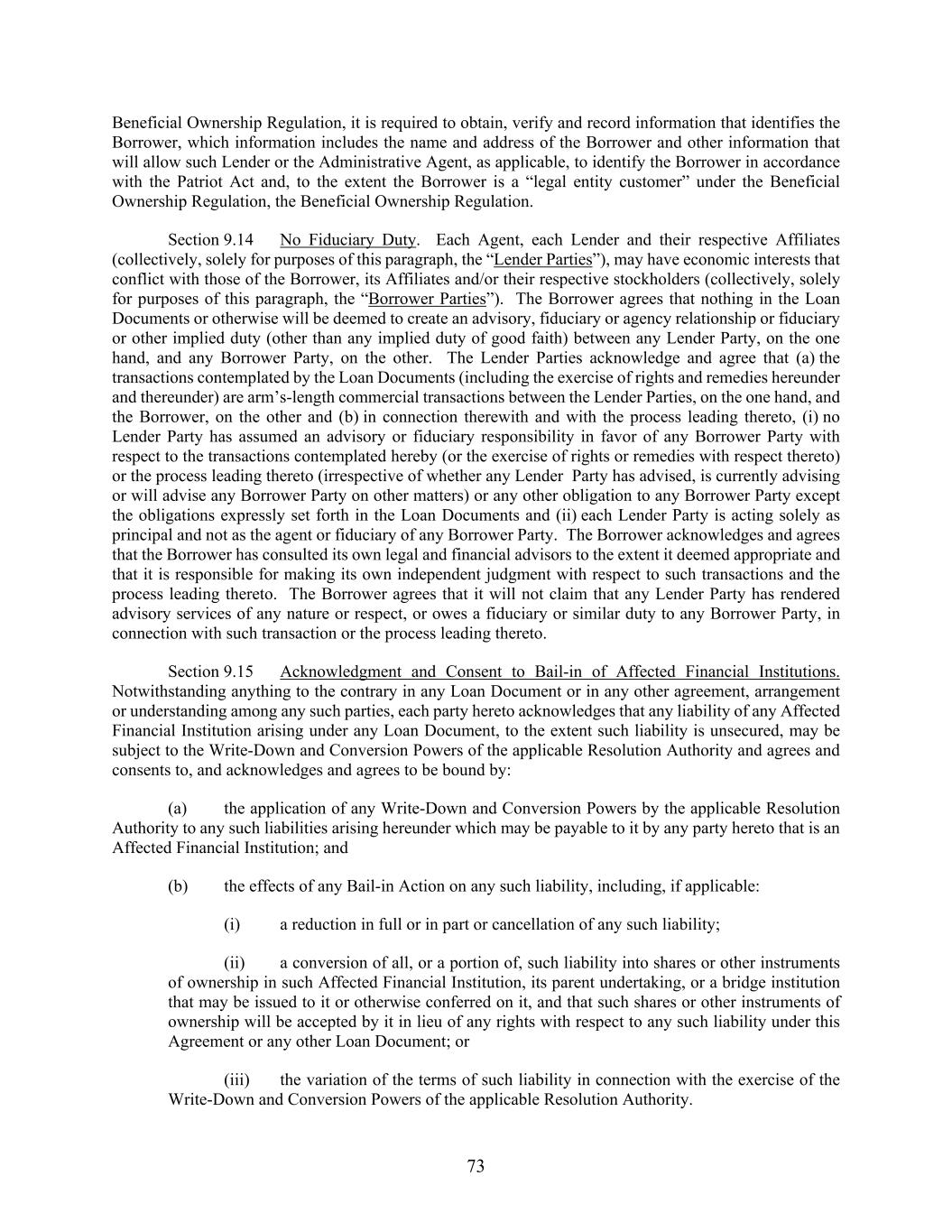 73 Beneficial Ownership Regulation, it is required to obtain, verify and record information that identifies the Borrower, which information includes the name and address of the Borrower and other information that will allow such Lender or the Administrative Agent, as applicable, to identify the Borrower in accordance with the Patriot Act and, to the extent the Borrower is a “legal entity customer” under the Beneficial Ownership Regulation, the Beneficial Ownership Regulation. Section 9.14 No Fiduciary Duty. Each Agent, each Lender and their respective Affiliates (collectively, solely for purposes of this paragraph, the “Lender Parties”), may have economic interests that conflict with those of the Borrower, its Affiliates and/or their respective stockholders (collectively, solely for purposes of this paragraph, the “Borrower Parties”). The Borrower agrees that nothing in the Loan Documents or otherwise will be deemed to create an advisory, fiduciary or agency relationship or fiduciary or other implied duty (other than any implied duty of good faith) between any Lender Party, on the one hand, and any Borrower Party, on the other. The Lender Parties acknowledge and agree that (a) the transactions contemplated by the Loan Documents (including the exercise of rights and remedies hereunder and thereunder) are arm’s-length commercial transactions between the Lender Parties, on the one hand, and the Borrower, on the other and (b) in connection therewith and with the process leading thereto, (i) no Lender Party has assumed an advisory or fiduciary responsibility in favor of any Borrower Party with respect to the transactions contemplated hereby (or the exercise of rights or remedies with respect thereto) or the process leading thereto (irrespective of whether any Lender Party has advised, is currently advising or will advise any Borrower Party on other matters) or any other obligation to any Borrower Party except the obligations expressly set forth in the Loan Documents and (ii) each Lender Party is acting solely as principal and not as the agent or fiduciary of any Borrower Party. The Borrower acknowledges and agrees that the Borrower has consulted its own legal and financial advisors to the extent it deemed appropriate and that it is responsible for making its own independent judgment with respect to such transactions and the process leading thereto. The Borrower agrees that it will not claim that any Lender Party has rendered advisory services of any nature or respect, or owes a fiduciary or similar duty to any Borrower Party, in connection with such transaction or the process leading thereto. Section 9.15 Acknowledgment and Consent to Bail-in of Affected Financial Institutions. Notwithstanding anything to the contrary in any Loan Document or in any other agreement, arrangement or understanding among any such parties, each party hereto acknowledges that any liability of any Affected Financial Institution arising under any Loan Document, to the extent such liability is unsecured, may be subject to the Write-Down and Conversion Powers of the applicable Resolution Authority and agrees and consents to, and acknowledges and agrees to be bound by: (a) the application of any Write-Down and Conversion Powers by the applicable Resolution Authority to any such liabilities arising hereunder which may be payable to it by any party hereto that is an Affected Financial Institution; and (b) the effects of any Bail-in Action on any such liability, including, if applicable: (i) a reduction in full or in part or cancellation of any such liability; (ii) a conversion of all, or a portion of, such liability into shares or other instruments of ownership in such Affected Financial Institution, its parent undertaking, or a bridge institution that may be issued to it or otherwise conferred on it, and that such shares or other instruments of ownership will be accepted by it in lieu of any rights with respect to any such liability under this Agreement or any other Loan Document; or (iii) the variation of the terms of such liability in connection with the exercise of the Write-Down and Conversion Powers of the applicable Resolution Authority.
