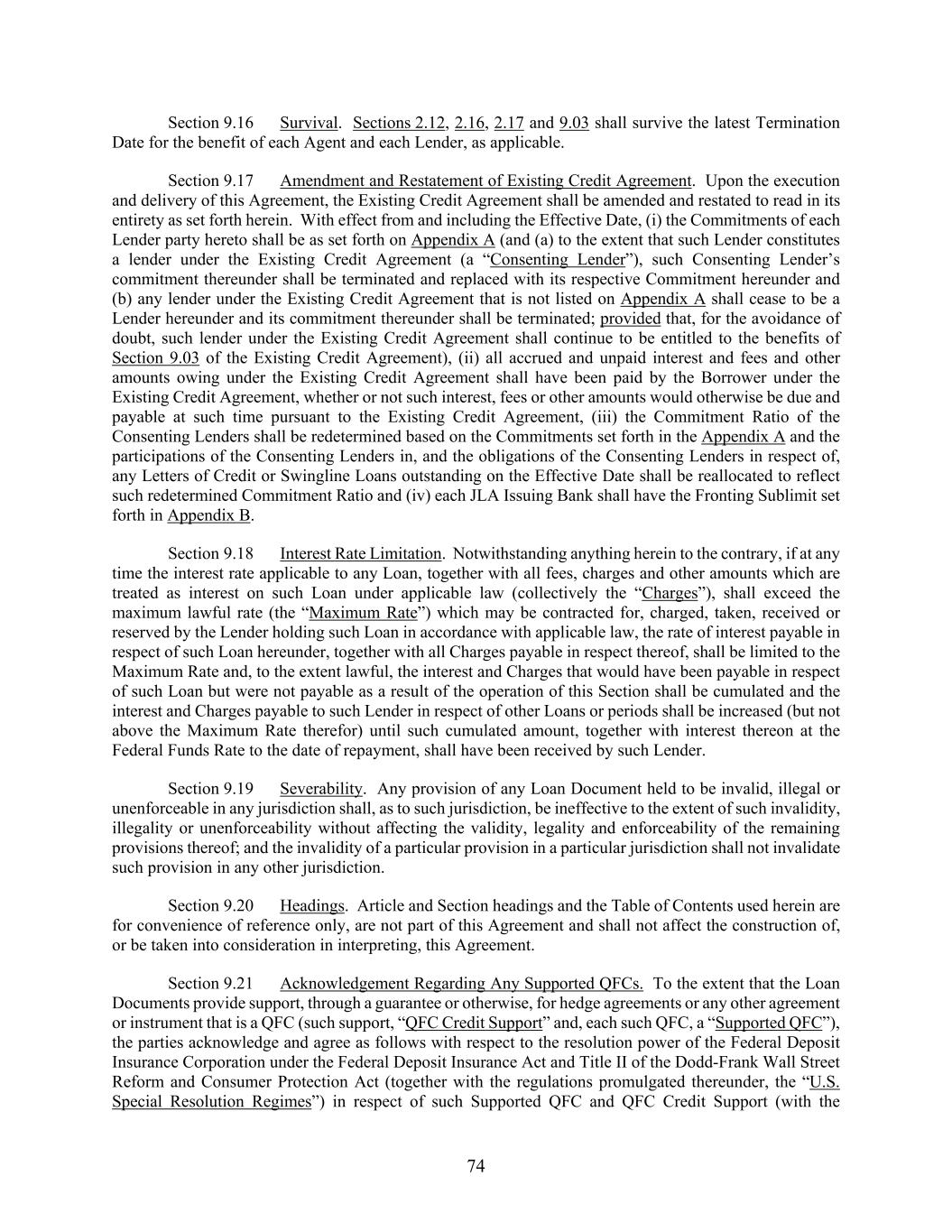 74 Section 9.16 Survival. Sections 2.12, 2.16, 2.17 and 9.03 shall survive the latest Termination Date for the benefit of each Agent and each Lender, as applicable. Section 9.17 Amendment and Restatement of Existing Credit Agreement. Upon the execution and delivery of this Agreement, the Existing Credit Agreement shall be amended and restated to read in its entirety as set forth herein. With effect from and including the Effective Date, (i) the Commitments of each Lender party hereto shall be as set forth on Appendix A (and (a) to the extent that such Lender constitutes a lender under the Existing Credit Agreement (a “Consenting Lender”), such Consenting Lender’s commitment thereunder shall be terminated and replaced with its respective Commitment hereunder and (b) any lender under the Existing Credit Agreement that is not listed on Appendix A shall cease to be a Lender hereunder and its commitment thereunder shall be terminated; provided that, for the avoidance of doubt, such lender under the Existing Credit Agreement shall continue to be entitled to the benefits of Section 9.03 of the Existing Credit Agreement), (ii) all accrued and unpaid interest and fees and other amounts owing under the Existing Credit Agreement shall have been paid by the Borrower under the Existing Credit Agreement, whether or not such interest, fees or other amounts would otherwise be due and payable at such time pursuant to the Existing Credit Agreement, (iii) the Commitment Ratio of the Consenting Lenders shall be redetermined based on the Commitments set forth in the Appendix A and the participations of the Consenting Lenders in, and the obligations of the Consenting Lenders in respect of, any Letters of Credit or Swingline Loans outstanding on the Effective Date shall be reallocated to reflect such redetermined Commitment Ratio and (iv) each JLA Issuing Bank shall have the Fronting Sublimit set forth in Appendix B. Section 9.18 Interest Rate Limitation. Notwithstanding anything herein to the contrary, if at any time the interest rate applicable to any Loan, together with all fees, charges and other amounts which are treated as interest on such Loan under applicable law (collectively the “Charges”), shall exceed the maximum lawful rate (the “Maximum Rate”) which may be contracted for, charged, taken, received or reserved by the Lender holding such Loan in accordance with applicable law, the rate of interest payable in respect of such Loan hereunder, together with all Charges payable in respect thereof, shall be limited to the Maximum Rate and, to the extent lawful, the interest and Charges that would have been payable in respect of such Loan but were not payable as a result of the operation of this Section shall be cumulated and the interest and Charges payable to such Lender in respect of other Loans or periods shall be increased (but not above the Maximum Rate therefor) until such cumulated amount, together with interest thereon at the Federal Funds Rate to the date of repayment, shall have been received by such Lender. Section 9.19 Severability. Any provision of any Loan Document held to be invalid, illegal or unenforceable in any jurisdiction shall, as to such jurisdiction, be ineffective to the extent of such invalidity, illegality or unenforceability without affecting the validity, legality and enforceability of the remaining provisions thereof; and the invalidity of a particular provision in a particular jurisdiction shall not invalidate such provision in any other jurisdiction. Section 9.20 Headings. Article and Section headings and the Table of Contents used herein are for convenience of reference only, are not part of this Agreement and shall not affect the construction of, or be taken into consideration in interpreting, this Agreement. Section 9.21 Acknowledgement Regarding Any Supported QFCs. To the extent that the Loan Documents provide support, through a guarantee or otherwise, for hedge agreements or any other agreement or instrument that is a QFC (such support, “QFC Credit Support” and, each such QFC, a “Supported QFC”), the parties acknowledge and agree as follows with respect to the resolution power of the Federal Deposit Insurance Corporation under the Federal Deposit Insurance Act and Title II of the Dodd-Frank Wall Street Reform and Consumer Protection Act (together with the regulations promulgated thereunder, the “U.S. Special Resolution Regimes”) in respect of such Supported QFC and QFC Credit Support (with the