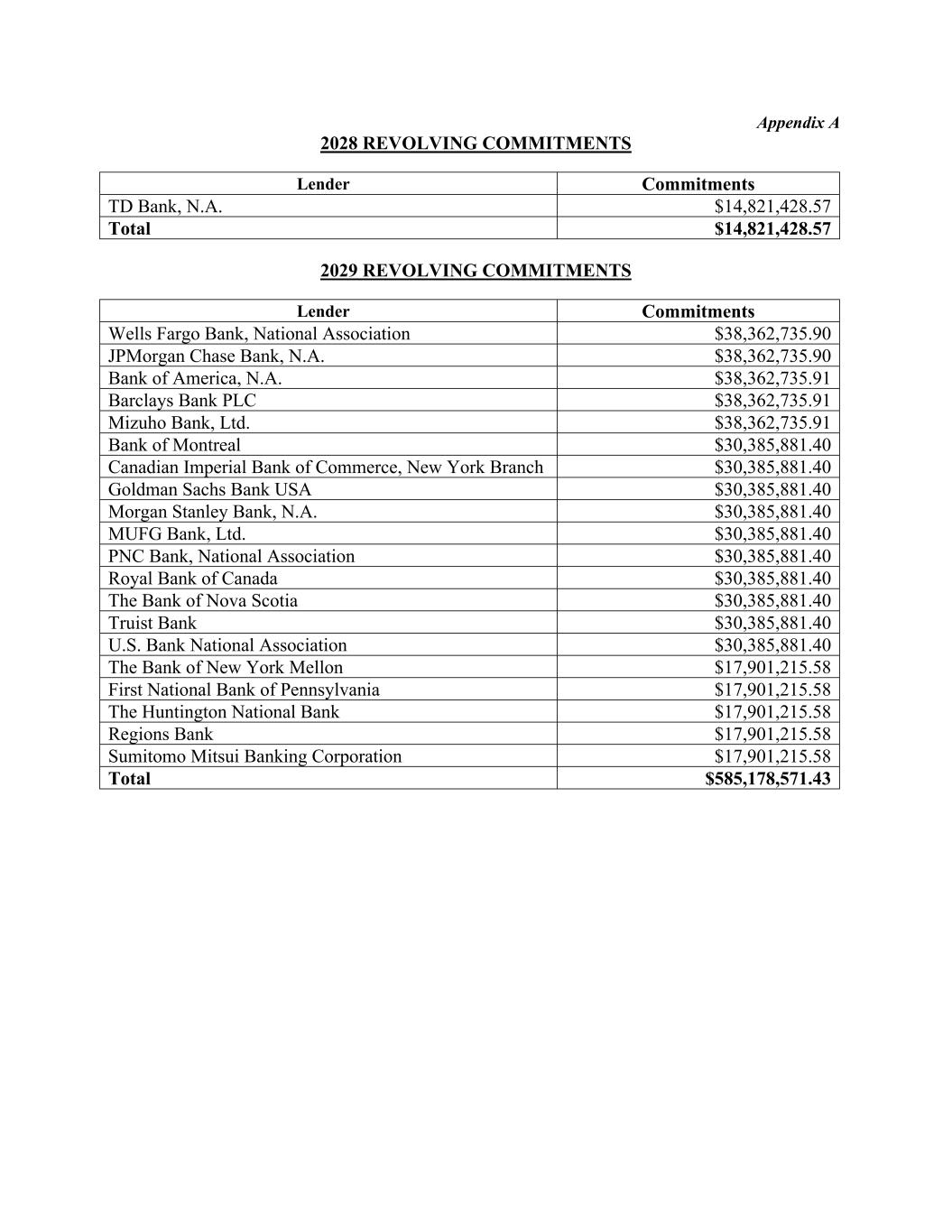 Appendix A 2028 REVOLVING COMMITMENTS Lender Commitments TD Bank, N.A. $14,821,428.57 Total $14,821,428.57 2029 REVOLVING COMMITMENTS Lender Commitments Wells Fargo Bank, National Association $38,362,735.90 JPMorgan Chase Bank, N.A. $38,362,735.90 Bank of America, N.A. $38,362,735.91 Barclays Bank PLC $38,362,735.91 Mizuho Bank, Ltd. $38,362,735.91 Bank of Montreal $30,385,881.40 Canadian Imperial Bank of Commerce, New York Branch $30,385,881.40 Goldman Sachs Bank USA $30,385,881.40 Morgan Stanley Bank, N.A. $30,385,881.40 MUFG Bank, Ltd. $30,385,881.40 PNC Bank, National Association $30,385,881.40 Royal Bank of Canada $30,385,881.40 The Bank of Nova Scotia $30,385,881.40 Truist Bank $30,385,881.40 U.S. Bank National Association $30,385,881.40 The Bank of New York Mellon $17,901,215.58 First National Bank of Pennsylvania $17,901,215.58 The Huntington National Bank $17,901,215.58 Regions Bank $17,901,215.58 Sumitomo Mitsui Banking Corporation $17,901,215.58 Total $585,178,571.43