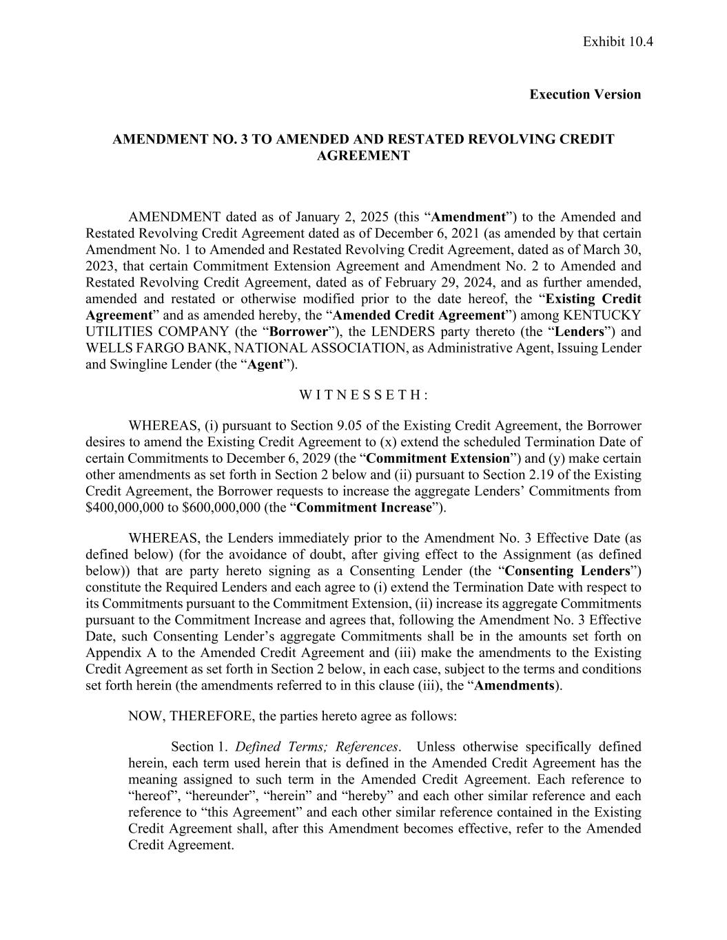 Execution Version AMENDMENT NO. 3 TO AMENDED AND RESTATED REVOLVING CREDIT AGREEMENT AMENDMENT dated as of January 2, 2025 (this “Amendment”) to the Amended and Restated Revolving Credit Agreement dated as of December 6, 2021 (as amended by that certain Amendment No. 1 to Amended and Restated Revolving Credit Agreement, dated as of March 30, 2023, that certain Commitment Extension Agreement and Amendment No. 2 to Amended and Restated Revolving Credit Agreement, dated as of February 29, 2024, and as further amended, amended and restated or otherwise modified prior to the date hereof, the “Existing Credit Agreement” and as amended hereby, the “Amended Credit Agreement”) among KENTUCKY UTILITIES COMPANY (the “Borrower”), the LENDERS party thereto (the “Lenders”) and WELLS FARGO BANK, NATIONAL ASSOCIATION, as Administrative Agent, Issuing Lender and Swingline Lender (the “Agent”). W I T N E S S E T H : WHEREAS, (i) pursuant to Section 9.05 of the Existing Credit Agreement, the Borrower desires to amend the Existing Credit Agreement to (x) extend the scheduled Termination Date of certain Commitments to December 6, 2029 (the “Commitment Extension”) and (y) make certain other amendments as set forth in Section 2 below and (ii) pursuant to Section 2.19 of the Existing Credit Agreement, the Borrower requests to increase the aggregate Lenders’ Commitments from $400,000,000 to $600,000,000 (the “Commitment Increase”). WHEREAS, the Lenders immediately prior to the Amendment No. 3 Effective Date (as defined below) (for the avoidance of doubt, after giving effect to the Assignment (as defined below)) that are party hereto signing as a Consenting Lender (the “Consenting Lenders”) constitute the Required Lenders and each agree to (i) extend the Termination Date with respect to its Commitments pursuant to the Commitment Extension, (ii) increase its aggregate Commitments pursuant to the Commitment Increase and agrees that, following the Amendment No. 3 Effective Date, such Consenting Lender’s aggregate Commitments shall be in the amounts set forth on Appendix A to the Amended Credit Agreement and (iii) make the amendments to the Existing Credit Agreement as set forth in Section 2 below, in each case, subject to the terms and conditions set forth herein (the amendments referred to in this clause (iii), the “Amendments). NOW, THEREFORE, the parties hereto agree as follows: Section 1. Defined Terms; References. Unless otherwise specifically defined herein, each term used herein that is defined in the Amended Credit Agreement has the meaning assigned to such term in the Amended Credit Agreement. Each reference to “hereof”, “hereunder”, “herein” and “hereby” and each other similar reference and each reference to “this Agreement” and each other similar reference contained in the Existing Credit Agreement shall, after this Amendment becomes effective, refer to the Amended Credit Agreement. Exhibit 10.4