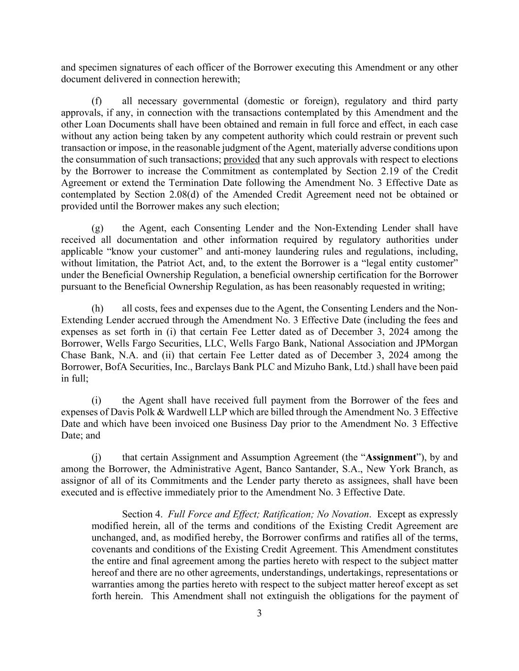 3 and specimen signatures of each officer of the Borrower executing this Amendment or any other document delivered in connection herewith; (f) all necessary governmental (domestic or foreign), regulatory and third party approvals, if any, in connection with the transactions contemplated by this Amendment and the other Loan Documents shall have been obtained and remain in full force and effect, in each case without any action being taken by any competent authority which could restrain or prevent such transaction or impose, in the reasonable judgment of the Agent, materially adverse conditions upon the consummation of such transactions; provided that any such approvals with respect to elections by the Borrower to increase the Commitment as contemplated by Section 2.19 of the Credit Agreement or extend the Termination Date following the Amendment No. 3 Effective Date as contemplated by Section 2.08(d) of the Amended Credit Agreement need not be obtained or provided until the Borrower makes any such election; (g) the Agent, each Consenting Lender and the Non-Extending Lender shall have received all documentation and other information required by regulatory authorities under applicable “know your customer” and anti-money laundering rules and regulations, including, without limitation, the Patriot Act, and, to the extent the Borrower is a “legal entity customer” under the Beneficial Ownership Regulation, a beneficial ownership certification for the Borrower pursuant to the Beneficial Ownership Regulation, as has been reasonably requested in writing; (h) all costs, fees and expenses due to the Agent, the Consenting Lenders and the Non- Extending Lender accrued through the Amendment No. 3 Effective Date (including the fees and expenses as set forth in (i) that certain Fee Letter dated as of December 3, 2024 among the Borrower, Wells Fargo Securities, LLC, Wells Fargo Bank, National Association and JPMorgan Chase Bank, N.A. and (ii) that certain Fee Letter dated as of December 3, 2024 among the Borrower, BofA Securities, Inc., Barclays Bank PLC and Mizuho Bank, Ltd.) shall have been paid in full; (i) the Agent shall have received full payment from the Borrower of the fees and expenses of Davis Polk & Wardwell LLP which are billed through the Amendment No. 3 Effective Date and which have been invoiced one Business Day prior to the Amendment No. 3 Effective Date; and (j) that certain Assignment and Assumption Agreement (the “Assignment”), by and among the Borrower, the Administrative Agent, Banco Santander, S.A., New York Branch, as assignor of all of its Commitments and the Lender party thereto as assignees, shall have been executed and is effective immediately prior to the Amendment No. 3 Effective Date. Section 4. Full Force and Effect; Ratification; No Novation. Except as expressly modified herein, all of the terms and conditions of the Existing Credit Agreement are unchanged, and, as modified hereby, the Borrower confirms and ratifies all of the terms, covenants and conditions of the Existing Credit Agreement. This Amendment constitutes the entire and final agreement among the parties hereto with respect to the subject matter hereof and there are no other agreements, understandings, undertakings, representations or warranties among the parties hereto with respect to the subject matter hereof except as set forth herein. This Amendment shall not extinguish the obligations for the payment of