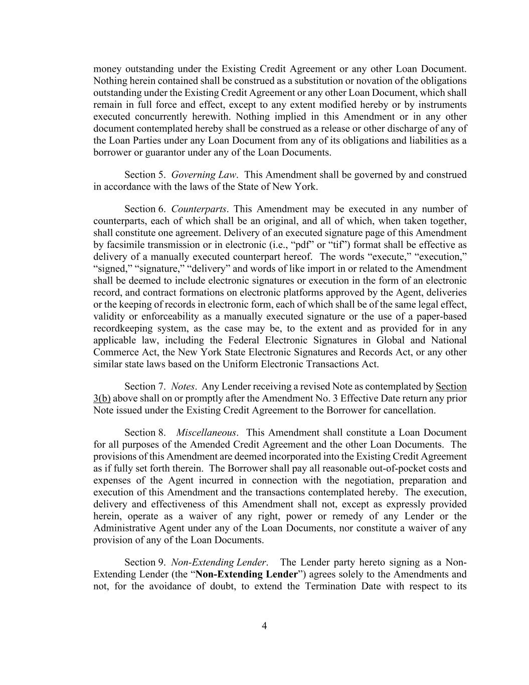 4 money outstanding under the Existing Credit Agreement or any other Loan Document. Nothing herein contained shall be construed as a substitution or novation of the obligations outstanding under the Existing Credit Agreement or any other Loan Document, which shall remain in full force and effect, except to any extent modified hereby or by instruments executed concurrently herewith. Nothing implied in this Amendment or in any other document contemplated hereby shall be construed as a release or other discharge of any of the Loan Parties under any Loan Document from any of its obligations and liabilities as a borrower or guarantor under any of the Loan Documents. Section 5. Governing Law. This Amendment shall be governed by and construed in accordance with the laws of the State of New York. Section 6. Counterparts. This Amendment may be executed in any number of counterparts, each of which shall be an original, and all of which, when taken together, shall constitute one agreement. Delivery of an executed signature page of this Amendment by facsimile transmission or in electronic (i.e., “pdf” or “tif”) format shall be effective as delivery of a manually executed counterpart hereof. The words “execute,” “execution,” “signed,” “signature,” “delivery” and words of like import in or related to the Amendment shall be deemed to include electronic signatures or execution in the form of an electronic record, and contract formations on electronic platforms approved by the Agent, deliveries or the keeping of records in electronic form, each of which shall be of the same legal effect, validity or enforceability as a manually executed signature or the use of a paper-based recordkeeping system, as the case may be, to the extent and as provided for in any applicable law, including the Federal Electronic Signatures in Global and National Commerce Act, the New York State Electronic Signatures and Records Act, or any other similar state laws based on the Uniform Electronic Transactions Act. Section 7. Notes. Any Lender receiving a revised Note as contemplated by Section 3(b) above shall on or promptly after the Amendment No. 3 Effective Date return any prior Note issued under the Existing Credit Agreement to the Borrower for cancellation. Section 8. Miscellaneous. This Amendment shall constitute a Loan Document for all purposes of the Amended Credit Agreement and the other Loan Documents. The provisions of this Amendment are deemed incorporated into the Existing Credit Agreement as if fully set forth therein. The Borrower shall pay all reasonable out-of-pocket costs and expenses of the Agent incurred in connection with the negotiation, preparation and execution of this Amendment and the transactions contemplated hereby. The execution, delivery and effectiveness of this Amendment shall not, except as expressly provided herein, operate as a waiver of any right, power or remedy of any Lender or the Administrative Agent under any of the Loan Documents, nor constitute a waiver of any provision of any of the Loan Documents. Section 9. Non-Extending Lender. The Lender party hereto signing as a Non- Extending Lender (the “Non-Extending Lender”) agrees solely to the Amendments and not, for the avoidance of doubt, to extend the Termination Date with respect to its