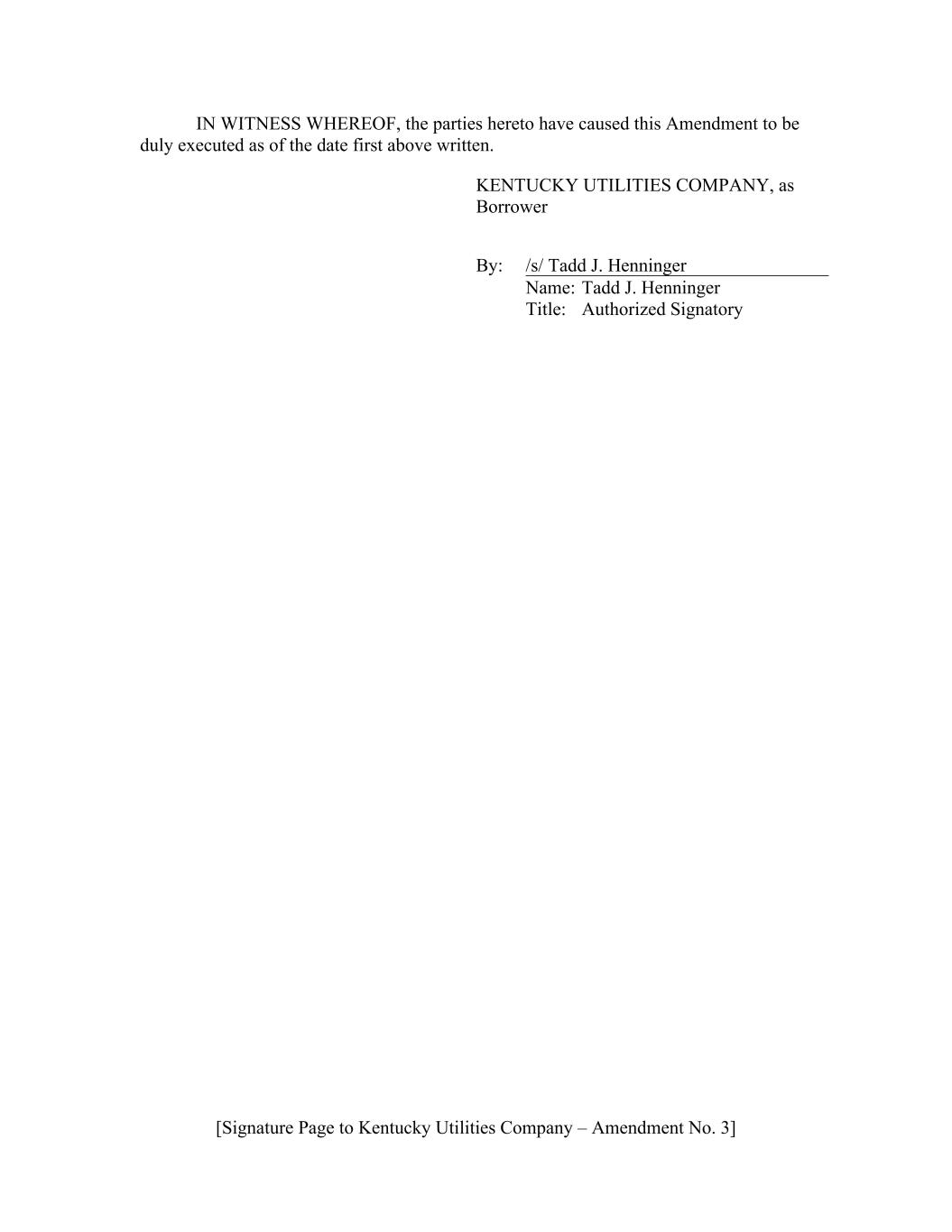 [Signature Page to Kentucky Utilities Company – Amendment No. 3] IN WITNESS WHEREOF, the parties hereto have caused this Amendment to be duly executed as of the date first above written. KENTUCKY UTILITIES COMPANY, as Borrower By: /s/ Tadd J. Henninger Name: Tadd J. Henninger Title: Authorized Signatory