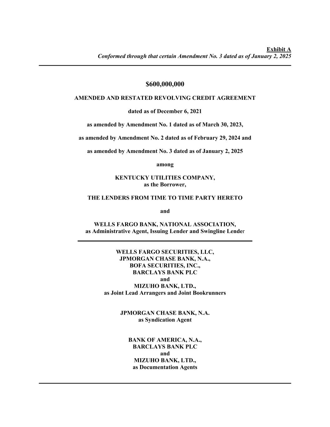 Exhibit A Conformed through that certain Amendment No. 3 dated as of January 2, 2025 $600,000,000 AMENDED AND RESTATED REVOLVING CREDIT AGREEMENT dated as of December 6, 2021 as amended by Amendment No. 1 dated as of March 30, 2023, as amended by Amendment No. 2 dated as of February 29, 2024 and as amended by Amendment No. 3 dated as of January 2, 2025 among KENTUCKY UTILITIES COMPANY, as the Borrower, THE LENDERS FROM TIME TO TIME PARTY HERETO and WELLS FARGO BANK, NATIONAL ASSOCIATION, as Administrative Agent, Issuing Lender and Swingline Lender WELLS FARGO SECURITIES, LLC, JPMORGAN CHASE BANK, N.A., BOFA SECURITIES, INC., BARCLAYS BANK PLC and MIZUHO BANK, LTD., as Joint Lead Arrangers and Joint Bookrunners JPMORGAN CHASE BANK, N.A. as Syndication Agent BANK OF AMERICA, N.A., BARCLAYS BANK PLC and MIZUHO BANK, LTD., as Documentation Agents