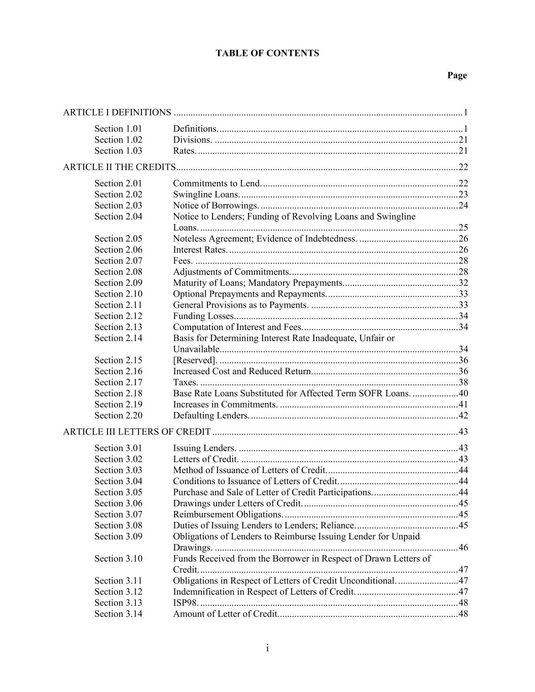 TABLE OF CONTENTS Page i ARTICLE I DEFINITIONS ........................................................................................................................ 1 Section 1.01 Definitions. ..................................................................................................... 1 Section 1.02 Divisions. ..................................................................................................... 21 Section 1.03 Rates. ............................................................................................................ 21 ARTICLE II THE CREDITS ..................................................................................................................... 22 Section 2.01 Commitments to Lend. ................................................................................. 22 Section 2.02 Swingline Loans. .......................................................................................... 23 Section 2.03 Notice of Borrowings. .................................................................................. 24 Section 2.04 Notice to Lenders; Funding of Revolving Loans and Swingline Loans. ........................................................................................................... 25 Section 2.05 Noteless Agreement; Evidence of Indebtedness. ......................................... 26 Section 2.06 Interest Rates. ............................................................................................... 26 Section 2.07 Fees. ............................................................................................................. 28 Section 2.08 Adjustments of Commitments. ..................................................................... 28 Section 2.09 Maturity of Loans; Mandatory Prepayments. ............................................... 32 Section 2.10 Optional Prepayments and Repayments. ...................................................... 33 Section 2.11 General Provisions as to Payments. ............................................................. 33 Section 2.12 Funding Losses. ............................................................................................ 34 Section 2.13 Computation of Interest and Fees. ................................................................ 34 Section 2.14 Basis for Determining Interest Rate Inadequate, Unfair or Unavailable. .................................................................................................. 34 Section 2.15 [Reserved]. ................................................................................................... 36 Section 2.16 Increased Cost and Reduced Return. ............................................................ 36 Section 2.17 Taxes. ........................................................................................................... 38 Section 2.18 Base Rate Loans Substituted for Affected Term SOFR Loans. ................... 40 Section 2.19 Increases in Commitments. .......................................................................... 41 Section 2.20 Defaulting Lenders. ...................................................................................... 42 ARTICLE III LETTERS OF CREDIT ...................................................................................................... 43 Section 3.01 Issuing Lenders. ........................................................................................... 43 Section 3.02 Letters of Credit. .......................................................................................... 43 Section 3.03 Method of Issuance of Letters of Credit. ...................................................... 44 Section 3.04 Conditions to Issuance of Letters of Credit. ................................................. 44 Section 3.05 Purchase and Sale of Letter of Credit Participations. ................................... 44 Section 3.06 Drawings under Letters of Credit. ................................................................ 45 Section 3.07 Reimbursement Obligations. ........................................................................ 45 Section 3.08 Duties of Issuing Lenders to Lenders; Reliance. .......................................... 45 Section 3.09 Obligations of Lenders to Reimburse Issuing Lender for Unpaid Drawings. ..................................................................................................... 46 Section 3.10 Funds Received from the Borrower in Respect of Drawn Letters of Credit. ........................................................................................................... 47 Section 3.11 Obligations in Respect of Letters of Credit Unconditional. ......................... 47 Section 3.12 Indemnification in Respect of Letters of Credit. .......................................... 47 Section 3.13 ISP98. ........................................................................................................... 48 Section 3.14 Amount of Letter of Credit. .......................................................................... 48