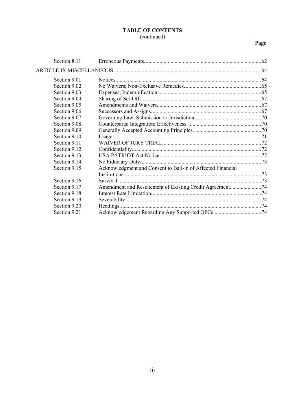 TABLE OF CONTENTS (continued) Page iii Section 8.11 Erroneous Payments. .................................................................................... 62 ARTICLE IX MISCELLANEOUS ........................................................................................................... 64 Section 9.01 Notices. ......................................................................................................... 64 Section 9.02 No Waivers; Non-Exclusive Remedies. ....................................................... 65 Section 9.03 Expenses; Indemnification. .......................................................................... 65 Section 9.04 Sharing of Set-Offs. ...................................................................................... 67 Section 9.05 Amendments and Waivers............................................................................ 67 Section 9.06 Successors and Assigns. ............................................................................... 67 Section 9.07 Governing Law; Submission to Jurisdiction. ............................................... 70 Section 9.08 Counterparts; Integration; Effectiveness. ..................................................... 70 Section 9.09 Generally Accepted Accounting Principles. ................................................ 70 Section 9.10 Usage. ........................................................................................................... 71 Section 9.11 WAIVER OF JURY TRIAL. ....................................................................... 72 Section 9.12 Confidentiality. ............................................................................................. 72 Section 9.13 USA PATRIOT Act Notice. ......................................................................... 72 Section 9.14 No Fiduciary Duty. ....................................................................................... 73 Section 9.15 Acknowledgment and Consent to Bail-in of Affected Financial Institutions. ................................................................................................... 73 Section 9.16 Survival. ....................................................................................................... 73 Section 9.17 Amendment and Restatement of Existing Credit Agreement. ..................... 74 Section 9.18 Interest Rate Limitation. ............................................................................... 74 Section 9.19 Severability................................................................................................... 74 Section 9.20 Headings. ...................................................................................................... 74 Section 9.21 Acknowledgement Regarding Any Supported QFCs. .................................. 74