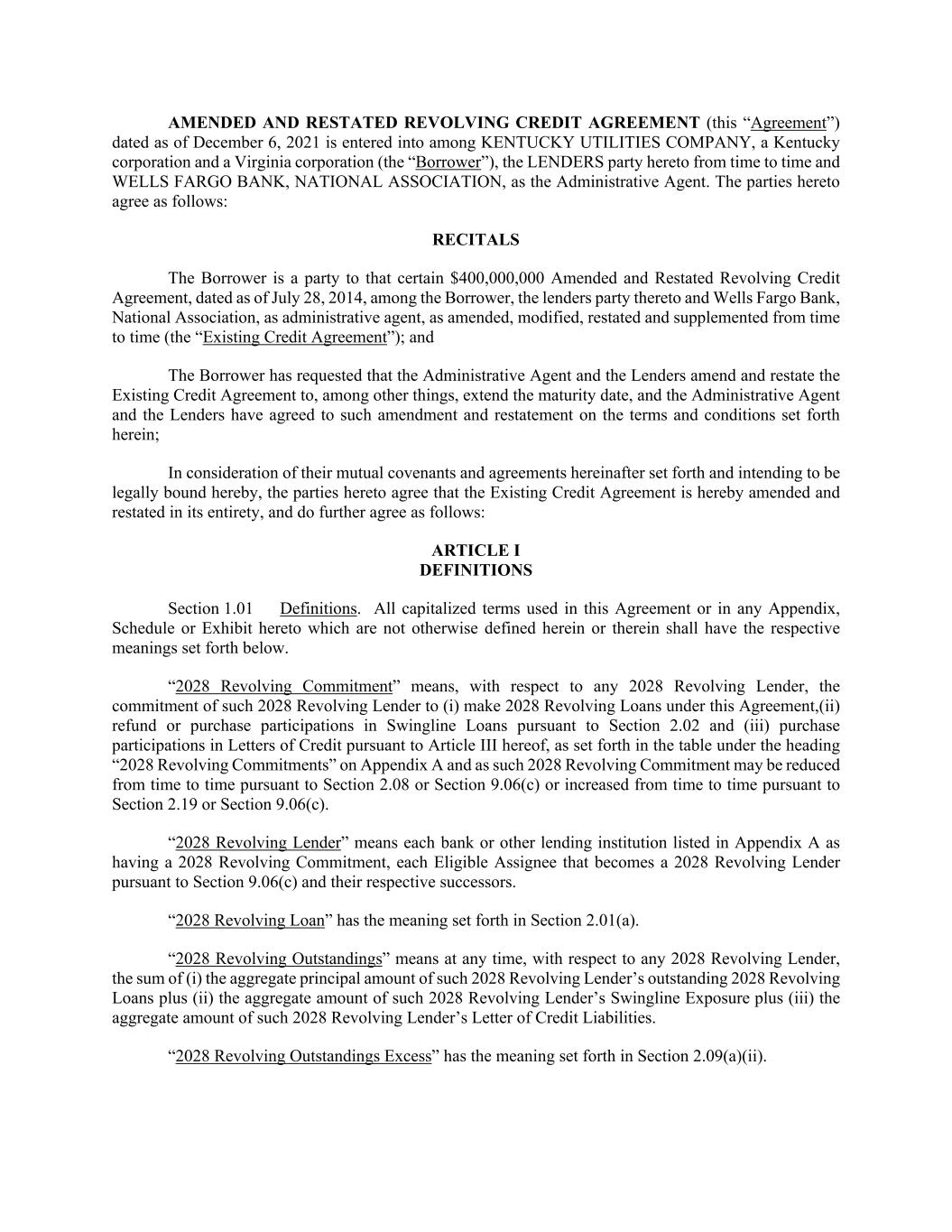 AMENDED AND RESTATED REVOLVING CREDIT AGREEMENT (this “Agreement”) dated as of December 6, 2021 is entered into among KENTUCKY UTILITIES COMPANY, a Kentucky corporation and a Virginia corporation (the “Borrower”), the LENDERS party hereto from time to time and WELLS FARGO BANK, NATIONAL ASSOCIATION, as the Administrative Agent. The parties hereto agree as follows: RECITALS The Borrower is a party to that certain $400,000,000 Amended and Restated Revolving Credit Agreement, dated as of July 28, 2014, among the Borrower, the lenders party thereto and Wells Fargo Bank, National Association, as administrative agent, as amended, modified, restated and supplemented from time to time (the “Existing Credit Agreement”); and The Borrower has requested that the Administrative Agent and the Lenders amend and restate the Existing Credit Agreement to, among other things, extend the maturity date, and the Administrative Agent and the Lenders have agreed to such amendment and restatement on the terms and conditions set forth herein; In consideration of their mutual covenants and agreements hereinafter set forth and intending to be legally bound hereby, the parties hereto agree that the Existing Credit Agreement is hereby amended and restated in its entirety, and do further agree as follows: ARTICLE I DEFINITIONS Section 1.01 Definitions. All capitalized terms used in this Agreement or in any Appendix, Schedule or Exhibit hereto which are not otherwise defined herein or therein shall have the respective meanings set forth below. “2028 Revolving Commitment” means, with respect to any 2028 Revolving Lender, the commitment of such 2028 Revolving Lender to (i) make 2028 Revolving Loans under this Agreement,(ii) refund or purchase participations in Swingline Loans pursuant to Section 2.02 and (iii) purchase participations in Letters of Credit pursuant to Article III hereof, as set forth in the table under the heading “2028 Revolving Commitments” on Appendix A and as such 2028 Revolving Commitment may be reduced from time to time pursuant to Section 2.08 or Section 9.06(c) or increased from time to time pursuant to Section 2.19 or Section 9.06(c). “2028 Revolving Lender” means each bank or other lending institution listed in Appendix A as having a 2028 Revolving Commitment, each Eligible Assignee that becomes a 2028 Revolving Lender pursuant to Section 9.06(c) and their respective successors. “2028 Revolving Loan” has the meaning set forth in Section 2.01(a). “2028 Revolving Outstandings” means at any time, with respect to any 2028 Revolving Lender, the sum of (i) the aggregate principal amount of such 2028 Revolving Lender’s outstanding 2028 Revolving Loans plus (ii) the aggregate amount of such 2028 Revolving Lender’s Swingline Exposure plus (iii) the aggregate amount of such 2028 Revolving Lender’s Letter of Credit Liabilities. “2028 Revolving Outstandings Excess” has the meaning set forth in Section 2.09(a)(ii).