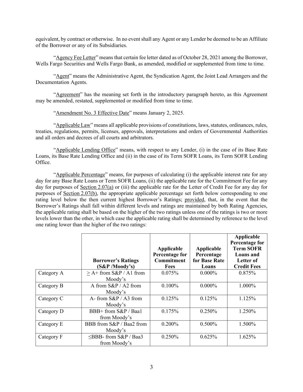 3 equivalent, by contract or otherwise. In no event shall any Agent or any Lender be deemed to be an Affiliate of the Borrower or any of its Subsidiaries. “Agency Fee Letter” means that certain fee letter dated as of October 28, 2021 among the Borrower, Wells Fargo Securities and Wells Fargo Bank, as amended, modified or supplemented from time to time. “Agent” means the Administrative Agent, the Syndication Agent, the Joint Lead Arrangers and the Documentation Agents. “Agreement” has the meaning set forth in the introductory paragraph hereto, as this Agreement may be amended, restated, supplemented or modified from time to time. “Amendment No. 3 Effective Date” means January 2, 2025. “Applicable Law” means all applicable provisions of constitutions, laws, statutes, ordinances, rules, treaties, regulations, permits, licenses, approvals, interpretations and orders of Governmental Authorities and all orders and decrees of all courts and arbitrators. “Applicable Lending Office” means, with respect to any Lender, (i) in the case of its Base Rate Loans, its Base Rate Lending Office and (ii) in the case of its Term SOFR Loans, its Term SOFR Lending Office. “Applicable Percentage” means, for purposes of calculating (i) the applicable interest rate for any day for any Base Rate Loans or Term SOFR Loans, (ii) the applicable rate for the Commitment Fee for any day for purposes of Section 2.07(a) or (iii) the applicable rate for the Letter of Credit Fee for any day for purposes of Section 2.07(b), the appropriate applicable percentage set forth below corresponding to one rating level below the then current highest Borrower’s Ratings; provided, that, in the event that the Borrower’s Ratings shall fall within different levels and ratings are maintained by both Rating Agencies, the applicable rating shall be based on the higher of the two ratings unless one of the ratings is two or more levels lower than the other, in which case the applicable rating shall be determined by reference to the level one rating lower than the higher of the two ratings: Borrower’s Ratings (S&P /Moody’s) Applicable Percentage for Commitment Fees Applicable Percentage for Base Rate Loans Applicable Percentage for Term SOFR Loans and Letter of Credit Fees Category A > A+ from S&P / A1 from Moody’s 0.075% 0.000% 0.875% Category B A from S&P / A2 from Moody’s 0.100% 0.000% 1.000% Category C A- from S&P / A3 from Moody’s 0.125% 0.125% 1.125% Category D BBB+ from S&P / Baa1 from Moody’s 0.175% 0.250% 1.250% Category E BBB from S&P / Baa2 from Moody’s 0.200% 0.500% 1.500% Category F ≤BBB- from S&P / Baa3 from Moody’s 0.250% 0.625% 1.625%