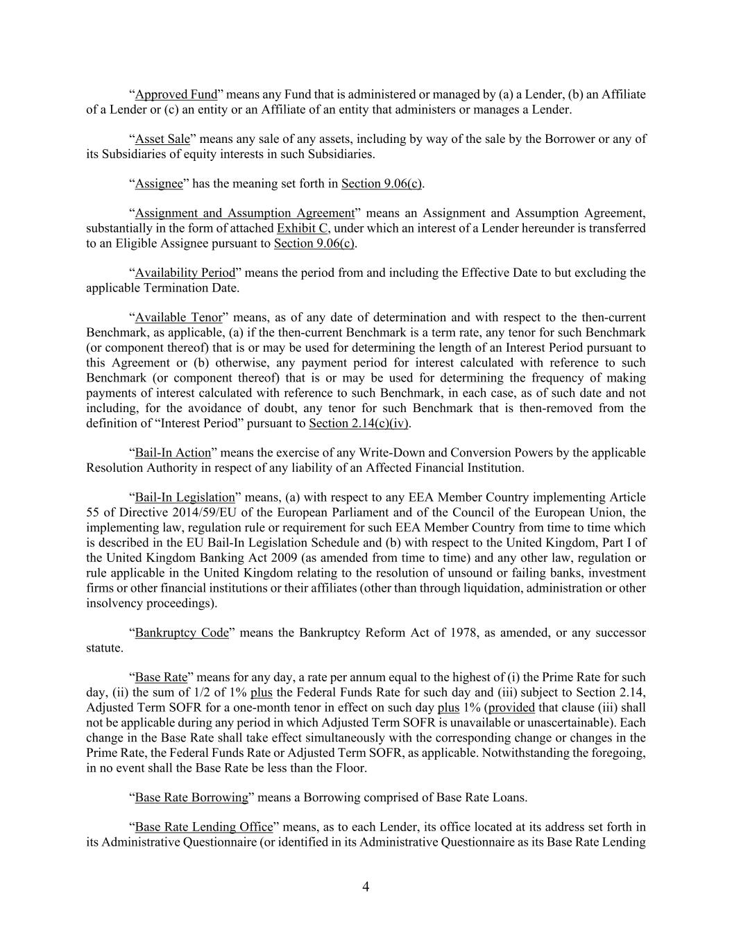 4 “Approved Fund” means any Fund that is administered or managed by (a) a Lender, (b) an Affiliate of a Lender or (c) an entity or an Affiliate of an entity that administers or manages a Lender. “Asset Sale” means any sale of any assets, including by way of the sale by the Borrower or any of its Subsidiaries of equity interests in such Subsidiaries. “Assignee” has the meaning set forth in Section 9.06(c). “Assignment and Assumption Agreement” means an Assignment and Assumption Agreement, substantially in the form of attached Exhibit C, under which an interest of a Lender hereunder is transferred to an Eligible Assignee pursuant to Section 9.06(c). “Availability Period” means the period from and including the Effective Date to but excluding the applicable Termination Date. “Available Tenor” means, as of any date of determination and with respect to the then-current Benchmark, as applicable, (a) if the then-current Benchmark is a term rate, any tenor for such Benchmark (or component thereof) that is or may be used for determining the length of an Interest Period pursuant to this Agreement or (b) otherwise, any payment period for interest calculated with reference to such Benchmark (or component thereof) that is or may be used for determining the frequency of making payments of interest calculated with reference to such Benchmark, in each case, as of such date and not including, for the avoidance of doubt, any tenor for such Benchmark that is then-removed from the definition of “Interest Period” pursuant to Section 2.14(c)(iv). “Bail-In Action” means the exercise of any Write-Down and Conversion Powers by the applicable Resolution Authority in respect of any liability of an Affected Financial Institution. “Bail-In Legislation” means, (a) with respect to any EEA Member Country implementing Article 55 of Directive 2014/59/EU of the European Parliament and of the Council of the European Union, the implementing law, regulation rule or requirement for such EEA Member Country from time to time which is described in the EU Bail-In Legislation Schedule and (b) with respect to the United Kingdom, Part I of the United Kingdom Banking Act 2009 (as amended from time to time) and any other law, regulation or rule applicable in the United Kingdom relating to the resolution of unsound or failing banks, investment firms or other financial institutions or their affiliates (other than through liquidation, administration or other insolvency proceedings). “Bankruptcy Code” means the Bankruptcy Reform Act of 1978, as amended, or any successor statute. “Base Rate” means for any day, a rate per annum equal to the highest of (i) the Prime Rate for such day, (ii) the sum of 1/2 of 1% plus the Federal Funds Rate for such day and (iii) subject to Section 2.14, Adjusted Term SOFR for a one-month tenor in effect on such day plus 1% (provided that clause (iii) shall not be applicable during any period in which Adjusted Term SOFR is unavailable or unascertainable). Each change in the Base Rate shall take effect simultaneously with the corresponding change or changes in the Prime Rate, the Federal Funds Rate or Adjusted Term SOFR, as applicable. Notwithstanding the foregoing, in no event shall the Base Rate be less than the Floor. “Base Rate Borrowing” means a Borrowing comprised of Base Rate Loans. “Base Rate Lending Office” means, as to each Lender, its office located at its address set forth in its Administrative Questionnaire (or identified in its Administrative Questionnaire as its Base Rate Lending