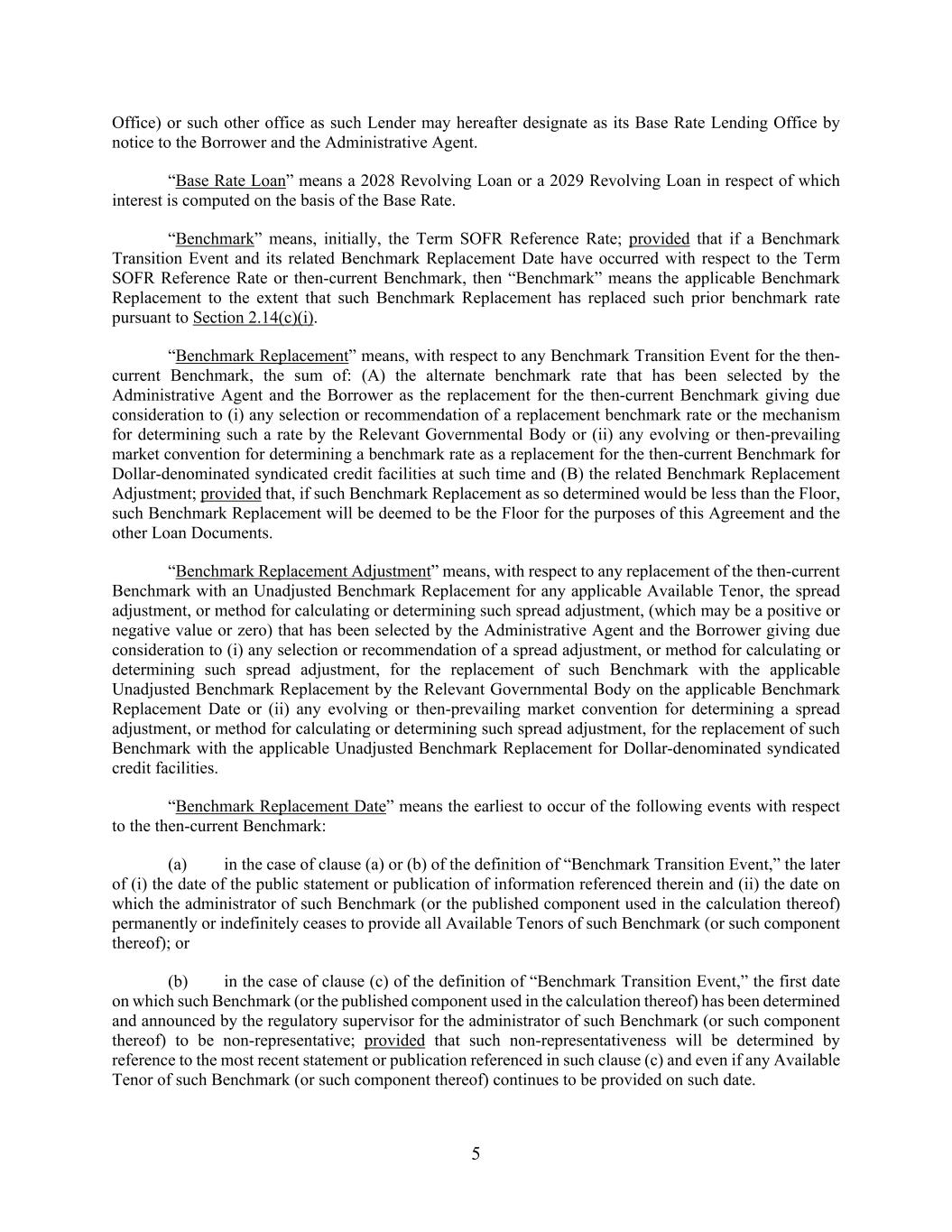 5 Office) or such other office as such Lender may hereafter designate as its Base Rate Lending Office by notice to the Borrower and the Administrative Agent. “Base Rate Loan” means a 2028 Revolving Loan or a 2029 Revolving Loan in respect of which interest is computed on the basis of the Base Rate. “Benchmark” means, initially, the Term SOFR Reference Rate; provided that if a Benchmark Transition Event and its related Benchmark Replacement Date have occurred with respect to the Term SOFR Reference Rate or then-current Benchmark, then “Benchmark” means the applicable Benchmark Replacement to the extent that such Benchmark Replacement has replaced such prior benchmark rate pursuant to Section 2.14(c)(i). “Benchmark Replacement” means, with respect to any Benchmark Transition Event for the then- current Benchmark, the sum of: (A) the alternate benchmark rate that has been selected by the Administrative Agent and the Borrower as the replacement for the then-current Benchmark giving due consideration to (i) any selection or recommendation of a replacement benchmark rate or the mechanism for determining such a rate by the Relevant Governmental Body or (ii) any evolving or then-prevailing market convention for determining a benchmark rate as a replacement for the then-current Benchmark for Dollar-denominated syndicated credit facilities at such time and (B) the related Benchmark Replacement Adjustment; provided that, if such Benchmark Replacement as so determined would be less than the Floor, such Benchmark Replacement will be deemed to be the Floor for the purposes of this Agreement and the other Loan Documents. “Benchmark Replacement Adjustment” means, with respect to any replacement of the then-current Benchmark with an Unadjusted Benchmark Replacement for any applicable Available Tenor, the spread adjustment, or method for calculating or determining such spread adjustment, (which may be a positive or negative value or zero) that has been selected by the Administrative Agent and the Borrower giving due consideration to (i) any selection or recommendation of a spread adjustment, or method for calculating or determining such spread adjustment, for the replacement of such Benchmark with the applicable Unadjusted Benchmark Replacement by the Relevant Governmental Body on the applicable Benchmark Replacement Date or (ii) any evolving or then-prevailing market convention for determining a spread adjustment, or method for calculating or determining such spread adjustment, for the replacement of such Benchmark with the applicable Unadjusted Benchmark Replacement for Dollar-denominated syndicated credit facilities. “Benchmark Replacement Date” means the earliest to occur of the following events with respect to the then-current Benchmark: (a) in the case of clause (a) or (b) of the definition of “Benchmark Transition Event,” the later of (i) the date of the public statement or publication of information referenced therein and (ii) the date on which the administrator of such Benchmark (or the published component used in the calculation thereof) permanently or indefinitely ceases to provide all Available Tenors of such Benchmark (or such component thereof); or (b) in the case of clause (c) of the definition of “Benchmark Transition Event,” the first date on which such Benchmark (or the published component used in the calculation thereof) has been determined and announced by the regulatory supervisor for the administrator of such Benchmark (or such component thereof) to be non-representative; provided that such non-representativeness will be determined by reference to the most recent statement or publication referenced in such clause (c) and even if any Available Tenor of such Benchmark (or such component thereof) continues to be provided on such date.