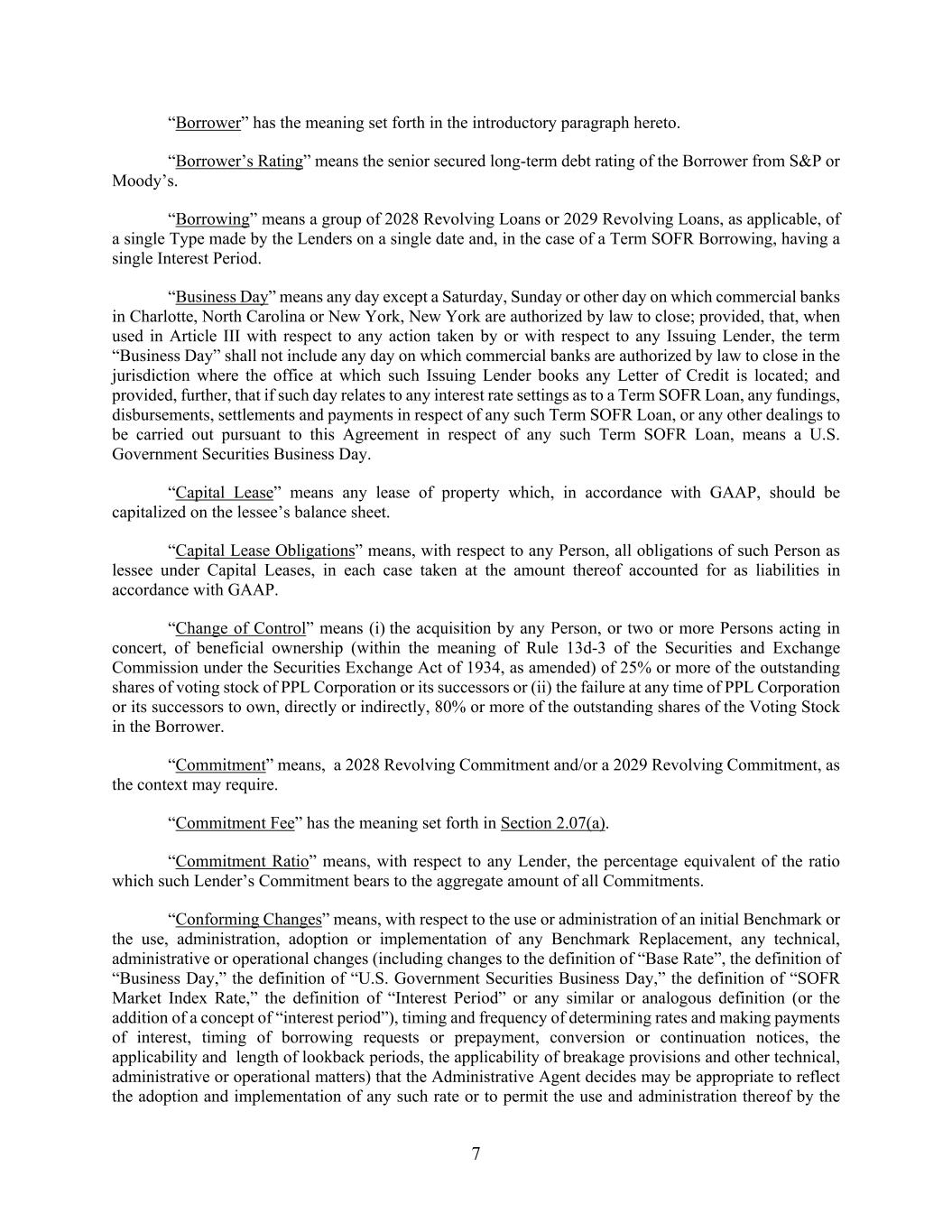 7 “Borrower” has the meaning set forth in the introductory paragraph hereto. “Borrower’s Rating” means the senior secured long-term debt rating of the Borrower from S&P or Moody’s. “Borrowing” means a group of 2028 Revolving Loans or 2029 Revolving Loans, as applicable, of a single Type made by the Lenders on a single date and, in the case of a Term SOFR Borrowing, having a single Interest Period. “Business Day” means any day except a Saturday, Sunday or other day on which commercial banks in Charlotte, North Carolina or New York, New York are authorized by law to close; provided, that, when used in Article III with respect to any action taken by or with respect to any Issuing Lender, the term “Business Day” shall not include any day on which commercial banks are authorized by law to close in the jurisdiction where the office at which such Issuing Lender books any Letter of Credit is located; and provided, further, that if such day relates to any interest rate settings as to a Term SOFR Loan, any fundings, disbursements, settlements and payments in respect of any such Term SOFR Loan, or any other dealings to be carried out pursuant to this Agreement in respect of any such Term SOFR Loan, means a U.S. Government Securities Business Day. “Capital Lease” means any lease of property which, in accordance with GAAP, should be capitalized on the lessee’s balance sheet. “Capital Lease Obligations” means, with respect to any Person, all obligations of such Person as lessee under Capital Leases, in each case taken at the amount thereof accounted for as liabilities in accordance with GAAP. “Change of Control” means (i) the acquisition by any Person, or two or more Persons acting in concert, of beneficial ownership (within the meaning of Rule 13d-3 of the Securities and Exchange Commission under the Securities Exchange Act of 1934, as amended) of 25% or more of the outstanding shares of voting stock of PPL Corporation or its successors or (ii) the failure at any time of PPL Corporation or its successors to own, directly or indirectly, 80% or more of the outstanding shares of the Voting Stock in the Borrower. “Commitment” means, a 2028 Revolving Commitment and/or a 2029 Revolving Commitment, as the context may require. “Commitment Fee” has the meaning set forth in Section 2.07(a). “Commitment Ratio” means, with respect to any Lender, the percentage equivalent of the ratio which such Lender’s Commitment bears to the aggregate amount of all Commitments. “Conforming Changes” means, with respect to the use or administration of an initial Benchmark or the use, administration, adoption or implementation of any Benchmark Replacement, any technical, administrative or operational changes (including changes to the definition of “Base Rate”, the definition of “Business Day,” the definition of “U.S. Government Securities Business Day,” the definition of “SOFR Market Index Rate,” the definition of “Interest Period” or any similar or analogous definition (or the addition of a concept of “interest period”), timing and frequency of determining rates and making payments of interest, timing of borrowing requests or prepayment, conversion or continuation notices, the applicability and length of lookback periods, the applicability of breakage provisions and other technical, administrative or operational matters) that the Administrative Agent decides may be appropriate to reflect the adoption and implementation of any such rate or to permit the use and administration thereof by the