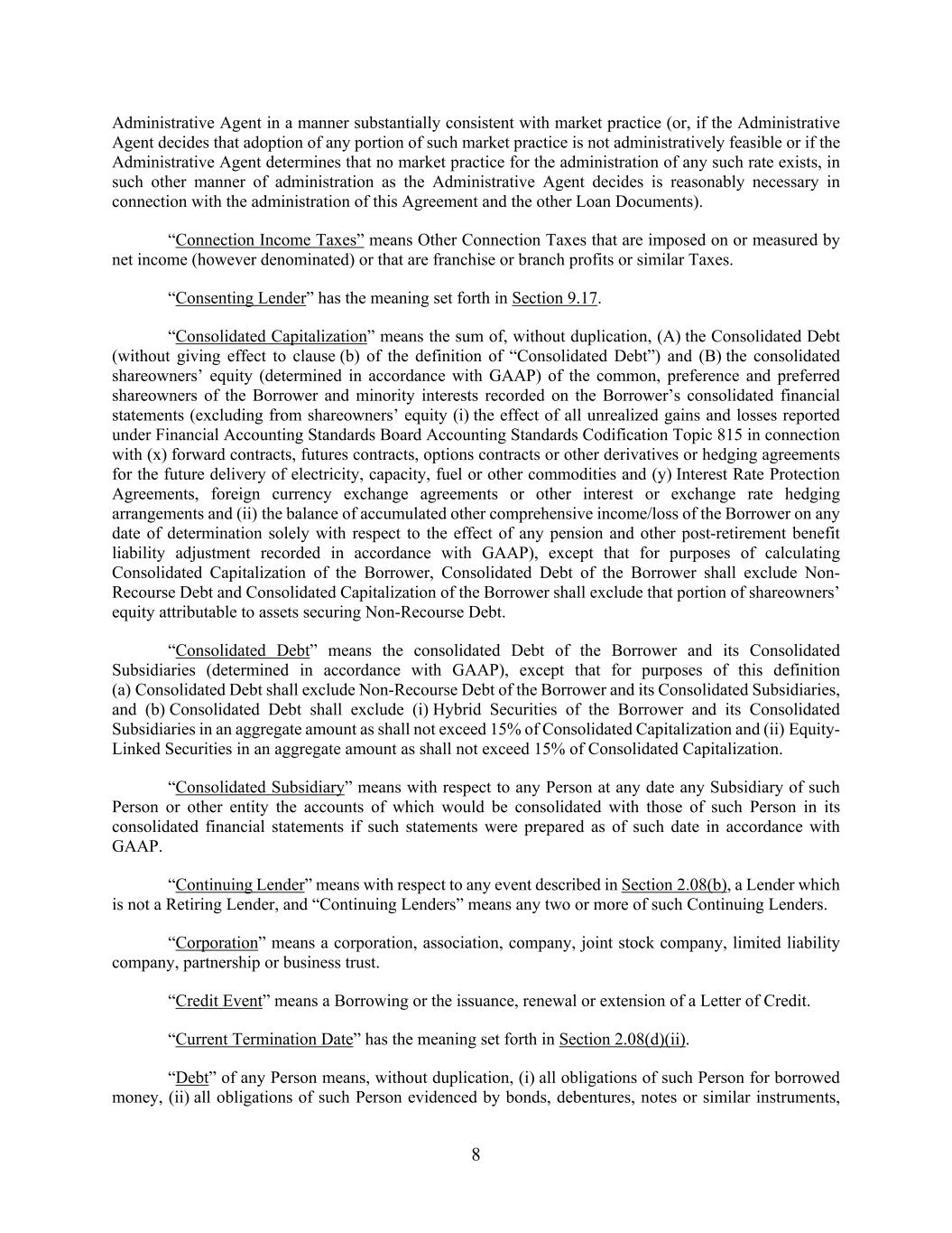 8 Administrative Agent in a manner substantially consistent with market practice (or, if the Administrative Agent decides that adoption of any portion of such market practice is not administratively feasible or if the Administrative Agent determines that no market practice for the administration of any such rate exists, in such other manner of administration as the Administrative Agent decides is reasonably necessary in connection with the administration of this Agreement and the other Loan Documents). “Connection Income Taxes” means Other Connection Taxes that are imposed on or measured by net income (however denominated) or that are franchise or branch profits or similar Taxes. “Consenting Lender” has the meaning set forth in Section 9.17. “Consolidated Capitalization” means the sum of, without duplication, (A) the Consolidated Debt (without giving effect to clause (b) of the definition of “Consolidated Debt”) and (B) the consolidated shareowners’ equity (determined in accordance with GAAP) of the common, preference and preferred shareowners of the Borrower and minority interests recorded on the Borrower’s consolidated financial statements (excluding from shareowners’ equity (i) the effect of all unrealized gains and losses reported under Financial Accounting Standards Board Accounting Standards Codification Topic 815 in connection with (x) forward contracts, futures contracts, options contracts or other derivatives or hedging agreements for the future delivery of electricity, capacity, fuel or other commodities and (y) Interest Rate Protection Agreements, foreign currency exchange agreements or other interest or exchange rate hedging arrangements and (ii) the balance of accumulated other comprehensive income/loss of the Borrower on any date of determination solely with respect to the effect of any pension and other post-retirement benefit liability adjustment recorded in accordance with GAAP), except that for purposes of calculating Consolidated Capitalization of the Borrower, Consolidated Debt of the Borrower shall exclude Non- Recourse Debt and Consolidated Capitalization of the Borrower shall exclude that portion of shareowners’ equity attributable to assets securing Non-Recourse Debt. “Consolidated Debt” means the consolidated Debt of the Borrower and its Consolidated Subsidiaries (determined in accordance with GAAP), except that for purposes of this definition (a) Consolidated Debt shall exclude Non-Recourse Debt of the Borrower and its Consolidated Subsidiaries, and (b) Consolidated Debt shall exclude (i) Hybrid Securities of the Borrower and its Consolidated Subsidiaries in an aggregate amount as shall not exceed 15% of Consolidated Capitalization and (ii) Equity- Linked Securities in an aggregate amount as shall not exceed 15% of Consolidated Capitalization. “Consolidated Subsidiary” means with respect to any Person at any date any Subsidiary of such Person or other entity the accounts of which would be consolidated with those of such Person in its consolidated financial statements if such statements were prepared as of such date in accordance with GAAP. “Continuing Lender” means with respect to any event described in Section 2.08(b), a Lender which is not a Retiring Lender, and “Continuing Lenders” means any two or more of such Continuing Lenders. “Corporation” means a corporation, association, company, joint stock company, limited liability company, partnership or business trust. “Credit Event” means a Borrowing or the issuance, renewal or extension of a Letter of Credit. “Current Termination Date” has the meaning set forth in Section 2.08(d)(ii). “Debt” of any Person means, without duplication, (i) all obligations of such Person for borrowed money, (ii) all obligations of such Person evidenced by bonds, debentures, notes or similar instruments,