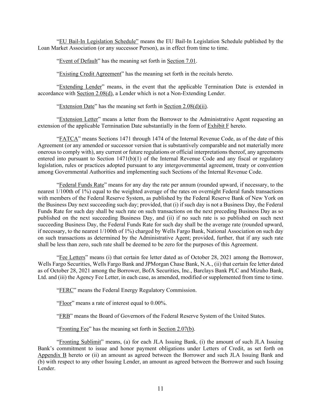 11 “EU Bail-In Legislation Schedule” means the EU Bail-In Legislation Schedule published by the Loan Market Association (or any successor Person), as in effect from time to time. “Event of Default” has the meaning set forth in Section 7.01. “Existing Credit Agreement” has the meaning set forth in the recitals hereto. “Extending Lender” means, in the event that the applicable Termination Date is extended in accordance with Section 2.08(d), a Lender which is not a Non-Extending Lender. “Extension Date” has the meaning set forth in Section 2.08(d)(ii). “Extension Letter” means a letter from the Borrower to the Administrative Agent requesting an extension of the applicable Termination Date substantially in the form of Exhibit F hereto. “FATCA” means Sections 1471 through 1474 of the Internal Revenue Code, as of the date of this Agreement (or any amended or successor version that is substantively comparable and not materially more onerous to comply with), any current or future regulations or official interpretations thereof, any agreements entered into pursuant to Section 1471(b)(1) of the Internal Revenue Code and any fiscal or regulatory legislation, rules or practices adopted pursuant to any intergovernmental agreement, treaty or convention among Governmental Authorities and implementing such Sections of the Internal Revenue Code. “Federal Funds Rate” means for any day the rate per annum (rounded upward, if necessary, to the nearest 1/100th of 1%) equal to the weighted average of the rates on overnight Federal funds transactions with members of the Federal Reserve System, as published by the Federal Reserve Bank of New York on the Business Day next succeeding such day; provided, that (i) if such day is not a Business Day, the Federal Funds Rate for such day shall be such rate on such transactions on the next preceding Business Day as so published on the next succeeding Business Day, and (ii) if no such rate is so published on such next succeeding Business Day, the Federal Funds Rate for such day shall be the average rate (rounded upward, if necessary, to the nearest 1/100th of 1%) charged by Wells Fargo Bank, National Association on such day on such transactions as determined by the Administrative Agent; provided, further, that if any such rate shall be less than zero, such rate shall be deemed to be zero for the purposes of this Agreement. “Fee Letters” means (i) that certain fee letter dated as of October 28, 2021 among the Borrower, Wells Fargo Securities, Wells Fargo Bank and JPMorgan Chase Bank, N.A., (ii) that certain fee letter dated as of October 28, 2021 among the Borrower, BofA Securities, Inc., Barclays Bank PLC and Mizuho Bank, Ltd. and (iii) the Agency Fee Letter, in each case, as amended, modified or supplemented from time to time. “FERC” means the Federal Energy Regulatory Commission. “Floor” means a rate of interest equal to 0.00%. “FRB” means the Board of Governors of the Federal Reserve System of the United States. “Fronting Fee” has the meaning set forth in Section 2.07(b). “Fronting Sublimit” means, (a) for each JLA Issuing Bank, (i) the amount of such JLA Issuing Bank’s commitment to issue and honor payment obligations under Letters of Credit, as set forth on Appendix B hereto or (ii) an amount as agreed between the Borrower and such JLA Issuing Bank and (b) with respect to any other Issuing Lender, an amount as agreed between the Borrower and such Issuing Lender.
