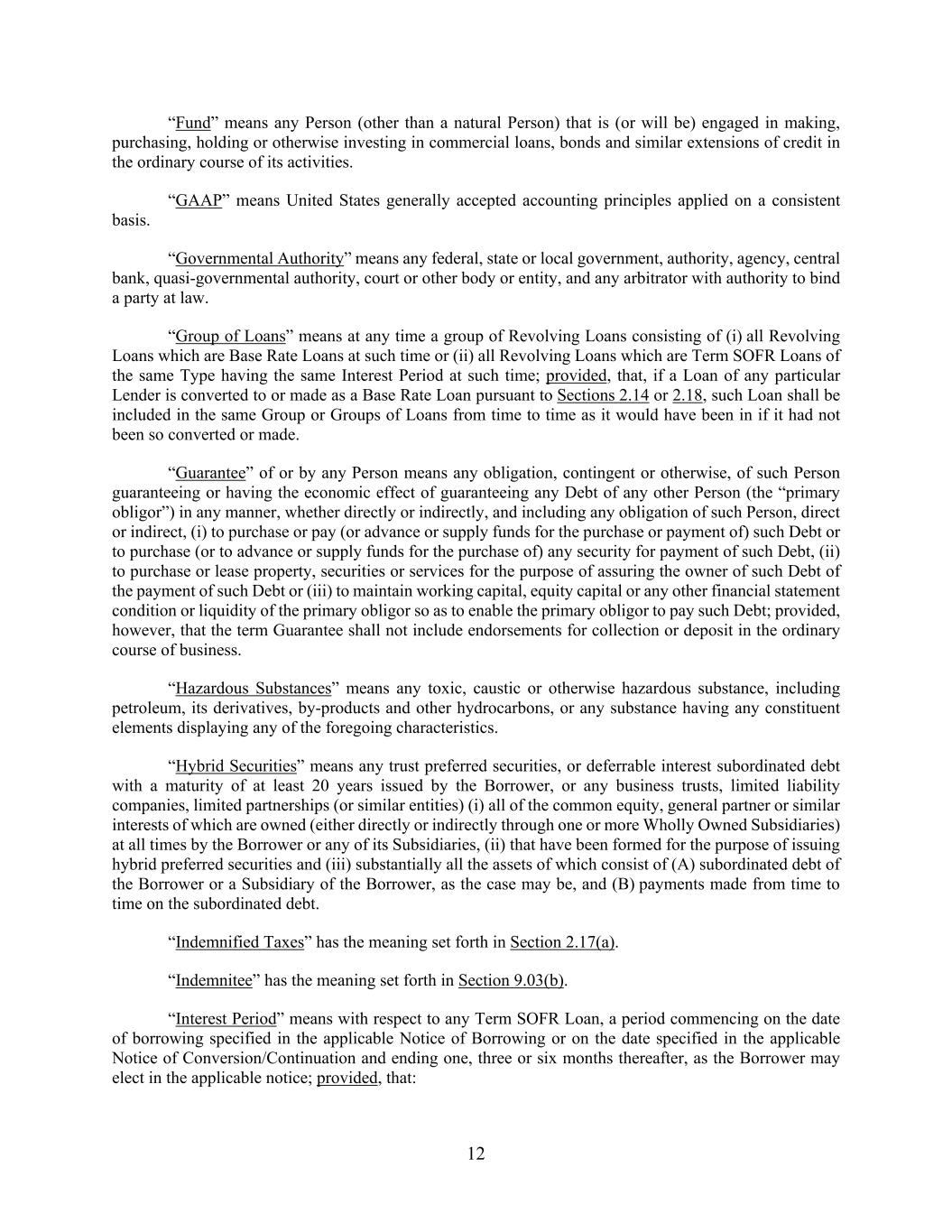 12 “Fund” means any Person (other than a natural Person) that is (or will be) engaged in making, purchasing, holding or otherwise investing in commercial loans, bonds and similar extensions of credit in the ordinary course of its activities. “GAAP” means United States generally accepted accounting principles applied on a consistent basis. “Governmental Authority” means any federal, state or local government, authority, agency, central bank, quasi-governmental authority, court or other body or entity, and any arbitrator with authority to bind a party at law. “Group of Loans” means at any time a group of Revolving Loans consisting of (i) all Revolving Loans which are Base Rate Loans at such time or (ii) all Revolving Loans which are Term SOFR Loans of the same Type having the same Interest Period at such time; provided, that, if a Loan of any particular Lender is converted to or made as a Base Rate Loan pursuant to Sections 2.14 or 2.18, such Loan shall be included in the same Group or Groups of Loans from time to time as it would have been in if it had not been so converted or made. “Guarantee” of or by any Person means any obligation, contingent or otherwise, of such Person guaranteeing or having the economic effect of guaranteeing any Debt of any other Person (the “primary obligor”) in any manner, whether directly or indirectly, and including any obligation of such Person, direct or indirect, (i) to purchase or pay (or advance or supply funds for the purchase or payment of) such Debt or to purchase (or to advance or supply funds for the purchase of) any security for payment of such Debt, (ii) to purchase or lease property, securities or services for the purpose of assuring the owner of such Debt of the payment of such Debt or (iii) to maintain working capital, equity capital or any other financial statement condition or liquidity of the primary obligor so as to enable the primary obligor to pay such Debt; provided, however, that the term Guarantee shall not include endorsements for collection or deposit in the ordinary course of business. “Hazardous Substances” means any toxic, caustic or otherwise hazardous substance, including petroleum, its derivatives, by-products and other hydrocarbons, or any substance having any constituent elements displaying any of the foregoing characteristics. “Hybrid Securities” means any trust preferred securities, or deferrable interest subordinated debt with a maturity of at least 20 years issued by the Borrower, or any business trusts, limited liability companies, limited partnerships (or similar entities) (i) all of the common equity, general partner or similar interests of which are owned (either directly or indirectly through one or more Wholly Owned Subsidiaries) at all times by the Borrower or any of its Subsidiaries, (ii) that have been formed for the purpose of issuing hybrid preferred securities and (iii) substantially all the assets of which consist of (A) subordinated debt of the Borrower or a Subsidiary of the Borrower, as the case may be, and (B) payments made from time to time on the subordinated debt. “Indemnified Taxes” has the meaning set forth in Section 2.17(a). “Indemnitee” has the meaning set forth in Section 9.03(b). “Interest Period” means with respect to any Term SOFR Loan, a period commencing on the date of borrowing specified in the applicable Notice of Borrowing or on the date specified in the applicable Notice of Conversion/Continuation and ending one, three or six months thereafter, as the Borrower may elect in the applicable notice; provided, that: