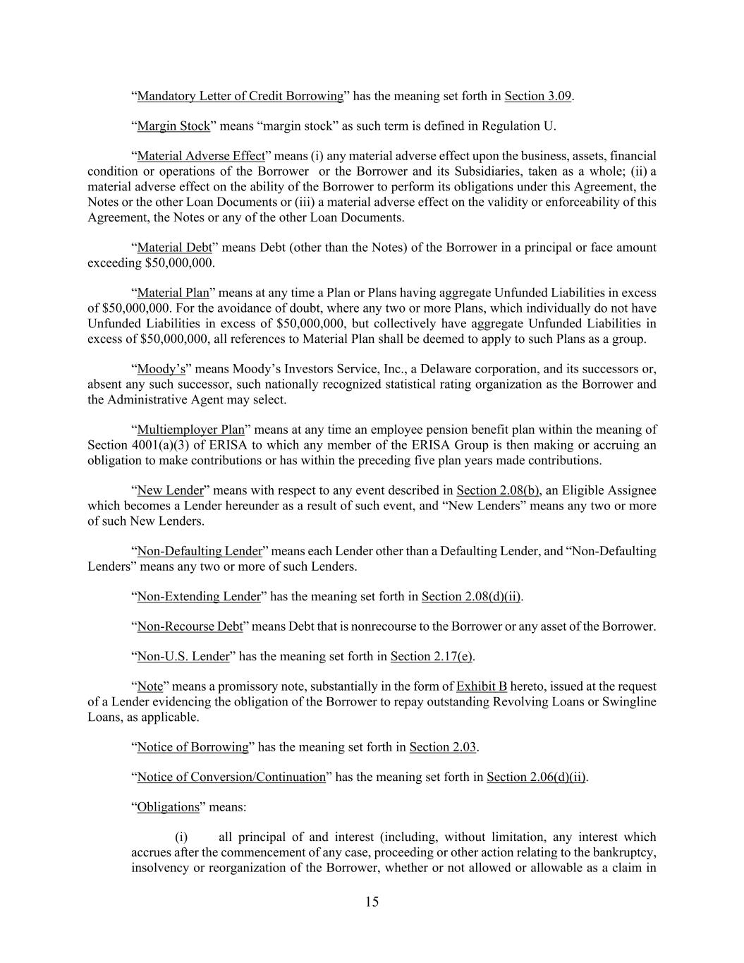 15 “Mandatory Letter of Credit Borrowing” has the meaning set forth in Section 3.09. “Margin Stock” means “margin stock” as such term is defined in Regulation U. “Material Adverse Effect” means (i) any material adverse effect upon the business, assets, financial condition or operations of the Borrower or the Borrower and its Subsidiaries, taken as a whole; (ii) a material adverse effect on the ability of the Borrower to perform its obligations under this Agreement, the Notes or the other Loan Documents or (iii) a material adverse effect on the validity or enforceability of this Agreement, the Notes or any of the other Loan Documents. “Material Debt” means Debt (other than the Notes) of the Borrower in a principal or face amount exceeding $50,000,000. “Material Plan” means at any time a Plan or Plans having aggregate Unfunded Liabilities in excess of $50,000,000. For the avoidance of doubt, where any two or more Plans, which individually do not have Unfunded Liabilities in excess of $50,000,000, but collectively have aggregate Unfunded Liabilities in excess of $50,000,000, all references to Material Plan shall be deemed to apply to such Plans as a group. “Moody’s” means Moody’s Investors Service, Inc., a Delaware corporation, and its successors or, absent any such successor, such nationally recognized statistical rating organization as the Borrower and the Administrative Agent may select. “Multiemployer Plan” means at any time an employee pension benefit plan within the meaning of Section 4001(a)(3) of ERISA to which any member of the ERISA Group is then making or accruing an obligation to make contributions or has within the preceding five plan years made contributions. “New Lender” means with respect to any event described in Section 2.08(b), an Eligible Assignee which becomes a Lender hereunder as a result of such event, and “New Lenders” means any two or more of such New Lenders. “Non-Defaulting Lender” means each Lender other than a Defaulting Lender, and “Non-Defaulting Lenders” means any two or more of such Lenders. “Non-Extending Lender” has the meaning set forth in Section 2.08(d)(ii). “Non-Recourse Debt” means Debt that is nonrecourse to the Borrower or any asset of the Borrower. “Non-U.S. Lender” has the meaning set forth in Section 2.17(e). “Note” means a promissory note, substantially in the form of Exhibit B hereto, issued at the request of a Lender evidencing the obligation of the Borrower to repay outstanding Revolving Loans or Swingline Loans, as applicable. “Notice of Borrowing” has the meaning set forth in Section 2.03. “Notice of Conversion/Continuation” has the meaning set forth in Section 2.06(d)(ii). “Obligations” means: (i) all principal of and interest (including, without limitation, any interest which accrues after the commencement of any case, proceeding or other action relating to the bankruptcy, insolvency or reorganization of the Borrower, whether or not allowed or allowable as a claim in