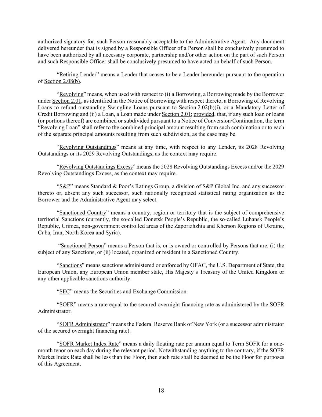 18 authorized signatory for, such Person reasonably acceptable to the Administrative Agent. Any document delivered hereunder that is signed by a Responsible Officer of a Person shall be conclusively presumed to have been authorized by all necessary corporate, partnership and/or other action on the part of such Person and such Responsible Officer shall be conclusively presumed to have acted on behalf of such Person. “Retiring Lender” means a Lender that ceases to be a Lender hereunder pursuant to the operation of Section 2.08(b). “Revolving” means, when used with respect to (i) a Borrowing, a Borrowing made by the Borrower under Section 2.01, as identified in the Notice of Borrowing with respect thereto, a Borrowing of Revolving Loans to refund outstanding Swingline Loans pursuant to Section 2.02(b)(i), or a Mandatory Letter of Credit Borrowing and (ii) a Loan, a Loan made under Section 2.01; provided, that, if any such loan or loans (or portions thereof) are combined or subdivided pursuant to a Notice of Conversion/Continuation, the term “Revolving Loan” shall refer to the combined principal amount resulting from such combination or to each of the separate principal amounts resulting from such subdivision, as the case may be. “Revolving Outstandings” means at any time, with respect to any Lender, its 2028 Revolving Outstandings or its 2029 Revolving Outstandings, as the context may require. “Revolving Outstandings Excess” means the 2028 Revolving Outstandings Excess and/or the 2029 Revolving Outstandings Excess, as the context may require. “S&P” means Standard & Poor’s Ratings Group, a division of S&P Global Inc. and any successor thereto or, absent any such successor, such nationally recognized statistical rating organization as the Borrower and the Administrative Agent may select. “Sanctioned Country” means a country, region or territory that is the subject of comprehensive territorial Sanctions (currently, the so-called Donetsk People’s Republic, the so-called Luhansk People’s Republic, Crimea, non-government controlled areas of the Zaporizhzhia and Kherson Regions of Ukraine, Cuba, Iran, North Korea and Syria). “Sanctioned Person” means a Person that is, or is owned or controlled by Persons that are, (i) the subject of any Sanctions, or (ii) located, organized or resident in a Sanctioned Country. “Sanctions” means sanctions administered or enforced by OFAC, the U.S. Department of State, the European Union, any European Union member state, His Majesty’s Treasury of the United Kingdom or any other applicable sanctions authority. “SEC” means the Securities and Exchange Commission. “SOFR” means a rate equal to the secured overnight financing rate as administered by the SOFR Administrator. “SOFR Administrator” means the Federal Reserve Bank of New York (or a successor administrator of the secured overnight financing rate). “SOFR Market Index Rate” means a daily floating rate per annum equal to Term SOFR for a one- month tenor on each day during the relevant period. Notwithstanding anything to the contrary, if the SOFR Market Index Rate shall be less than the Floor, then such rate shall be deemed to be the Floor for purposes of this Agreement.