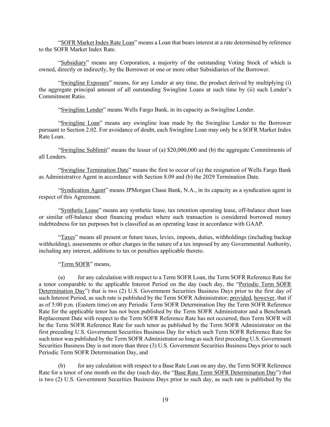 19 “SOFR Market Index Rate Loan” means a Loan that bears interest at a rate determined by reference to the SOFR Market Index Rate. “Subsidiary” means any Corporation, a majority of the outstanding Voting Stock of which is owned, directly or indirectly, by the Borrower or one or more other Subsidiaries of the Borrower. “Swingline Exposure” means, for any Lender at any time, the product derived by multiplying (i) the aggregate principal amount of all outstanding Swingline Loans at such time by (ii) such Lender’s Commitment Ratio. “Swingline Lender” means Wells Fargo Bank, in its capacity as Swingline Lender. “Swingline Loan” means any swingline loan made by the Swingline Lender to the Borrower pursuant to Section 2.02. For avoidance of doubt, each Swingline Loan may only be a SOFR Market Index Rate Loan. “Swingline Sublimit” means the lesser of (a) $20,000,000 and (b) the aggregate Commitments of all Lenders. “Swingline Termination Date” means the first to occur of (a) the resignation of Wells Fargo Bank as Administrative Agent in accordance with Section 8.09 and (b) the 2029 Termination Date. “Syndication Agent” means JPMorgan Chase Bank, N.A., in its capacity as a syndication agent in respect of this Agreement. “Synthetic Lease” means any synthetic lease, tax retention operating lease, off-balance sheet loan or similar off-balance sheet financing product where such transaction is considered borrowed money indebtedness for tax purposes but is classified as an operating lease in accordance with GAAP. “Taxes” means all present or future taxes, levies, imposts, duties, withholdings (including backup withholding), assessments or other charges in the nature of a tax imposed by any Governmental Authority, including any interest, additions to tax or penalties applicable thereto. “Term SOFR” means, (a) for any calculation with respect to a Term SOFR Loan, the Term SOFR Reference Rate for a tenor comparable to the applicable Interest Period on the day (such day, the “Periodic Term SOFR Determination Day”) that is two (2) U.S. Government Securities Business Days prior to the first day of such Interest Period, as such rate is published by the Term SOFR Administrator; provided, however, that if as of 5:00 p.m. (Eastern time) on any Periodic Term SOFR Determination Day the Term SOFR Reference Rate for the applicable tenor has not been published by the Term SOFR Administrator and a Benchmark Replacement Date with respect to the Term SOFR Reference Rate has not occurred, then Term SOFR will be the Term SOFR Reference Rate for such tenor as published by the Term SOFR Administrator on the first preceding U.S. Government Securities Business Day for which such Term SOFR Reference Rate for such tenor was published by the Term SOFR Administrator so long as such first preceding U.S. Government Securities Business Day is not more than three (3) U.S. Government Securities Business Days prior to such Periodic Term SOFR Determination Day, and (b) for any calculation with respect to a Base Rate Loan on any day, the Term SOFR Reference Rate for a tenor of one month on the day (such day, the “Base Rate Term SOFR Determination Day”) that is two (2) U.S. Government Securities Business Days prior to such day, as such rate is published by the