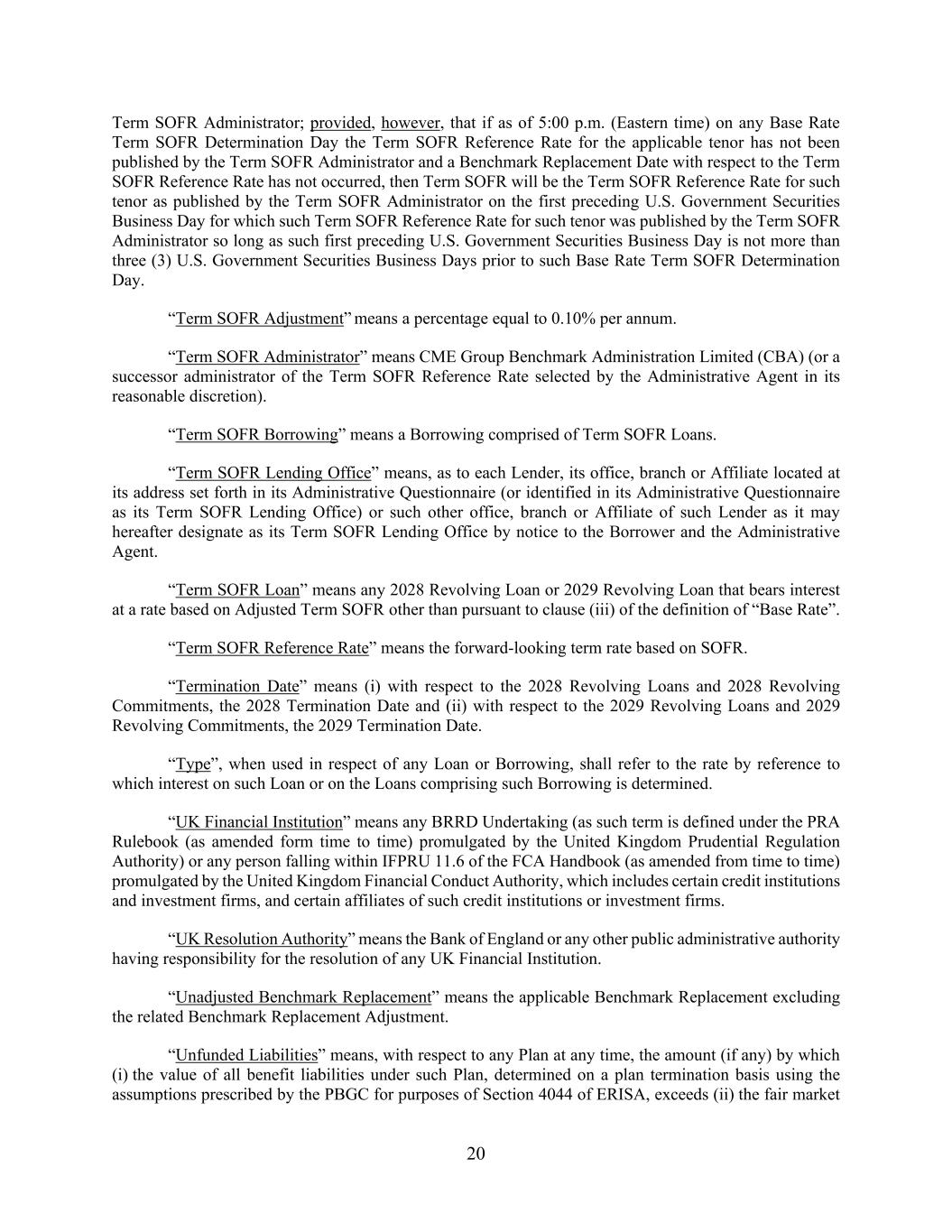 20 Term SOFR Administrator; provided, however, that if as of 5:00 p.m. (Eastern time) on any Base Rate Term SOFR Determination Day the Term SOFR Reference Rate for the applicable tenor has not been published by the Term SOFR Administrator and a Benchmark Replacement Date with respect to the Term SOFR Reference Rate has not occurred, then Term SOFR will be the Term SOFR Reference Rate for such tenor as published by the Term SOFR Administrator on the first preceding U.S. Government Securities Business Day for which such Term SOFR Reference Rate for such tenor was published by the Term SOFR Administrator so long as such first preceding U.S. Government Securities Business Day is not more than three (3) U.S. Government Securities Business Days prior to such Base Rate Term SOFR Determination Day. “Term SOFR Adjustment” means a percentage equal to 0.10% per annum. “Term SOFR Administrator” means CME Group Benchmark Administration Limited (CBA) (or a successor administrator of the Term SOFR Reference Rate selected by the Administrative Agent in its reasonable discretion). “Term SOFR Borrowing” means a Borrowing comprised of Term SOFR Loans. “Term SOFR Lending Office” means, as to each Lender, its office, branch or Affiliate located at its address set forth in its Administrative Questionnaire (or identified in its Administrative Questionnaire as its Term SOFR Lending Office) or such other office, branch or Affiliate of such Lender as it may hereafter designate as its Term SOFR Lending Office by notice to the Borrower and the Administrative Agent. “Term SOFR Loan” means any 2028 Revolving Loan or 2029 Revolving Loan that bears interest at a rate based on Adjusted Term SOFR other than pursuant to clause (iii) of the definition of “Base Rate”. “Term SOFR Reference Rate” means the forward-looking term rate based on SOFR. “Termination Date” means (i) with respect to the 2028 Revolving Loans and 2028 Revolving Commitments, the 2028 Termination Date and (ii) with respect to the 2029 Revolving Loans and 2029 Revolving Commitments, the 2029 Termination Date. “Type”, when used in respect of any Loan or Borrowing, shall refer to the rate by reference to which interest on such Loan or on the Loans comprising such Borrowing is determined. “UK Financial Institution” means any BRRD Undertaking (as such term is defined under the PRA Rulebook (as amended form time to time) promulgated by the United Kingdom Prudential Regulation Authority) or any person falling within IFPRU 11.6 of the FCA Handbook (as amended from time to time) promulgated by the United Kingdom Financial Conduct Authority, which includes certain credit institutions and investment firms, and certain affiliates of such credit institutions or investment firms. “UK Resolution Authority” means the Bank of England or any other public administrative authority having responsibility for the resolution of any UK Financial Institution. “Unadjusted Benchmark Replacement” means the applicable Benchmark Replacement excluding the related Benchmark Replacement Adjustment. “Unfunded Liabilities” means, with respect to any Plan at any time, the amount (if any) by which (i) the value of all benefit liabilities under such Plan, determined on a plan termination basis using the assumptions prescribed by the PBGC for purposes of Section 4044 of ERISA, exceeds (ii) the fair market