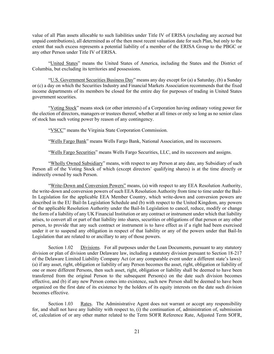 21 value of all Plan assets allocable to such liabilities under Title IV of ERISA (excluding any accrued but unpaid contributions), all determined as of the then most recent valuation date for such Plan, but only to the extent that such excess represents a potential liability of a member of the ERISA Group to the PBGC or any other Person under Title IV of ERISA. “United States” means the United States of America, including the States and the District of Columbia, but excluding its territories and possessions. “U.S. Government Securities Business Day” means any day except for (a) a Saturday, (b) a Sunday or (c) a day on which the Securities Industry and Financial Markets Association recommends that the fixed income departments of its members be closed for the entire day for purposes of trading in United States government securities. “Voting Stock” means stock (or other interests) of a Corporation having ordinary voting power for the election of directors, managers or trustees thereof, whether at all times or only so long as no senior class of stock has such voting power by reason of any contingency. “VSCC” means the Virginia State Corporation Commission. “Wells Fargo Bank” means Wells Fargo Bank, National Association, and its successors. “Wells Fargo Securities” means Wells Fargo Securities, LLC, and its successors and assigns. “Wholly Owned Subsidiary” means, with respect to any Person at any date, any Subsidiary of such Person all of the Voting Stock of which (except directors’ qualifying shares) is at the time directly or indirectly owned by such Person. “Write-Down and Conversion Powers” means, (a) with respect to any EEA Resolution Authority, the write-down and conversion powers of such EEA Resolution Authority from time to time under the Bail- In Legislation for the applicable EEA Member Country, which write-down and conversion powers are described in the EU Bail-In Legislation Schedule and (b) with respect to the United Kingdom, any powers of the applicable Resolution Authority under the Bail-In Legislation to cancel, reduce, modify or change the form of a liability of any UK Financial Institution or any contract or instrument under which that liability arises, to convert all or part of that liability into shares, securities or obligations of that person or any other person, to provide that any such contract or instrument is to have effect as if a right had been exercised under it or to suspend any obligation in respect of that liability or any of the powers under that Bail-In Legislation that are related to or ancillary to any of those powers. Section 1.02 Divisions. For all purposes under the Loan Documents, pursuant to any statutory division or plan of division under Delaware law, including a statutory division pursuant to Section 18-217 of the Delaware Limited Liability Company Act (or any comparable event under a different state’s laws): (a) if any asset, right, obligation or liability of any Person becomes the asset, right, obligation or liability of one or more different Persons, then such asset, right, obligation or liability shall be deemed to have been transferred from the original Person to the subsequent Person(s) on the date such division becomes effective, and (b) if any new Person comes into existence, such new Person shall be deemed to have been organized on the first date of its existence by the holders of its equity interests on the date such division becomes effective. Section 1.03 Rates. The Administrative Agent does not warrant or accept any responsibility for, and shall not have any liability with respect to, (i) the continuation of, administration of, submission of, calculation of or any other matter related to the Term SOFR Reference Rate, Adjusted Term SOFR,