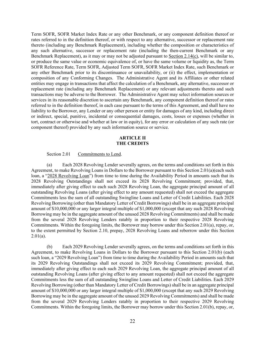 22 Term SOFR, SOFR Market Index Rate or any other Benchmark, or any component definition thereof or rates referred to in the definition thereof, or with respect to any alternative, successor or replacement rate thereto (including any Benchmark Replacement), including whether the composition or characteristics of any such alternative, successor or replacement rate (including the then-current Benchmark or any Benchmark Replacement), as it may or may not be adjusted pursuant to Section 2.14(c), will be similar to, or produce the same value or economic equivalence of, or have the same volume or liquidity as, the Term SOFR Reference Rate, Term SOFR, Adjusted Term SOFR, SOFR Market Index Rate, such Benchmark or any other Benchmark prior to its discontinuance or unavailability, or (ii) the effect, implementation or composition of any Conforming Changes. The Administrative Agent and its Affiliates or other related entities may engage in transactions that affect the calculation of a Benchmark, any alternative, successor or replacement rate (including any Benchmark Replacement) or any relevant adjustments thereto and such transactions may be adverse to the Borrower. The Administrative Agent may select information sources or services in its reasonable discretion to ascertain any Benchmark, any component definition thereof or rates referred to in the definition thereof, in each case pursuant to the terms of this Agreement, and shall have no liability to the Borrower, any Lender or any other person or entity for damages of any kind, including direct or indirect, special, punitive, incidental or consequential damages, costs, losses or expenses (whether in tort, contract or otherwise and whether at law or in equity), for any error or calculation of any such rate (or component thereof) provided by any such information source or service. ARTICLE II THE CREDITS Section 2.01 Commitments to Lend. (a) Each 2028 Revolving Lender severally agrees, on the terms and conditions set forth in this Agreement, to make Revolving Loans in Dollars to the Borrower pursuant to this Section 2.01(a)(each such loan, a “2028 Revolving Loan”) from time to time during the Availability Period in amounts such that its 2028 Revolving Outstandings shall not exceed its 2028 Revolving Commitment; provided, that, immediately after giving effect to each such 2028 Revolving Loan, the aggregate principal amount of all outstanding Revolving Loans (after giving effect to any amount requested) shall not exceed the aggregate Commitments less the sum of all outstanding Swingline Loans and Letter of Credit Liabilities. Each 2028 Revolving Borrowing (other than Mandatory Letter of Credit Borrowings) shall be in an aggregate principal amount of $10,000,000 or any larger integral multiple of $1,000,000 (except that any such 2028 Revolving Borrowing may be in the aggregate amount of the unused 2028 Revolving Commitments) and shall be made from the several 2028 Revolving Lenders ratably in proportion to their respective 2028 Revolving Commitments. Within the foregoing limits, the Borrower may borrow under this Section 2.01(a), repay, or, to the extent permitted by Section 2.10, prepay, 2028 Revolving Loans and reborrow under this Section 2.01(a). (b) Each 2029 Revolving Lender severally agrees, on the terms and conditions set forth in this Agreement, to make Revolving Loans in Dollars to the Borrower pursuant to this Section 2.01(b) (each such loan, a “2029 Revolving Loan”) from time to time during the Availability Period in amounts such that its 2029 Revolving Outstandings shall not exceed its 2029 Revolving Commitment; provided, that, immediately after giving effect to each such 2029 Revolving Loan, the aggregate principal amount of all outstanding Revolving Loans (after giving effect to any amount requested) shall not exceed the aggregate Commitments less the sum of all outstanding Swingline Loans and Letter of Credit Liabilities. Each 2029 Revolving Borrowing (other than Mandatory Letter of Credit Borrowings) shall be in an aggregate principal amount of $10,000,000 or any larger integral multiple of $1,000,000 (except that any such 2029 Revolving Borrowing may be in the aggregate amount of the unused 2029 Revolving Commitments) and shall be made from the several 2029 Revolving Lenders ratably in proportion to their respective 2029 Revolving Commitments. Within the foregoing limits, the Borrower may borrow under this Section 2.01(b), repay, or,