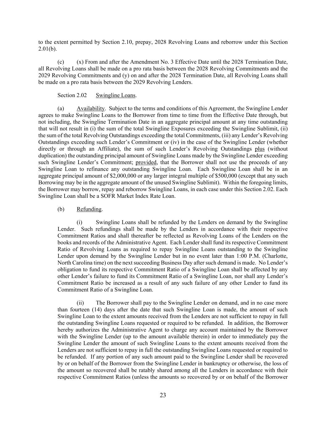 23 to the extent permitted by Section 2.10, prepay, 2028 Revolving Loans and reborrow under this Section 2.01(b). (c) (x) From and after the Amendment No. 3 Effective Date until the 2028 Termination Date, all Revolving Loans shall be made on a pro rata basis between the 2028 Revolving Commitments and the 2029 Revolving Commitments and (y) on and after the 2028 Termination Date, all Revolving Loans shall be made on a pro rata basis between the 2029 Revolving Lenders. Section 2.02 Swingline Loans. (a) Availability. Subject to the terms and conditions of this Agreement, the Swingline Lender agrees to make Swingline Loans to the Borrower from time to time from the Effective Date through, but not including, the Swingline Termination Date in an aggregate principal amount at any time outstanding that will not result in (i) the sum of the total Swingline Exposures exceeding the Swingline Sublimit, (ii) the sum of the total Revolving Outstandings exceeding the total Commitments, (iii) any Lender’s Revolving Outstandings exceeding such Lender’s Commitment or (iv) in the case of the Swingline Lender (whether directly or through an Affiliate), the sum of such Lender’s Revolving Outstandings plus (without duplication) the outstanding principal amount of Swingline Loans made by the Swingline Lender exceeding such Swingline Lender’s Commitment; provided, that the Borrower shall not use the proceeds of any Swingline Loan to refinance any outstanding Swingline Loan. Each Swingline Loan shall be in an aggregate principal amount of $2,000,000 or any larger integral multiple of $500,000 (except that any such Borrowing may be in the aggregate amount of the unused Swingline Sublimit). Within the foregoing limits, the Borrower may borrow, repay and reborrow Swingline Loans, in each case under this Section 2.02. Each Swingline Loan shall be a SOFR Market Index Rate Loan. (b) Refunding. (i) Swingline Loans shall be refunded by the Lenders on demand by the Swingline Lender. Such refundings shall be made by the Lenders in accordance with their respective Commitment Ratios and shall thereafter be reflected as Revolving Loans of the Lenders on the books and records of the Administrative Agent. Each Lender shall fund its respective Commitment Ratio of Revolving Loans as required to repay Swingline Loans outstanding to the Swingline Lender upon demand by the Swingline Lender but in no event later than 1:00 P.M. (Charlotte, North Carolina time) on the next succeeding Business Day after such demand is made. No Lender’s obligation to fund its respective Commitment Ratio of a Swingline Loan shall be affected by any other Lender’s failure to fund its Commitment Ratio of a Swingline Loan, nor shall any Lender’s Commitment Ratio be increased as a result of any such failure of any other Lender to fund its Commitment Ratio of a Swingline Loan. (ii) The Borrower shall pay to the Swingline Lender on demand, and in no case more than fourteen (14) days after the date that such Swingline Loan is made, the amount of such Swingline Loan to the extent amounts received from the Lenders are not sufficient to repay in full the outstanding Swingline Loans requested or required to be refunded. In addition, the Borrower hereby authorizes the Administrative Agent to charge any account maintained by the Borrower with the Swingline Lender (up to the amount available therein) in order to immediately pay the Swingline Lender the amount of such Swingline Loans to the extent amounts received from the Lenders are not sufficient to repay in full the outstanding Swingline Loans requested or required to be refunded. If any portion of any such amount paid to the Swingline Lender shall be recovered by or on behalf of the Borrower from the Swingline Lender in bankruptcy or otherwise, the loss of the amount so recovered shall be ratably shared among all the Lenders in accordance with their respective Commitment Ratios (unless the amounts so recovered by or on behalf of the Borrower