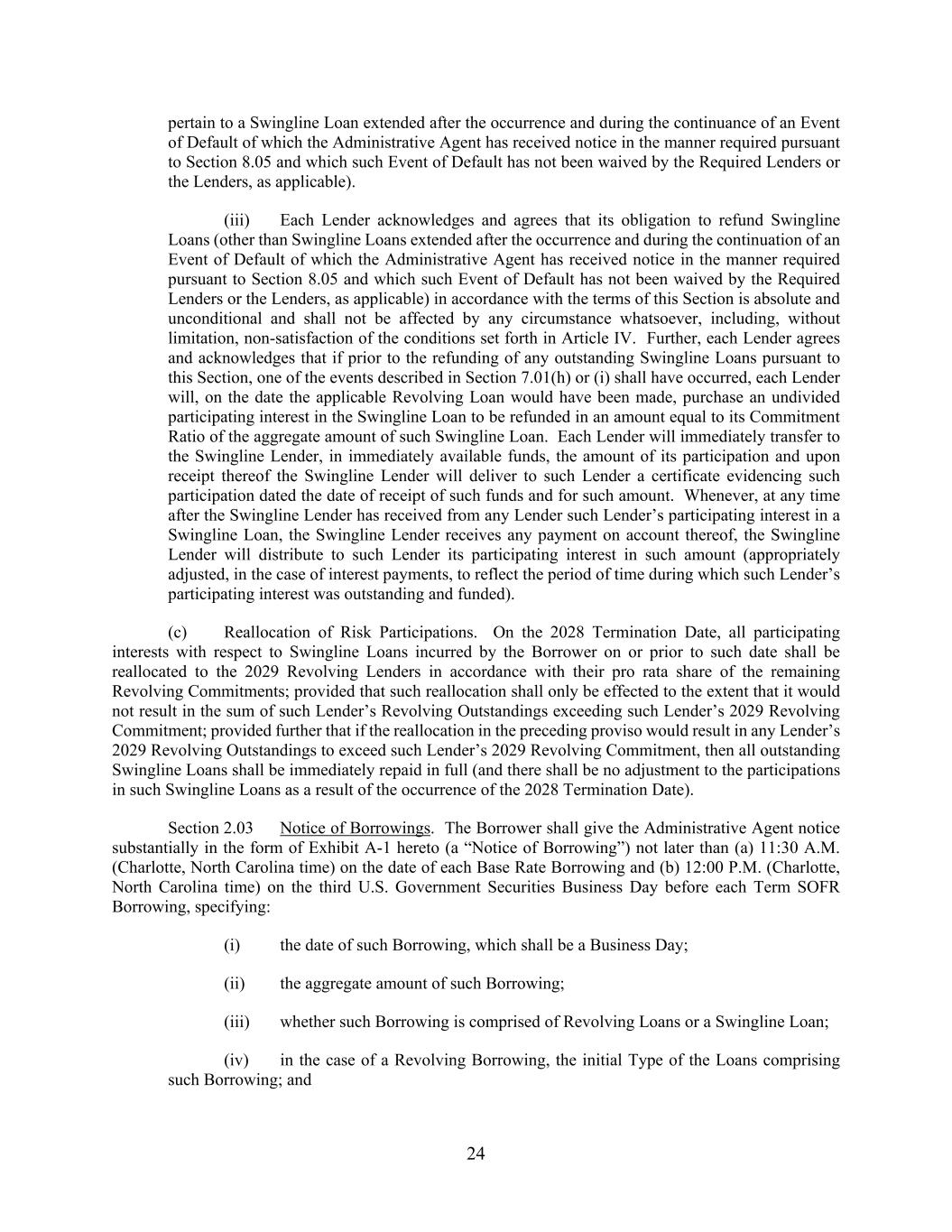 24 pertain to a Swingline Loan extended after the occurrence and during the continuance of an Event of Default of which the Administrative Agent has received notice in the manner required pursuant to Section 8.05 and which such Event of Default has not been waived by the Required Lenders or the Lenders, as applicable). (iii) Each Lender acknowledges and agrees that its obligation to refund Swingline Loans (other than Swingline Loans extended after the occurrence and during the continuation of an Event of Default of which the Administrative Agent has received notice in the manner required pursuant to Section 8.05 and which such Event of Default has not been waived by the Required Lenders or the Lenders, as applicable) in accordance with the terms of this Section is absolute and unconditional and shall not be affected by any circumstance whatsoever, including, without limitation, non-satisfaction of the conditions set forth in Article IV. Further, each Lender agrees and acknowledges that if prior to the refunding of any outstanding Swingline Loans pursuant to this Section, one of the events described in Section 7.01(h) or (i) shall have occurred, each Lender will, on the date the applicable Revolving Loan would have been made, purchase an undivided participating interest in the Swingline Loan to be refunded in an amount equal to its Commitment Ratio of the aggregate amount of such Swingline Loan. Each Lender will immediately transfer to the Swingline Lender, in immediately available funds, the amount of its participation and upon receipt thereof the Swingline Lender will deliver to such Lender a certificate evidencing such participation dated the date of receipt of such funds and for such amount. Whenever, at any time after the Swingline Lender has received from any Lender such Lender’s participating interest in a Swingline Loan, the Swingline Lender receives any payment on account thereof, the Swingline Lender will distribute to such Lender its participating interest in such amount (appropriately adjusted, in the case of interest payments, to reflect the period of time during which such Lender’s participating interest was outstanding and funded). (c) Reallocation of Risk Participations. On the 2028 Termination Date, all participating interests with respect to Swingline Loans incurred by the Borrower on or prior to such date shall be reallocated to the 2029 Revolving Lenders in accordance with their pro rata share of the remaining Revolving Commitments; provided that such reallocation shall only be effected to the extent that it would not result in the sum of such Lender’s Revolving Outstandings exceeding such Lender’s 2029 Revolving Commitment; provided further that if the reallocation in the preceding proviso would result in any Lender’s 2029 Revolving Outstandings to exceed such Lender’s 2029 Revolving Commitment, then all outstanding Swingline Loans shall be immediately repaid in full (and there shall be no adjustment to the participations in such Swingline Loans as a result of the occurrence of the 2028 Termination Date). Section 2.03 Notice of Borrowings. The Borrower shall give the Administrative Agent notice substantially in the form of Exhibit A-1 hereto (a “Notice of Borrowing”) not later than (a) 11:30 A.M. (Charlotte, North Carolina time) on the date of each Base Rate Borrowing and (b) 12:00 P.M. (Charlotte, North Carolina time) on the third U.S. Government Securities Business Day before each Term SOFR Borrowing, specifying: (i) the date of such Borrowing, which shall be a Business Day; (ii) the aggregate amount of such Borrowing; (iii) whether such Borrowing is comprised of Revolving Loans or a Swingline Loan; (iv) in the case of a Revolving Borrowing, the initial Type of the Loans comprising such Borrowing; and