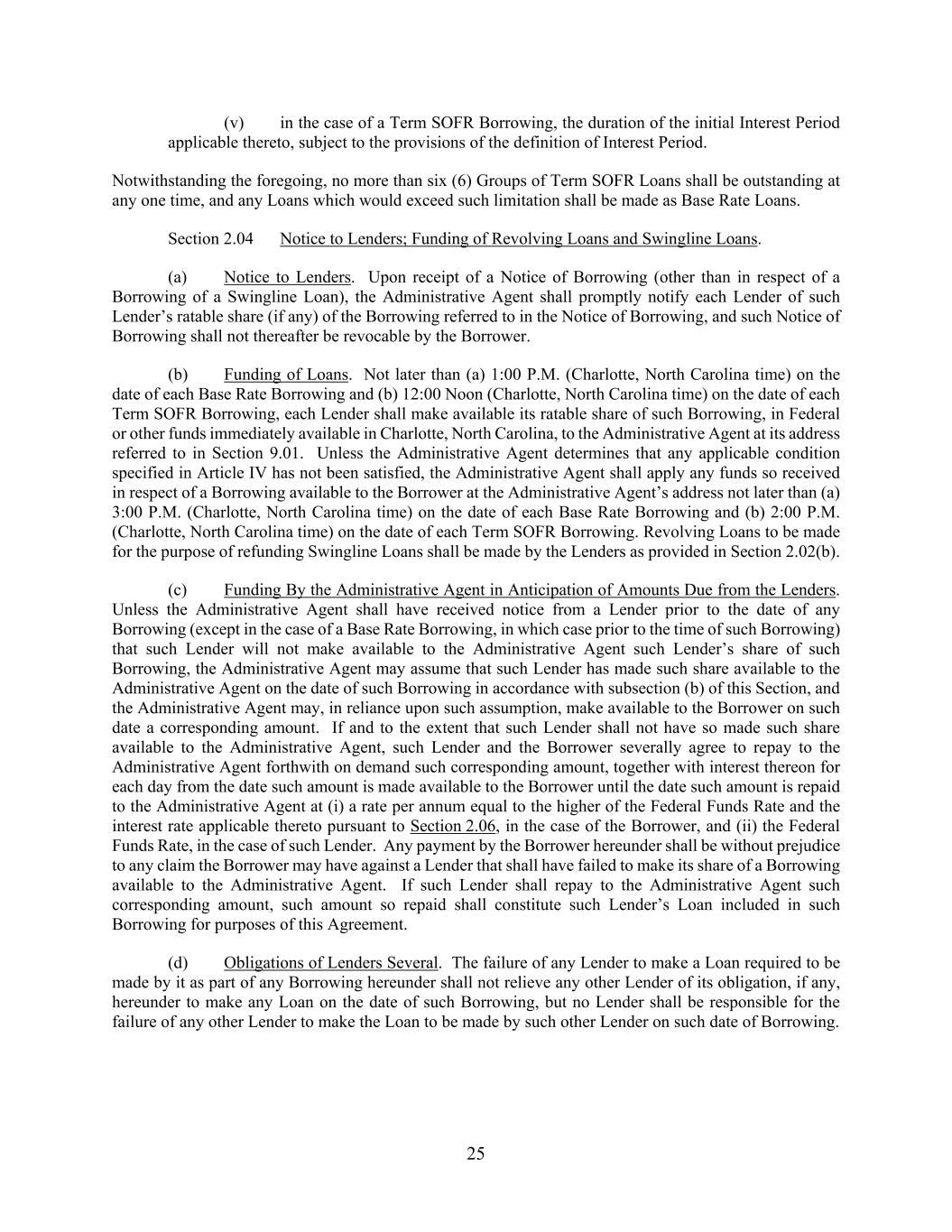 25 (v) in the case of a Term SOFR Borrowing, the duration of the initial Interest Period applicable thereto, subject to the provisions of the definition of Interest Period. Notwithstanding the foregoing, no more than six (6) Groups of Term SOFR Loans shall be outstanding at any one time, and any Loans which would exceed such limitation shall be made as Base Rate Loans. Section 2.04 Notice to Lenders; Funding of Revolving Loans and Swingline Loans. (a) Notice to Lenders. Upon receipt of a Notice of Borrowing (other than in respect of a Borrowing of a Swingline Loan), the Administrative Agent shall promptly notify each Lender of such Lender’s ratable share (if any) of the Borrowing referred to in the Notice of Borrowing, and such Notice of Borrowing shall not thereafter be revocable by the Borrower. (b) Funding of Loans. Not later than (a) 1:00 P.M. (Charlotte, North Carolina time) on the date of each Base Rate Borrowing and (b) 12:00 Noon (Charlotte, North Carolina time) on the date of each Term SOFR Borrowing, each Lender shall make available its ratable share of such Borrowing, in Federal or other funds immediately available in Charlotte, North Carolina, to the Administrative Agent at its address referred to in Section 9.01. Unless the Administrative Agent determines that any applicable condition specified in Article IV has not been satisfied, the Administrative Agent shall apply any funds so received in respect of a Borrowing available to the Borrower at the Administrative Agent’s address not later than (a) 3:00 P.M. (Charlotte, North Carolina time) on the date of each Base Rate Borrowing and (b) 2:00 P.M. (Charlotte, North Carolina time) on the date of each Term SOFR Borrowing. Revolving Loans to be made for the purpose of refunding Swingline Loans shall be made by the Lenders as provided in Section 2.02(b). (c) Funding By the Administrative Agent in Anticipation of Amounts Due from the Lenders. Unless the Administrative Agent shall have received notice from a Lender prior to the date of any Borrowing (except in the case of a Base Rate Borrowing, in which case prior to the time of such Borrowing) that such Lender will not make available to the Administrative Agent such Lender’s share of such Borrowing, the Administrative Agent may assume that such Lender has made such share available to the Administrative Agent on the date of such Borrowing in accordance with subsection (b) of this Section, and the Administrative Agent may, in reliance upon such assumption, make available to the Borrower on such date a corresponding amount. If and to the extent that such Lender shall not have so made such share available to the Administrative Agent, such Lender and the Borrower severally agree to repay to the Administrative Agent forthwith on demand such corresponding amount, together with interest thereon for each day from the date such amount is made available to the Borrower until the date such amount is repaid to the Administrative Agent at (i) a rate per annum equal to the higher of the Federal Funds Rate and the interest rate applicable thereto pursuant to Section 2.06, in the case of the Borrower, and (ii) the Federal Funds Rate, in the case of such Lender. Any payment by the Borrower hereunder shall be without prejudice to any claim the Borrower may have against a Lender that shall have failed to make its share of a Borrowing available to the Administrative Agent. If such Lender shall repay to the Administrative Agent such corresponding amount, such amount so repaid shall constitute such Lender’s Loan included in such Borrowing for purposes of this Agreement. (d) Obligations of Lenders Several. The failure of any Lender to make a Loan required to be made by it as part of any Borrowing hereunder shall not relieve any other Lender of its obligation, if any, hereunder to make any Loan on the date of such Borrowing, but no Lender shall be responsible for the failure of any other Lender to make the Loan to be made by such other Lender on such date of Borrowing.