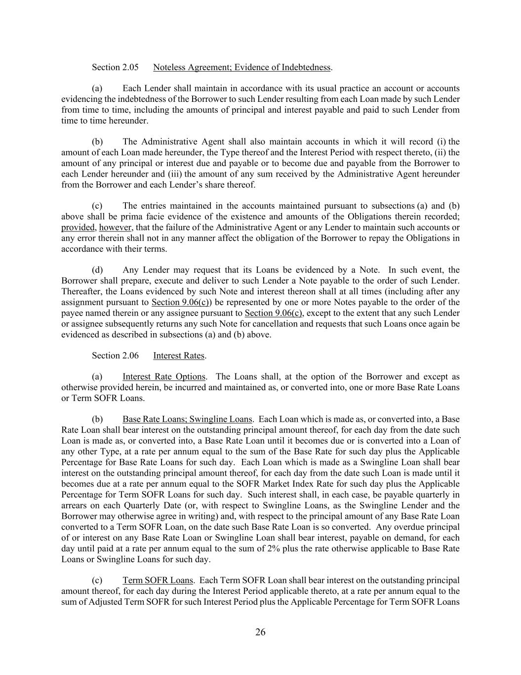 26 Section 2.05 Noteless Agreement; Evidence of Indebtedness. (a) Each Lender shall maintain in accordance with its usual practice an account or accounts evidencing the indebtedness of the Borrower to such Lender resulting from each Loan made by such Lender from time to time, including the amounts of principal and interest payable and paid to such Lender from time to time hereunder. (b) The Administrative Agent shall also maintain accounts in which it will record (i) the amount of each Loan made hereunder, the Type thereof and the Interest Period with respect thereto, (ii) the amount of any principal or interest due and payable or to become due and payable from the Borrower to each Lender hereunder and (iii) the amount of any sum received by the Administrative Agent hereunder from the Borrower and each Lender’s share thereof. (c) The entries maintained in the accounts maintained pursuant to subsections (a) and (b) above shall be prima facie evidence of the existence and amounts of the Obligations therein recorded; provided, however, that the failure of the Administrative Agent or any Lender to maintain such accounts or any error therein shall not in any manner affect the obligation of the Borrower to repay the Obligations in accordance with their terms. (d) Any Lender may request that its Loans be evidenced by a Note. In such event, the Borrower shall prepare, execute and deliver to such Lender a Note payable to the order of such Lender. Thereafter, the Loans evidenced by such Note and interest thereon shall at all times (including after any assignment pursuant to Section 9.06(c)) be represented by one or more Notes payable to the order of the payee named therein or any assignee pursuant to Section 9.06(c), except to the extent that any such Lender or assignee subsequently returns any such Note for cancellation and requests that such Loans once again be evidenced as described in subsections (a) and (b) above. Section 2.06 Interest Rates. (a) Interest Rate Options. The Loans shall, at the option of the Borrower and except as otherwise provided herein, be incurred and maintained as, or converted into, one or more Base Rate Loans or Term SOFR Loans. (b) Base Rate Loans; Swingline Loans. Each Loan which is made as, or converted into, a Base Rate Loan shall bear interest on the outstanding principal amount thereof, for each day from the date such Loan is made as, or converted into, a Base Rate Loan until it becomes due or is converted into a Loan of any other Type, at a rate per annum equal to the sum of the Base Rate for such day plus the Applicable Percentage for Base Rate Loans for such day. Each Loan which is made as a Swingline Loan shall bear interest on the outstanding principal amount thereof, for each day from the date such Loan is made until it becomes due at a rate per annum equal to the SOFR Market Index Rate for such day plus the Applicable Percentage for Term SOFR Loans for such day. Such interest shall, in each case, be payable quarterly in arrears on each Quarterly Date (or, with respect to Swingline Loans, as the Swingline Lender and the Borrower may otherwise agree in writing) and, with respect to the principal amount of any Base Rate Loan converted to a Term SOFR Loan, on the date such Base Rate Loan is so converted. Any overdue principal of or interest on any Base Rate Loan or Swingline Loan shall bear interest, payable on demand, for each day until paid at a rate per annum equal to the sum of 2% plus the rate otherwise applicable to Base Rate Loans or Swingline Loans for such day. (c) Term SOFR Loans. Each Term SOFR Loan shall bear interest on the outstanding principal amount thereof, for each day during the Interest Period applicable thereto, at a rate per annum equal to the sum of Adjusted Term SOFR for such Interest Period plus the Applicable Percentage for Term SOFR Loans