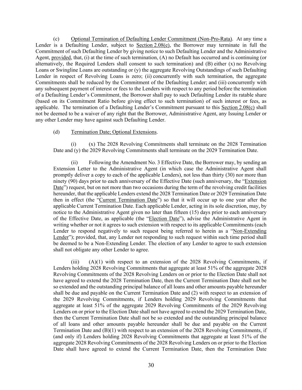30 (c) Optional Termination of Defaulting Lender Commitment (Non-Pro-Rata). At any time a Lender is a Defaulting Lender, subject to Section 2.08(e), the Borrower may terminate in full the Commitment of such Defaulting Lender by giving notice to such Defaulting Lender and the Administrative Agent, provided, that, (i) at the time of such termination, (A) no Default has occurred and is continuing (or alternatively, the Required Lenders shall consent to such termination) and (B) either (x) no Revolving Loans or Swingline Loans are outstanding or (y) the aggregate Revolving Outstandings of such Defaulting Lender in respect of Revolving Loans is zero; (ii) concurrently with such termination, the aggregate Commitments shall be reduced by the Commitment of the Defaulting Lender; and (iii) concurrently with any subsequent payment of interest or fees to the Lenders with respect to any period before the termination of a Defaulting Lender’s Commitment, the Borrower shall pay to such Defaulting Lender its ratable share (based on its Commitment Ratio before giving effect to such termination) of such interest or fees, as applicable. The termination of a Defaulting Lender’s Commitment pursuant to this Section 2.08(c) shall not be deemed to be a waiver of any right that the Borrower, Administrative Agent, any Issuing Lender or any other Lender may have against such Defaulting Lender. (d) Termination Date; Optional Extensions. (i) (x) The 2028 Revolving Commitments shall terminate on the 2028 Termination Date and (y) the 2029 Revolving Commitments shall terminate on the 2029 Termination Date. (ii) Following the Amendment No. 3 Effective Date, the Borrower may, by sending an Extension Letter to the Administrative Agent (in which case the Administrative Agent shall promptly deliver a copy to each of the applicable Lenders), not less than thirty (30) nor more than ninety (90) days prior to each anniversary of the Effective Date (such anniversary, the “Extension Date”) request, but on not more than two occasions during the term of the revolving credit facilities hereunder, that the applicable Lenders extend the 2028 Termination Date or 2029 Termination Date then in effect (the “Current Termination Date”) so that it will occur up to one year after the applicable Current Termination Date. Each applicable Lender, acting in its sole discretion, may, by notice to the Administrative Agent given no later than fifteen (15) days prior to each anniversary of the Effective Date, as applicable (the “Election Date”), advise the Administrative Agent in writing whether or not it agrees to such extension with respect to its applicable Commitments (each Lender to respond negatively to such request being referred to herein as a “Non-Extending Lender”); provided, that, any Lender not responding to such request within such time period shall be deemed to be a Non-Extending Lender. The election of any Lender to agree to such extension shall not obligate any other Lender to agree. (iii) (A)(1) with respect to an extension of the 2028 Revolving Commitments, if Lenders holding 2028 Revolving Commitments that aggregate at least 51% of the aggregate 2028 Revolving Commitments of the 2028 Revolving Lenders on or prior to the Election Date shall not have agreed to extend the 2028 Termination Date, then the Current Termination Date shall not be so extended and the outstanding principal balance of all loans and other amounts payable hereunder shall be due and payable on the Current Termination Date and (2) with respect to an extension of the 2029 Revolving Commitments, if Lenders holding 2029 Revolving Commitments that aggregate at least 51% of the aggregate 2029 Revolving Commitments of the 2029 Revolving Lenders on or prior to the Election Date shall not have agreed to extend the 2029 Termination Date, then the Current Termination Date shall not be so extended and the outstanding principal balance of all loans and other amounts payable hereunder shall be due and payable on the Current Termination Date and (B)(1) with respect to an extension of the 2028 Revolving Commitments, if (and only if) Lenders holding 2028 Revolving Commitments that aggregate at least 51% of the aggregate 2028 Revolving Commitments of the 2028 Revolving Lenders on or prior to the Election Date shall have agreed to extend the Current Termination Date, then the Termination Date