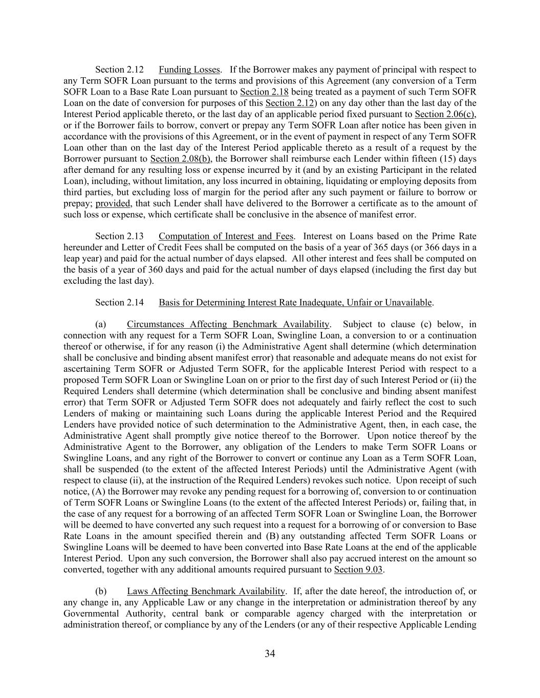34 Section 2.12 Funding Losses. If the Borrower makes any payment of principal with respect to any Term SOFR Loan pursuant to the terms and provisions of this Agreement (any conversion of a Term SOFR Loan to a Base Rate Loan pursuant to Section 2.18 being treated as a payment of such Term SOFR Loan on the date of conversion for purposes of this Section 2.12) on any day other than the last day of the Interest Period applicable thereto, or the last day of an applicable period fixed pursuant to Section 2.06(c), or if the Borrower fails to borrow, convert or prepay any Term SOFR Loan after notice has been given in accordance with the provisions of this Agreement, or in the event of payment in respect of any Term SOFR Loan other than on the last day of the Interest Period applicable thereto as a result of a request by the Borrower pursuant to Section 2.08(b), the Borrower shall reimburse each Lender within fifteen (15) days after demand for any resulting loss or expense incurred by it (and by an existing Participant in the related Loan), including, without limitation, any loss incurred in obtaining, liquidating or employing deposits from third parties, but excluding loss of margin for the period after any such payment or failure to borrow or prepay; provided, that such Lender shall have delivered to the Borrower a certificate as to the amount of such loss or expense, which certificate shall be conclusive in the absence of manifest error. Section 2.13 Computation of Interest and Fees. Interest on Loans based on the Prime Rate hereunder and Letter of Credit Fees shall be computed on the basis of a year of 365 days (or 366 days in a leap year) and paid for the actual number of days elapsed. All other interest and fees shall be computed on the basis of a year of 360 days and paid for the actual number of days elapsed (including the first day but excluding the last day). Section 2.14 Basis for Determining Interest Rate Inadequate, Unfair or Unavailable. (a) Circumstances Affecting Benchmark Availability. Subject to clause (c) below, in connection with any request for a Term SOFR Loan, Swingline Loan, a conversion to or a continuation thereof or otherwise, if for any reason (i) the Administrative Agent shall determine (which determination shall be conclusive and binding absent manifest error) that reasonable and adequate means do not exist for ascertaining Term SOFR or Adjusted Term SOFR, for the applicable Interest Period with respect to a proposed Term SOFR Loan or Swingline Loan on or prior to the first day of such Interest Period or (ii) the Required Lenders shall determine (which determination shall be conclusive and binding absent manifest error) that Term SOFR or Adjusted Term SOFR does not adequately and fairly reflect the cost to such Lenders of making or maintaining such Loans during the applicable Interest Period and the Required Lenders have provided notice of such determination to the Administrative Agent, then, in each case, the Administrative Agent shall promptly give notice thereof to the Borrower. Upon notice thereof by the Administrative Agent to the Borrower, any obligation of the Lenders to make Term SOFR Loans or Swingline Loans, and any right of the Borrower to convert or continue any Loan as a Term SOFR Loan, shall be suspended (to the extent of the affected Interest Periods) until the Administrative Agent (with respect to clause (ii), at the instruction of the Required Lenders) revokes such notice. Upon receipt of such notice, (A) the Borrower may revoke any pending request for a borrowing of, conversion to or continuation of Term SOFR Loans or Swingline Loans (to the extent of the affected Interest Periods) or, failing that, in the case of any request for a borrowing of an affected Term SOFR Loan or Swingline Loan, the Borrower will be deemed to have converted any such request into a request for a borrowing of or conversion to Base Rate Loans in the amount specified therein and (B) any outstanding affected Term SOFR Loans or Swingline Loans will be deemed to have been converted into Base Rate Loans at the end of the applicable Interest Period. Upon any such conversion, the Borrower shall also pay accrued interest on the amount so converted, together with any additional amounts required pursuant to Section 9.03. (b) Laws Affecting Benchmark Availability. If, after the date hereof, the introduction of, or any change in, any Applicable Law or any change in the interpretation or administration thereof by any Governmental Authority, central bank or comparable agency charged with the interpretation or administration thereof, or compliance by any of the Lenders (or any of their respective Applicable Lending