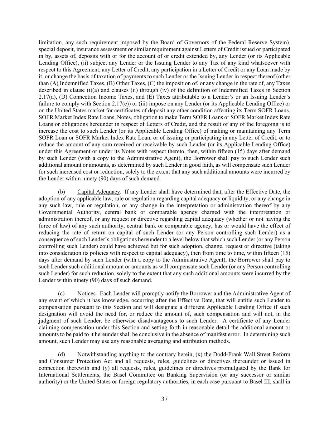 37 limitation, any such requirement imposed by the Board of Governors of the Federal Reserve System), special deposit, insurance assessment or similar requirement against Letters of Credit issued or participated in by, assets of, deposits with or for the account of or credit extended by, any Lender (or its Applicable Lending Office), (ii) subject any Lender or the Issuing Lender to any Tax of any kind whatsoever with respect to this Agreement, any Letter of Credit, any participation in a Letter of Credit or any Loan made by it, or change the basis of taxation of payments to such Lender or the Issuing Lender in respect thereof (other than (A) Indemnified Taxes, (B) Other Taxes, (C) the imposition of, or any change in the rate of, any Taxes described in clause (i)(a) and clauses (ii) through (iv) of the definition of Indemnified Taxes in Section 2.17(a), (D) Connection Income Taxes, and (E) Taxes attributable to a Lender’s or an Issuing Lender’s failure to comply with Section 2.17(e)) or (iii) impose on any Lender (or its Applicable Lending Office) or on the United States market for certificates of deposit any other condition affecting its Term SOFR Loans, SOFR Market Index Rate Loans, Notes, obligation to make Term SOFR Loans or SOFR Market Index Rate Loans or obligations hereunder in respect of Letters of Credit, and the result of any of the foregoing is to increase the cost to such Lender (or its Applicable Lending Office) of making or maintaining any Term SOFR Loan or SOFR Market Index Rate Loan, or of issuing or participating in any Letter of Credit, or to reduce the amount of any sum received or receivable by such Lender (or its Applicable Lending Office) under this Agreement or under its Notes with respect thereto, then, within fifteen (15) days after demand by such Lender (with a copy to the Administrative Agent), the Borrower shall pay to such Lender such additional amount or amounts, as determined by such Lender in good faith, as will compensate such Lender for such increased cost or reduction, solely to the extent that any such additional amounts were incurred by the Lender within ninety (90) days of such demand. (b) Capital Adequacy. If any Lender shall have determined that, after the Effective Date, the adoption of any applicable law, rule or regulation regarding capital adequacy or liquidity, or any change in any such law, rule or regulation, or any change in the interpretation or administration thereof by any Governmental Authority, central bank or comparable agency charged with the interpretation or administration thereof, or any request or directive regarding capital adequacy (whether or not having the force of law) of any such authority, central bank or comparable agency, has or would have the effect of reducing the rate of return on capital of such Lender (or any Person controlling such Lender) as a consequence of such Lender’s obligations hereunder to a level below that which such Lender (or any Person controlling such Lender) could have achieved but for such adoption, change, request or directive (taking into consideration its policies with respect to capital adequacy), then from time to time, within fifteen (15) days after demand by such Lender (with a copy to the Administrative Agent), the Borrower shall pay to such Lender such additional amount or amounts as will compensate such Lender (or any Person controlling such Lender) for such reduction, solely to the extent that any such additional amounts were incurred by the Lender within ninety (90) days of such demand. (c) Notices. Each Lender will promptly notify the Borrower and the Administrative Agent of any event of which it has knowledge, occurring after the Effective Date, that will entitle such Lender to compensation pursuant to this Section and will designate a different Applicable Lending Office if such designation will avoid the need for, or reduce the amount of, such compensation and will not, in the judgment of such Lender, be otherwise disadvantageous to such Lender. A certificate of any Lender claiming compensation under this Section and setting forth in reasonable detail the additional amount or amounts to be paid to it hereunder shall be conclusive in the absence of manifest error. In determining such amount, such Lender may use any reasonable averaging and attribution methods. (d) Notwithstanding anything to the contrary herein, (x) the Dodd-Frank Wall Street Reform and Consumer Protection Act and all requests, rules, guidelines or directives thereunder or issued in connection therewith and (y) all requests, rules, guidelines or directives promulgated by the Bank for International Settlements, the Basel Committee on Banking Supervision (or any successor or similar authority) or the United States or foreign regulatory authorities, in each case pursuant to Basel III, shall in