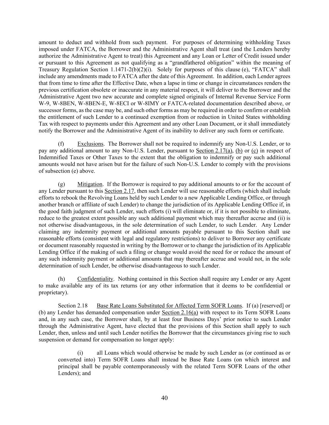 40 amount to deduct and withhold from such payment. For purposes of determining withholding Taxes imposed under FATCA, the Borrower and the Administrative Agent shall treat (and the Lenders hereby authorize the Administrative Agent to treat) this Agreement and any Loan or Letter of Credit issued under or pursuant to this Agreement as not qualifying as a “grandfathered obligation” within the meaning of Treasury Regulation Section 1.1471-2(b)(2)(i). Solely for purposes of this clause (e), “FATCA” shall include any amendments made to FATCA after the date of this Agreement. In addition, each Lender agrees that from time to time after the Effective Date, when a lapse in time or change in circumstances renders the previous certification obsolete or inaccurate in any material respect, it will deliver to the Borrower and the Administrative Agent two new accurate and complete signed originals of Internal Revenue Service Form W-9, W-8BEN, W-8BEN-E, W-8ECI or W-8IMY or FATCA-related documentation described above, or successor forms, as the case may be, and such other forms as may be required in order to confirm or establish the entitlement of such Lender to a continued exemption from or reduction in United States withholding Tax with respect to payments under this Agreement and any other Loan Document, or it shall immediately notify the Borrower and the Administrative Agent of its inability to deliver any such form or certificate. (f) Exclusions. The Borrower shall not be required to indemnify any Non-U.S. Lender, or to pay any additional amount to any Non-U.S. Lender, pursuant to Section 2.17(a), (b) or (c) in respect of Indemnified Taxes or Other Taxes to the extent that the obligation to indemnify or pay such additional amounts would not have arisen but for the failure of such Non-U.S. Lender to comply with the provisions of subsection (e) above. (g) Mitigation. If the Borrower is required to pay additional amounts to or for the account of any Lender pursuant to this Section 2.17, then such Lender will use reasonable efforts (which shall include efforts to rebook the Revolving Loans held by such Lender to a new Applicable Lending Office, or through another branch or affiliate of such Lender) to change the jurisdiction of its Applicable Lending Office if, in the good faith judgment of such Lender, such efforts (i) will eliminate or, if it is not possible to eliminate, reduce to the greatest extent possible any such additional payment which may thereafter accrue and (ii) is not otherwise disadvantageous, in the sole determination of such Lender, to such Lender. Any Lender claiming any indemnity payment or additional amounts payable pursuant to this Section shall use reasonable efforts (consistent with legal and regulatory restrictions) to deliver to Borrower any certificate or document reasonably requested in writing by the Borrower or to change the jurisdiction of its Applicable Lending Office if the making of such a filing or change would avoid the need for or reduce the amount of any such indemnity payment or additional amounts that may thereafter accrue and would not, in the sole determination of such Lender, be otherwise disadvantageous to such Lender. (h) Confidentiality. Nothing contained in this Section shall require any Lender or any Agent to make available any of its tax returns (or any other information that it deems to be confidential or proprietary). Section 2.18 Base Rate Loans Substituted for Affected Term SOFR Loans. If (a) [reserved] or (b) any Lender has demanded compensation under Section 2.16(a) with respect to its Term SOFR Loans and, in any such case, the Borrower shall, by at least four Business Days’ prior notice to such Lender through the Administrative Agent, have elected that the provisions of this Section shall apply to such Lender, then, unless and until such Lender notifies the Borrower that the circumstances giving rise to such suspension or demand for compensation no longer apply: (i) all Loans which would otherwise be made by such Lender as (or continued as or converted into) Term SOFR Loans shall instead be Base Rate Loans (on which interest and principal shall be payable contemporaneously with the related Term SOFR Loans of the other Lenders); and
