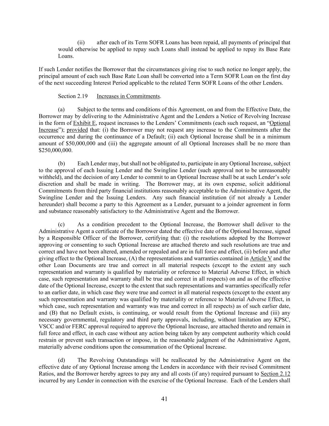 41 (ii) after each of its Term SOFR Loans has been repaid, all payments of principal that would otherwise be applied to repay such Loans shall instead be applied to repay its Base Rate Loans. If such Lender notifies the Borrower that the circumstances giving rise to such notice no longer apply, the principal amount of each such Base Rate Loan shall be converted into a Term SOFR Loan on the first day of the next succeeding Interest Period applicable to the related Term SOFR Loans of the other Lenders. Section 2.19 Increases in Commitments. (a) Subject to the terms and conditions of this Agreement, on and from the Effective Date, the Borrower may by delivering to the Administrative Agent and the Lenders a Notice of Revolving Increase in the form of Exhibit E, request increases to the Lenders’ Commitments (each such request, an “Optional Increase”); provided that: (i) the Borrower may not request any increase to the Commitments after the occurrence and during the continuance of a Default; (ii) each Optional Increase shall be in a minimum amount of $50,000,000 and (iii) the aggregate amount of all Optional Increases shall be no more than $250,000,000. (b) Each Lender may, but shall not be obligated to, participate in any Optional Increase, subject to the approval of each Issuing Lender and the Swingline Lender (such approval not to be unreasonably withheld), and the decision of any Lender to commit to an Optional Increase shall be at such Lender’s sole discretion and shall be made in writing. The Borrower may, at its own expense, solicit additional Commitments from third party financial institutions reasonably acceptable to the Administrative Agent, the Swingline Lender and the Issuing Lenders. Any such financial institution (if not already a Lender hereunder) shall become a party to this Agreement as a Lender, pursuant to a joinder agreement in form and substance reasonably satisfactory to the Administrative Agent and the Borrower. (c) As a condition precedent to the Optional Increase, the Borrower shall deliver to the Administrative Agent a certificate of the Borrower dated the effective date of the Optional Increase, signed by a Responsible Officer of the Borrower, certifying that: (i) the resolutions adopted by the Borrower approving or consenting to such Optional Increase are attached thereto and such resolutions are true and correct and have not been altered, amended or repealed and are in full force and effect, (ii) before and after giving effect to the Optional Increase, (A) the representations and warranties contained in Article V and the other Loan Documents are true and correct in all material respects (except to the extent any such representation and warranty is qualified by materiality or reference to Material Adverse Effect, in which case, such representation and warranty shall be true and correct in all respects) on and as of the effective date of the Optional Increase, except to the extent that such representations and warranties specifically refer to an earlier date, in which case they were true and correct in all material respects (except to the extent any such representation and warranty was qualified by materiality or reference to Material Adverse Effect, in which case, such representation and warranty was true and correct in all respects) as of such earlier date, and (B) that no Default exists, is continuing, or would result from the Optional Increase and (iii) any necessary governmental, regulatory and third party approvals, including, without limitation any KPSC, VSCC and/or FERC approval required to approve the Optional Increase, are attached thereto and remain in full force and effect, in each case without any action being taken by any competent authority which could restrain or prevent such transaction or impose, in the reasonable judgment of the Administrative Agent, materially adverse conditions upon the consummation of the Optional Increase. (d) The Revolving Outstandings will be reallocated by the Administrative Agent on the effective date of any Optional Increase among the Lenders in accordance with their revised Commitment Ratios, and the Borrower hereby agrees to pay any and all costs (if any) required pursuant to Section 2.12 incurred by any Lender in connection with the exercise of the Optional Increase. Each of the Lenders shall