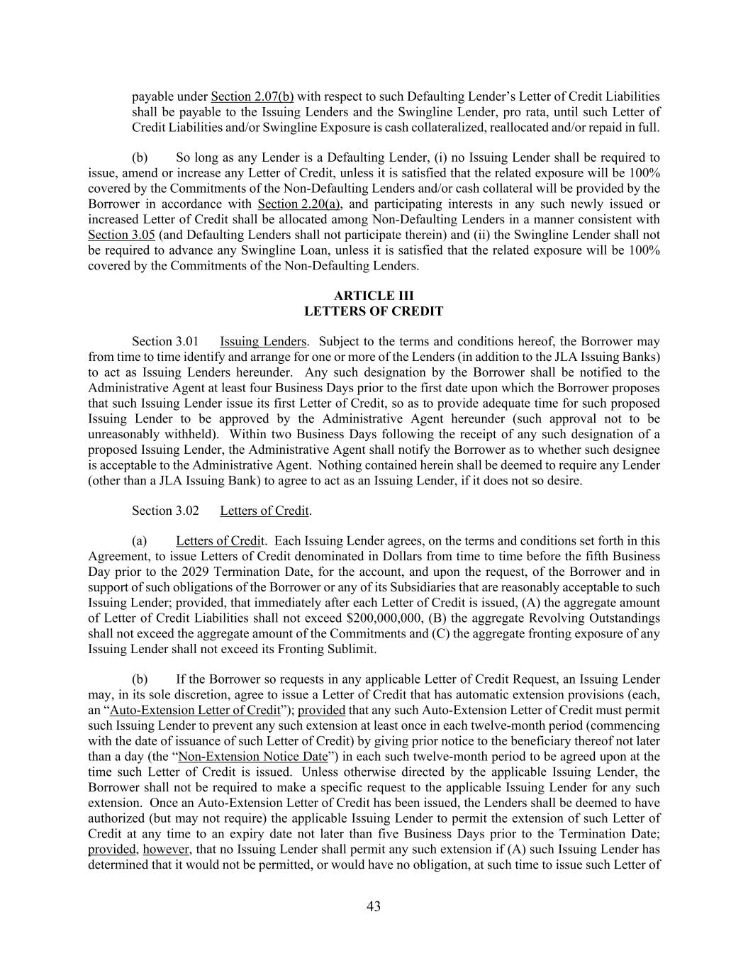 43 payable under Section 2.07(b) with respect to such Defaulting Lender’s Letter of Credit Liabilities shall be payable to the Issuing Lenders and the Swingline Lender, pro rata, until such Letter of Credit Liabilities and/or Swingline Exposure is cash collateralized, reallocated and/or repaid in full. (b) So long as any Lender is a Defaulting Lender, (i) no Issuing Lender shall be required to issue, amend or increase any Letter of Credit, unless it is satisfied that the related exposure will be 100% covered by the Commitments of the Non-Defaulting Lenders and/or cash collateral will be provided by the Borrower in accordance with Section 2.20(a), and participating interests in any such newly issued or increased Letter of Credit shall be allocated among Non-Defaulting Lenders in a manner consistent with Section 3.05 (and Defaulting Lenders shall not participate therein) and (ii) the Swingline Lender shall not be required to advance any Swingline Loan, unless it is satisfied that the related exposure will be 100% covered by the Commitments of the Non-Defaulting Lenders. ARTICLE III LETTERS OF CREDIT Section 3.01 Issuing Lenders. Subject to the terms and conditions hereof, the Borrower may from time to time identify and arrange for one or more of the Lenders (in addition to the JLA Issuing Banks) to act as Issuing Lenders hereunder. Any such designation by the Borrower shall be notified to the Administrative Agent at least four Business Days prior to the first date upon which the Borrower proposes that such Issuing Lender issue its first Letter of Credit, so as to provide adequate time for such proposed Issuing Lender to be approved by the Administrative Agent hereunder (such approval not to be unreasonably withheld). Within two Business Days following the receipt of any such designation of a proposed Issuing Lender, the Administrative Agent shall notify the Borrower as to whether such designee is acceptable to the Administrative Agent. Nothing contained herein shall be deemed to require any Lender (other than a JLA Issuing Bank) to agree to act as an Issuing Lender, if it does not so desire. Section 3.02 Letters of Credit. (a) Letters of Credit. Each Issuing Lender agrees, on the terms and conditions set forth in this Agreement, to issue Letters of Credit denominated in Dollars from time to time before the fifth Business Day prior to the 2029 Termination Date, for the account, and upon the request, of the Borrower and in support of such obligations of the Borrower or any of its Subsidiaries that are reasonably acceptable to such Issuing Lender; provided, that immediately after each Letter of Credit is issued, (A) the aggregate amount of Letter of Credit Liabilities shall not exceed $200,000,000, (B) the aggregate Revolving Outstandings shall not exceed the aggregate amount of the Commitments and (C) the aggregate fronting exposure of any Issuing Lender shall not exceed its Fronting Sublimit. (b) If the Borrower so requests in any applicable Letter of Credit Request, an Issuing Lender may, in its sole discretion, agree to issue a Letter of Credit that has automatic extension provisions (each, an “Auto-Extension Letter of Credit”); provided that any such Auto-Extension Letter of Credit must permit such Issuing Lender to prevent any such extension at least once in each twelve-month period (commencing with the date of issuance of such Letter of Credit) by giving prior notice to the beneficiary thereof not later than a day (the “Non-Extension Notice Date”) in each such twelve-month period to be agreed upon at the time such Letter of Credit is issued. Unless otherwise directed by the applicable Issuing Lender, the Borrower shall not be required to make a specific request to the applicable Issuing Lender for any such extension. Once an Auto-Extension Letter of Credit has been issued, the Lenders shall be deemed to have authorized (but may not require) the applicable Issuing Lender to permit the extension of such Letter of Credit at any time to an expiry date not later than five Business Days prior to the Termination Date; provided, however, that no Issuing Lender shall permit any such extension if (A) such Issuing Lender has determined that it would not be permitted, or would have no obligation, at such time to issue such Letter of