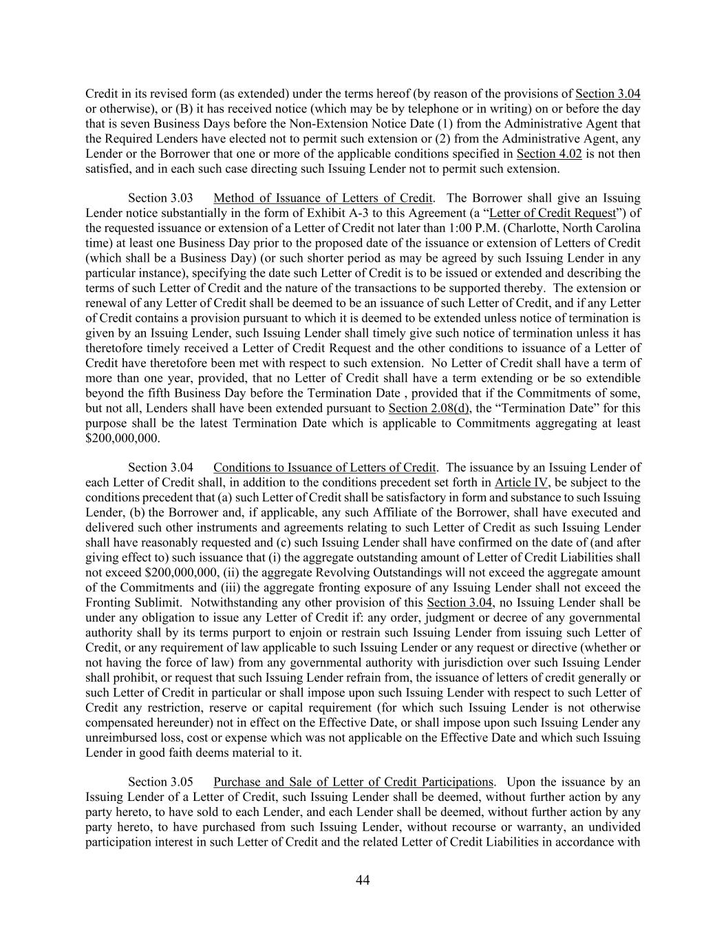44 Credit in its revised form (as extended) under the terms hereof (by reason of the provisions of Section 3.04 or otherwise), or (B) it has received notice (which may be by telephone or in writing) on or before the day that is seven Business Days before the Non-Extension Notice Date (1) from the Administrative Agent that the Required Lenders have elected not to permit such extension or (2) from the Administrative Agent, any Lender or the Borrower that one or more of the applicable conditions specified in Section 4.02 is not then satisfied, and in each such case directing such Issuing Lender not to permit such extension. Section 3.03 Method of Issuance of Letters of Credit. The Borrower shall give an Issuing Lender notice substantially in the form of Exhibit A-3 to this Agreement (a “Letter of Credit Request”) of the requested issuance or extension of a Letter of Credit not later than 1:00 P.M. (Charlotte, North Carolina time) at least one Business Day prior to the proposed date of the issuance or extension of Letters of Credit (which shall be a Business Day) (or such shorter period as may be agreed by such Issuing Lender in any particular instance), specifying the date such Letter of Credit is to be issued or extended and describing the terms of such Letter of Credit and the nature of the transactions to be supported thereby. The extension or renewal of any Letter of Credit shall be deemed to be an issuance of such Letter of Credit, and if any Letter of Credit contains a provision pursuant to which it is deemed to be extended unless notice of termination is given by an Issuing Lender, such Issuing Lender shall timely give such notice of termination unless it has theretofore timely received a Letter of Credit Request and the other conditions to issuance of a Letter of Credit have theretofore been met with respect to such extension. No Letter of Credit shall have a term of more than one year, provided, that no Letter of Credit shall have a term extending or be so extendible beyond the fifth Business Day before the Termination Date , provided that if the Commitments of some, but not all, Lenders shall have been extended pursuant to Section 2.08(d), the “Termination Date” for this purpose shall be the latest Termination Date which is applicable to Commitments aggregating at least $200,000,000. Section 3.04 Conditions to Issuance of Letters of Credit. The issuance by an Issuing Lender of each Letter of Credit shall, in addition to the conditions precedent set forth in Article IV, be subject to the conditions precedent that (a) such Letter of Credit shall be satisfactory in form and substance to such Issuing Lender, (b) the Borrower and, if applicable, any such Affiliate of the Borrower, shall have executed and delivered such other instruments and agreements relating to such Letter of Credit as such Issuing Lender shall have reasonably requested and (c) such Issuing Lender shall have confirmed on the date of (and after giving effect to) such issuance that (i) the aggregate outstanding amount of Letter of Credit Liabilities shall not exceed $200,000,000, (ii) the aggregate Revolving Outstandings will not exceed the aggregate amount of the Commitments and (iii) the aggregate fronting exposure of any Issuing Lender shall not exceed the Fronting Sublimit. Notwithstanding any other provision of this Section 3.04, no Issuing Lender shall be under any obligation to issue any Letter of Credit if: any order, judgment or decree of any governmental authority shall by its terms purport to enjoin or restrain such Issuing Lender from issuing such Letter of Credit, or any requirement of law applicable to such Issuing Lender or any request or directive (whether or not having the force of law) from any governmental authority with jurisdiction over such Issuing Lender shall prohibit, or request that such Issuing Lender refrain from, the issuance of letters of credit generally or such Letter of Credit in particular or shall impose upon such Issuing Lender with respect to such Letter of Credit any restriction, reserve or capital requirement (for which such Issuing Lender is not otherwise compensated hereunder) not in effect on the Effective Date, or shall impose upon such Issuing Lender any unreimbursed loss, cost or expense which was not applicable on the Effective Date and which such Issuing Lender in good faith deems material to it. Section 3.05 Purchase and Sale of Letter of Credit Participations. Upon the issuance by an Issuing Lender of a Letter of Credit, such Issuing Lender shall be deemed, without further action by any party hereto, to have sold to each Lender, and each Lender shall be deemed, without further action by any party hereto, to have purchased from such Issuing Lender, without recourse or warranty, an undivided participation interest in such Letter of Credit and the related Letter of Credit Liabilities in accordance with