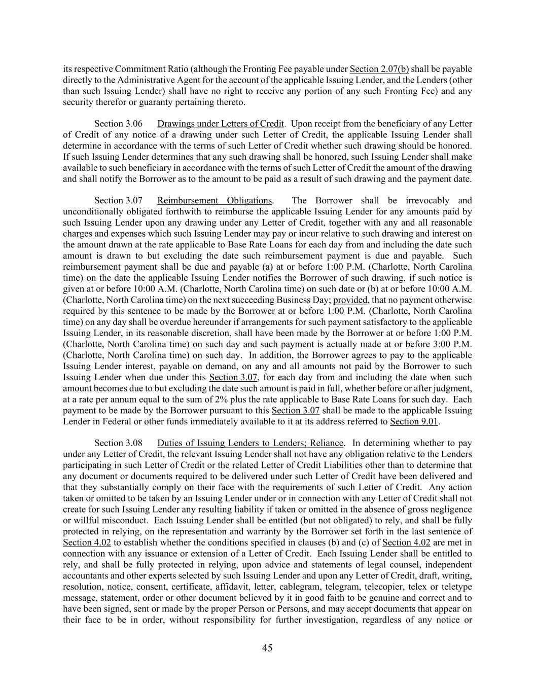 45 its respective Commitment Ratio (although the Fronting Fee payable under Section 2.07(b) shall be payable directly to the Administrative Agent for the account of the applicable Issuing Lender, and the Lenders (other than such Issuing Lender) shall have no right to receive any portion of any such Fronting Fee) and any security therefor or guaranty pertaining thereto. Section 3.06 Drawings under Letters of Credit. Upon receipt from the beneficiary of any Letter of Credit of any notice of a drawing under such Letter of Credit, the applicable Issuing Lender shall determine in accordance with the terms of such Letter of Credit whether such drawing should be honored. If such Issuing Lender determines that any such drawing shall be honored, such Issuing Lender shall make available to such beneficiary in accordance with the terms of such Letter of Credit the amount of the drawing and shall notify the Borrower as to the amount to be paid as a result of such drawing and the payment date. Section 3.07 Reimbursement Obligations. The Borrower shall be irrevocably and unconditionally obligated forthwith to reimburse the applicable Issuing Lender for any amounts paid by such Issuing Lender upon any drawing under any Letter of Credit, together with any and all reasonable charges and expenses which such Issuing Lender may pay or incur relative to such drawing and interest on the amount drawn at the rate applicable to Base Rate Loans for each day from and including the date such amount is drawn to but excluding the date such reimbursement payment is due and payable. Such reimbursement payment shall be due and payable (a) at or before 1:00 P.M. (Charlotte, North Carolina time) on the date the applicable Issuing Lender notifies the Borrower of such drawing, if such notice is given at or before 10:00 A.M. (Charlotte, North Carolina time) on such date or (b) at or before 10:00 A.M. (Charlotte, North Carolina time) on the next succeeding Business Day; provided, that no payment otherwise required by this sentence to be made by the Borrower at or before 1:00 P.M. (Charlotte, North Carolina time) on any day shall be overdue hereunder if arrangements for such payment satisfactory to the applicable Issuing Lender, in its reasonable discretion, shall have been made by the Borrower at or before 1:00 P.M. (Charlotte, North Carolina time) on such day and such payment is actually made at or before 3:00 P.M. (Charlotte, North Carolina time) on such day. In addition, the Borrower agrees to pay to the applicable Issuing Lender interest, payable on demand, on any and all amounts not paid by the Borrower to such Issuing Lender when due under this Section 3.07, for each day from and including the date when such amount becomes due to but excluding the date such amount is paid in full, whether before or after judgment, at a rate per annum equal to the sum of 2% plus the rate applicable to Base Rate Loans for such day. Each payment to be made by the Borrower pursuant to this Section 3.07 shall be made to the applicable Issuing Lender in Federal or other funds immediately available to it at its address referred to Section 9.01. Section 3.08 Duties of Issuing Lenders to Lenders; Reliance. In determining whether to pay under any Letter of Credit, the relevant Issuing Lender shall not have any obligation relative to the Lenders participating in such Letter of Credit or the related Letter of Credit Liabilities other than to determine that any document or documents required to be delivered under such Letter of Credit have been delivered and that they substantially comply on their face with the requirements of such Letter of Credit. Any action taken or omitted to be taken by an Issuing Lender under or in connection with any Letter of Credit shall not create for such Issuing Lender any resulting liability if taken or omitted in the absence of gross negligence or willful misconduct. Each Issuing Lender shall be entitled (but not obligated) to rely, and shall be fully protected in relying, on the representation and warranty by the Borrower set forth in the last sentence of Section 4.02 to establish whether the conditions specified in clauses (b) and (c) of Section 4.02 are met in connection with any issuance or extension of a Letter of Credit. Each Issuing Lender shall be entitled to rely, and shall be fully protected in relying, upon advice and statements of legal counsel, independent accountants and other experts selected by such Issuing Lender and upon any Letter of Credit, draft, writing, resolution, notice, consent, certificate, affidavit, letter, cablegram, telegram, telecopier, telex or teletype message, statement, order or other document believed by it in good faith to be genuine and correct and to have been signed, sent or made by the proper Person or Persons, and may accept documents that appear on their face to be in order, without responsibility for further investigation, regardless of any notice or