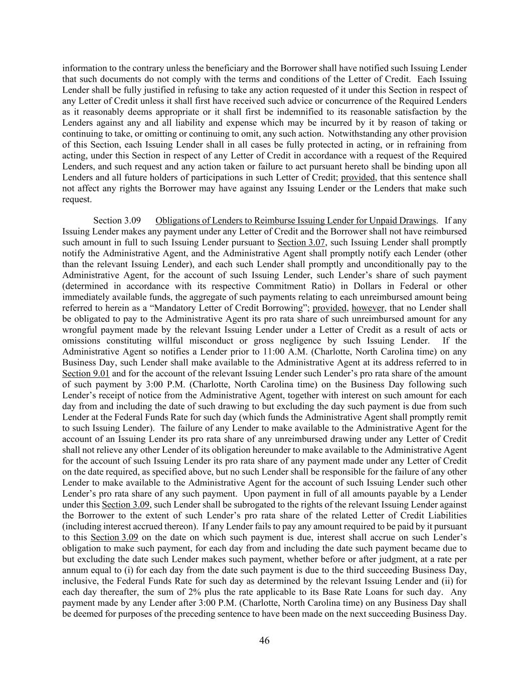 46 information to the contrary unless the beneficiary and the Borrower shall have notified such Issuing Lender that such documents do not comply with the terms and conditions of the Letter of Credit. Each Issuing Lender shall be fully justified in refusing to take any action requested of it under this Section in respect of any Letter of Credit unless it shall first have received such advice or concurrence of the Required Lenders as it reasonably deems appropriate or it shall first be indemnified to its reasonable satisfaction by the Lenders against any and all liability and expense which may be incurred by it by reason of taking or continuing to take, or omitting or continuing to omit, any such action. Notwithstanding any other provision of this Section, each Issuing Lender shall in all cases be fully protected in acting, or in refraining from acting, under this Section in respect of any Letter of Credit in accordance with a request of the Required Lenders, and such request and any action taken or failure to act pursuant hereto shall be binding upon all Lenders and all future holders of participations in such Letter of Credit; provided, that this sentence shall not affect any rights the Borrower may have against any Issuing Lender or the Lenders that make such request. Section 3.09 Obligations of Lenders to Reimburse Issuing Lender for Unpaid Drawings. If any Issuing Lender makes any payment under any Letter of Credit and the Borrower shall not have reimbursed such amount in full to such Issuing Lender pursuant to Section 3.07, such Issuing Lender shall promptly notify the Administrative Agent, and the Administrative Agent shall promptly notify each Lender (other than the relevant Issuing Lender), and each such Lender shall promptly and unconditionally pay to the Administrative Agent, for the account of such Issuing Lender, such Lender’s share of such payment (determined in accordance with its respective Commitment Ratio) in Dollars in Federal or other immediately available funds, the aggregate of such payments relating to each unreimbursed amount being referred to herein as a “Mandatory Letter of Credit Borrowing”; provided, however, that no Lender shall be obligated to pay to the Administrative Agent its pro rata share of such unreimbursed amount for any wrongful payment made by the relevant Issuing Lender under a Letter of Credit as a result of acts or omissions constituting willful misconduct or gross negligence by such Issuing Lender. If the Administrative Agent so notifies a Lender prior to 11:00 A.M. (Charlotte, North Carolina time) on any Business Day, such Lender shall make available to the Administrative Agent at its address referred to in Section 9.01 and for the account of the relevant Issuing Lender such Lender’s pro rata share of the amount of such payment by 3:00 P.M. (Charlotte, North Carolina time) on the Business Day following such Lender’s receipt of notice from the Administrative Agent, together with interest on such amount for each day from and including the date of such drawing to but excluding the day such payment is due from such Lender at the Federal Funds Rate for such day (which funds the Administrative Agent shall promptly remit to such Issuing Lender). The failure of any Lender to make available to the Administrative Agent for the account of an Issuing Lender its pro rata share of any unreimbursed drawing under any Letter of Credit shall not relieve any other Lender of its obligation hereunder to make available to the Administrative Agent for the account of such Issuing Lender its pro rata share of any payment made under any Letter of Credit on the date required, as specified above, but no such Lender shall be responsible for the failure of any other Lender to make available to the Administrative Agent for the account of such Issuing Lender such other Lender’s pro rata share of any such payment. Upon payment in full of all amounts payable by a Lender under this Section 3.09, such Lender shall be subrogated to the rights of the relevant Issuing Lender against the Borrower to the extent of such Lender’s pro rata share of the related Letter of Credit Liabilities (including interest accrued thereon). If any Lender fails to pay any amount required to be paid by it pursuant to this Section 3.09 on the date on which such payment is due, interest shall accrue on such Lender’s obligation to make such payment, for each day from and including the date such payment became due to but excluding the date such Lender makes such payment, whether before or after judgment, at a rate per annum equal to (i) for each day from the date such payment is due to the third succeeding Business Day, inclusive, the Federal Funds Rate for such day as determined by the relevant Issuing Lender and (ii) for each day thereafter, the sum of 2% plus the rate applicable to its Base Rate Loans for such day. Any payment made by any Lender after 3:00 P.M. (Charlotte, North Carolina time) on any Business Day shall be deemed for purposes of the preceding sentence to have been made on the next succeeding Business Day.