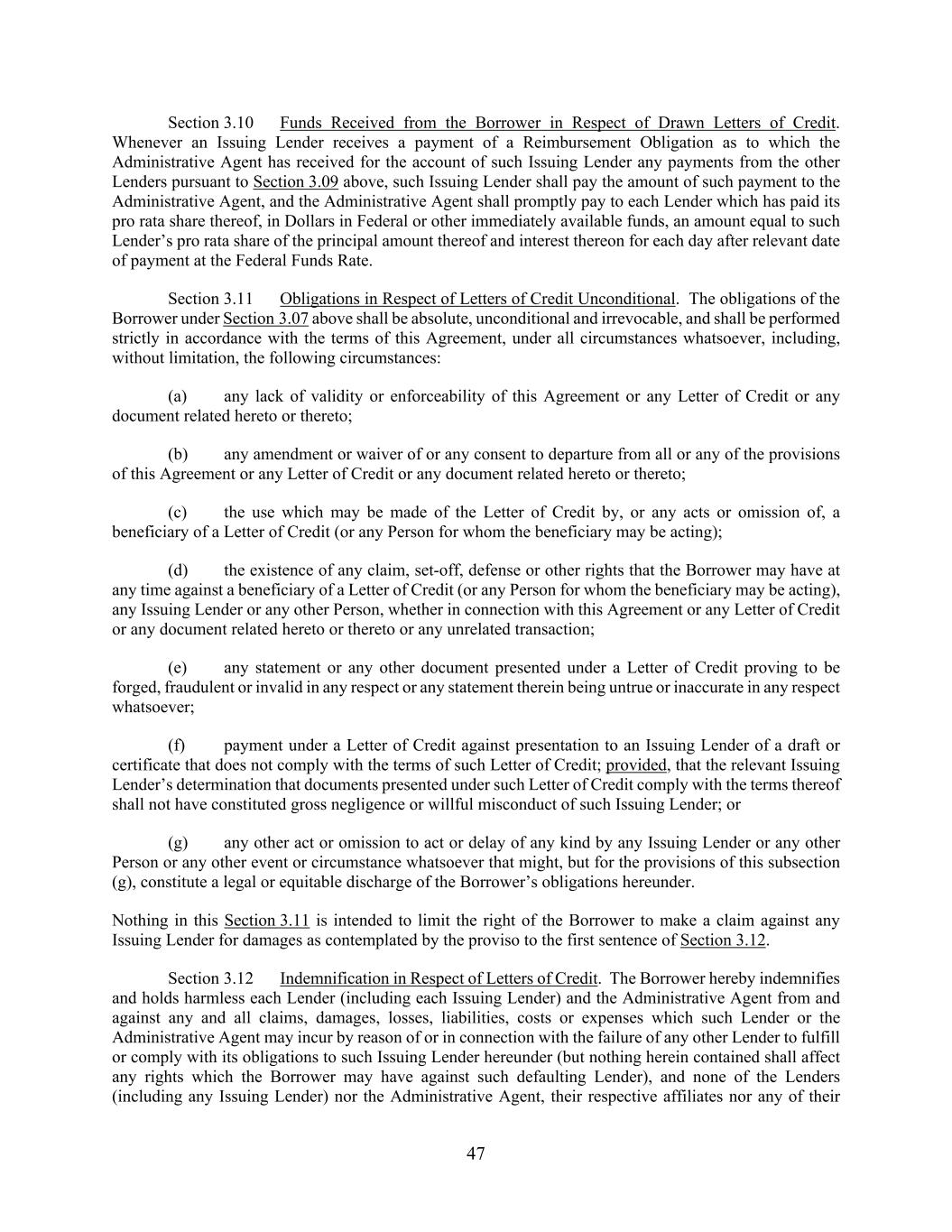 47 Section 3.10 Funds Received from the Borrower in Respect of Drawn Letters of Credit. Whenever an Issuing Lender receives a payment of a Reimbursement Obligation as to which the Administrative Agent has received for the account of such Issuing Lender any payments from the other Lenders pursuant to Section 3.09 above, such Issuing Lender shall pay the amount of such payment to the Administrative Agent, and the Administrative Agent shall promptly pay to each Lender which has paid its pro rata share thereof, in Dollars in Federal or other immediately available funds, an amount equal to such Lender’s pro rata share of the principal amount thereof and interest thereon for each day after relevant date of payment at the Federal Funds Rate. Section 3.11 Obligations in Respect of Letters of Credit Unconditional. The obligations of the Borrower under Section 3.07 above shall be absolute, unconditional and irrevocable, and shall be performed strictly in accordance with the terms of this Agreement, under all circumstances whatsoever, including, without limitation, the following circumstances: (a) any lack of validity or enforceability of this Agreement or any Letter of Credit or any document related hereto or thereto; (b) any amendment or waiver of or any consent to departure from all or any of the provisions of this Agreement or any Letter of Credit or any document related hereto or thereto; (c) the use which may be made of the Letter of Credit by, or any acts or omission of, a beneficiary of a Letter of Credit (or any Person for whom the beneficiary may be acting); (d) the existence of any claim, set-off, defense or other rights that the Borrower may have at any time against a beneficiary of a Letter of Credit (or any Person for whom the beneficiary may be acting), any Issuing Lender or any other Person, whether in connection with this Agreement or any Letter of Credit or any document related hereto or thereto or any unrelated transaction; (e) any statement or any other document presented under a Letter of Credit proving to be forged, fraudulent or invalid in any respect or any statement therein being untrue or inaccurate in any respect whatsoever; (f) payment under a Letter of Credit against presentation to an Issuing Lender of a draft or certificate that does not comply with the terms of such Letter of Credit; provided, that the relevant Issuing Lender’s determination that documents presented under such Letter of Credit comply with the terms thereof shall not have constituted gross negligence or willful misconduct of such Issuing Lender; or (g) any other act or omission to act or delay of any kind by any Issuing Lender or any other Person or any other event or circumstance whatsoever that might, but for the provisions of this subsection (g), constitute a legal or equitable discharge of the Borrower’s obligations hereunder. Nothing in this Section 3.11 is intended to limit the right of the Borrower to make a claim against any Issuing Lender for damages as contemplated by the proviso to the first sentence of Section 3.12. Section 3.12 Indemnification in Respect of Letters of Credit. The Borrower hereby indemnifies and holds harmless each Lender (including each Issuing Lender) and the Administrative Agent from and against any and all claims, damages, losses, liabilities, costs or expenses which such Lender or the Administrative Agent may incur by reason of or in connection with the failure of any other Lender to fulfill or comply with its obligations to such Issuing Lender hereunder (but nothing herein contained shall affect any rights which the Borrower may have against such defaulting Lender), and none of the Lenders (including any Issuing Lender) nor the Administrative Agent, their respective affiliates nor any of their
