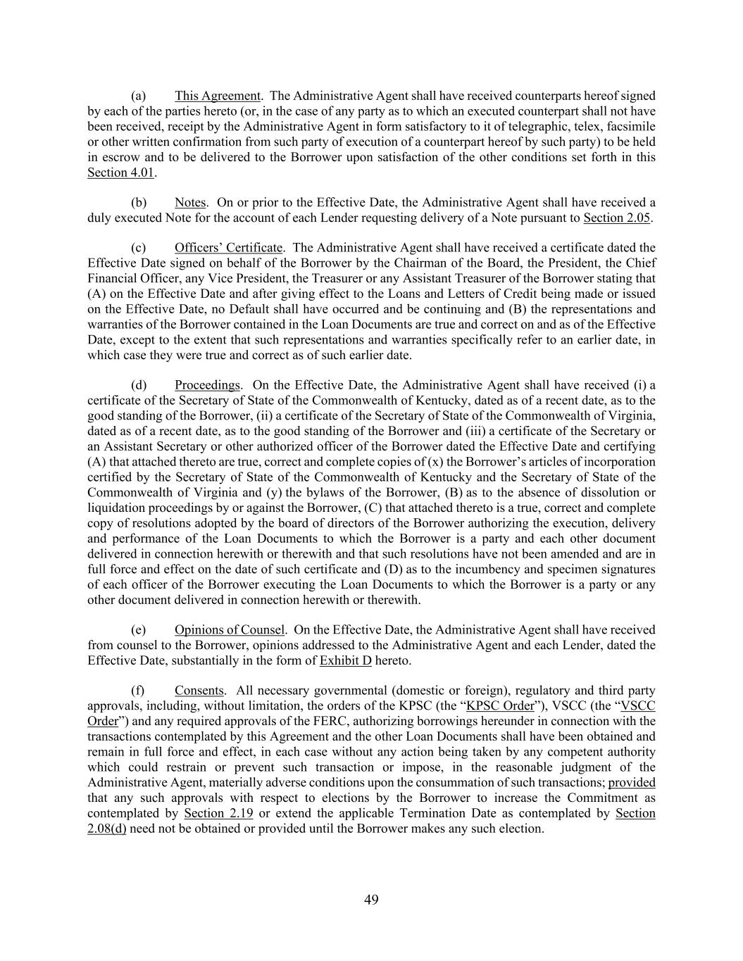 49 (a) This Agreement. The Administrative Agent shall have received counterparts hereof signed by each of the parties hereto (or, in the case of any party as to which an executed counterpart shall not have been received, receipt by the Administrative Agent in form satisfactory to it of telegraphic, telex, facsimile or other written confirmation from such party of execution of a counterpart hereof by such party) to be held in escrow and to be delivered to the Borrower upon satisfaction of the other conditions set forth in this Section 4.01. (b) Notes. On or prior to the Effective Date, the Administrative Agent shall have received a duly executed Note for the account of each Lender requesting delivery of a Note pursuant to Section 2.05. (c) Officers’ Certificate. The Administrative Agent shall have received a certificate dated the Effective Date signed on behalf of the Borrower by the Chairman of the Board, the President, the Chief Financial Officer, any Vice President, the Treasurer or any Assistant Treasurer of the Borrower stating that (A) on the Effective Date and after giving effect to the Loans and Letters of Credit being made or issued on the Effective Date, no Default shall have occurred and be continuing and (B) the representations and warranties of the Borrower contained in the Loan Documents are true and correct on and as of the Effective Date, except to the extent that such representations and warranties specifically refer to an earlier date, in which case they were true and correct as of such earlier date. (d) Proceedings. On the Effective Date, the Administrative Agent shall have received (i) a certificate of the Secretary of State of the Commonwealth of Kentucky, dated as of a recent date, as to the good standing of the Borrower, (ii) a certificate of the Secretary of State of the Commonwealth of Virginia, dated as of a recent date, as to the good standing of the Borrower and (iii) a certificate of the Secretary or an Assistant Secretary or other authorized officer of the Borrower dated the Effective Date and certifying (A) that attached thereto are true, correct and complete copies of (x) the Borrower’s articles of incorporation certified by the Secretary of State of the Commonwealth of Kentucky and the Secretary of State of the Commonwealth of Virginia and (y) the bylaws of the Borrower, (B) as to the absence of dissolution or liquidation proceedings by or against the Borrower, (C) that attached thereto is a true, correct and complete copy of resolutions adopted by the board of directors of the Borrower authorizing the execution, delivery and performance of the Loan Documents to which the Borrower is a party and each other document delivered in connection herewith or therewith and that such resolutions have not been amended and are in full force and effect on the date of such certificate and (D) as to the incumbency and specimen signatures of each officer of the Borrower executing the Loan Documents to which the Borrower is a party or any other document delivered in connection herewith or therewith. (e) Opinions of Counsel. On the Effective Date, the Administrative Agent shall have received from counsel to the Borrower, opinions addressed to the Administrative Agent and each Lender, dated the Effective Date, substantially in the form of Exhibit D hereto. (f) Consents. All necessary governmental (domestic or foreign), regulatory and third party approvals, including, without limitation, the orders of the KPSC (the “KPSC Order”), VSCC (the “VSCC Order”) and any required approvals of the FERC, authorizing borrowings hereunder in connection with the transactions contemplated by this Agreement and the other Loan Documents shall have been obtained and remain in full force and effect, in each case without any action being taken by any competent authority which could restrain or prevent such transaction or impose, in the reasonable judgment of the Administrative Agent, materially adverse conditions upon the consummation of such transactions; provided that any such approvals with respect to elections by the Borrower to increase the Commitment as contemplated by Section 2.19 or extend the applicable Termination Date as contemplated by Section 2.08(d) need not be obtained or provided until the Borrower makes any such election.