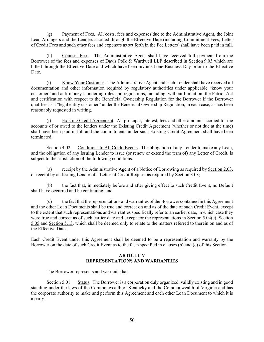 50 (g) Payment of Fees. All costs, fees and expenses due to the Administrative Agent, the Joint Lead Arrangers and the Lenders accrued through the Effective Date (including Commitment Fees, Letter of Credit Fees and such other fees and expenses as set forth in the Fee Letters) shall have been paid in full. (h) Counsel Fees. The Administrative Agent shall have received full payment from the Borrower of the fees and expenses of Davis Polk & Wardwell LLP described in Section 9.03 which are billed through the Effective Date and which have been invoiced one Business Day prior to the Effective Date. (i) Know Your Customer. The Administrative Agent and each Lender shall have received all documentation and other information required by regulatory authorities under applicable “know your customer” and anti-money laundering rules and regulations, including, without limitation, the Patriot Act and certification with respect to the Beneficial Ownership Regulation for the Borrower if the Borrower qualifies as a “legal entity customer” under the Beneficial Ownership Regulation, in each case, as has been reasonably requested in writing. (j) Existing Credit Agreement. All principal, interest, fees and other amounts accrued for the accounts of or owed to the lenders under the Existing Credit Agreement (whether or not due at the time) shall have been paid in full and the commitments under such Existing Credit Agreement shall have been terminated. Section 4.02 Conditions to All Credit Events. The obligation of any Lender to make any Loan, and the obligation of any Issuing Lender to issue (or renew or extend the term of) any Letter of Credit, is subject to the satisfaction of the following conditions: (a) receipt by the Administrative Agent of a Notice of Borrowing as required by Section 2.03, or receipt by an Issuing Lender of a Letter of Credit Request as required by Section 3.03; (b) the fact that, immediately before and after giving effect to such Credit Event, no Default shall have occurred and be continuing; and (c) the fact that the representations and warranties of the Borrower contained in this Agreement and the other Loan Documents shall be true and correct on and as of the date of such Credit Event, except to the extent that such representations and warranties specifically refer to an earlier date, in which case they were true and correct as of such earlier date and except for the representations in Section 5.04(c), Section 5.05 and Section 5.13, which shall be deemed only to relate to the matters referred to therein on and as of the Effective Date. Each Credit Event under this Agreement shall be deemed to be a representation and warranty by the Borrower on the date of such Credit Event as to the facts specified in clauses (b) and (c) of this Section. ARTICLE V REPRESENTATIONS AND WARRANTIES The Borrower represents and warrants that: Section 5.01 Status. The Borrower is a corporation duly organized, validly existing and in good standing under the laws of the Commonwealth of Kentucky and the Commonwealth of Virginia and has the corporate authority to make and perform this Agreement and each other Loan Document to which it is a party.